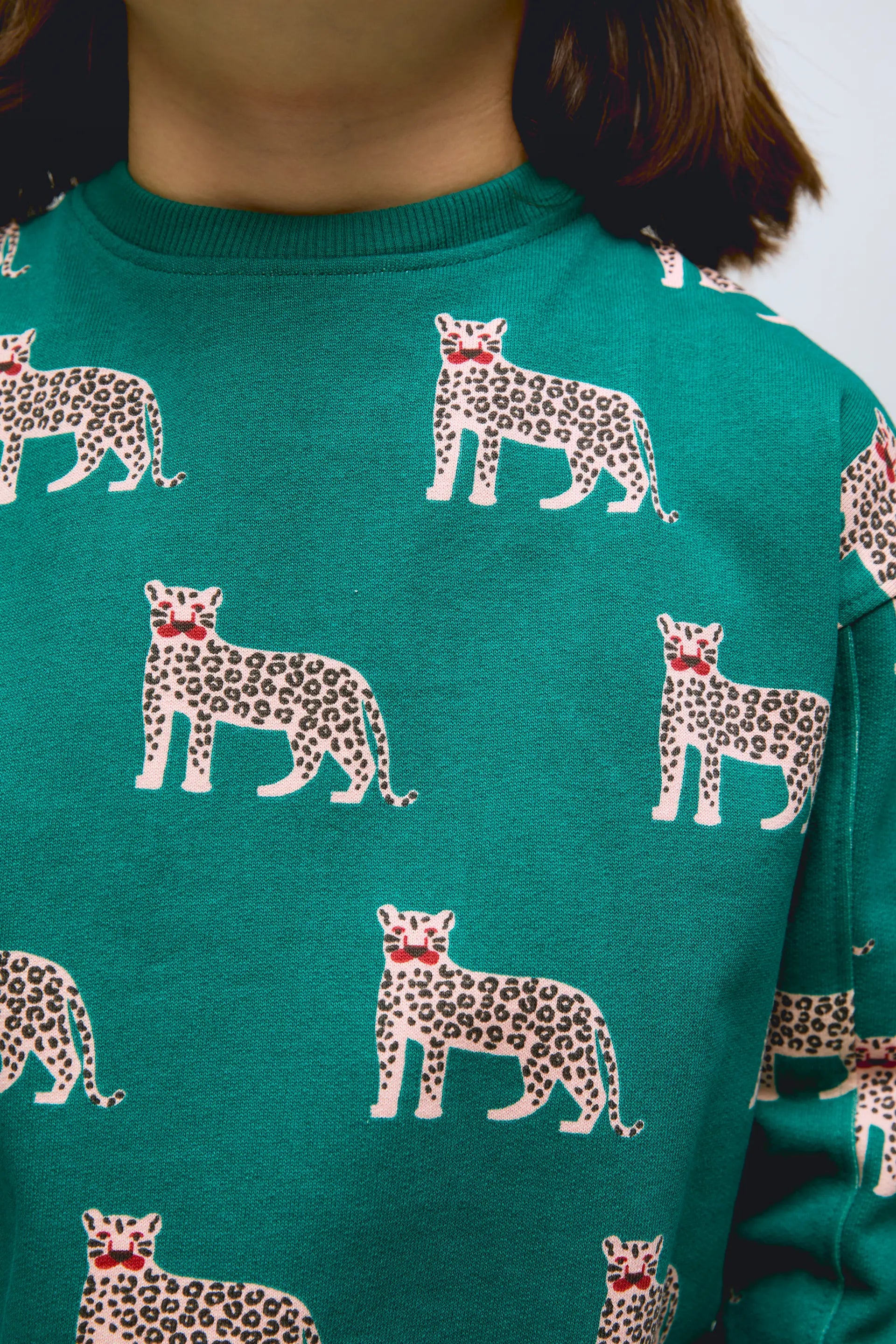 Felpa Onca realizzata in 100% cotone, con stampa di un giaguaro su sfondo turchese. Presenta scollo rotondo e polsini a coste in stile felpa.