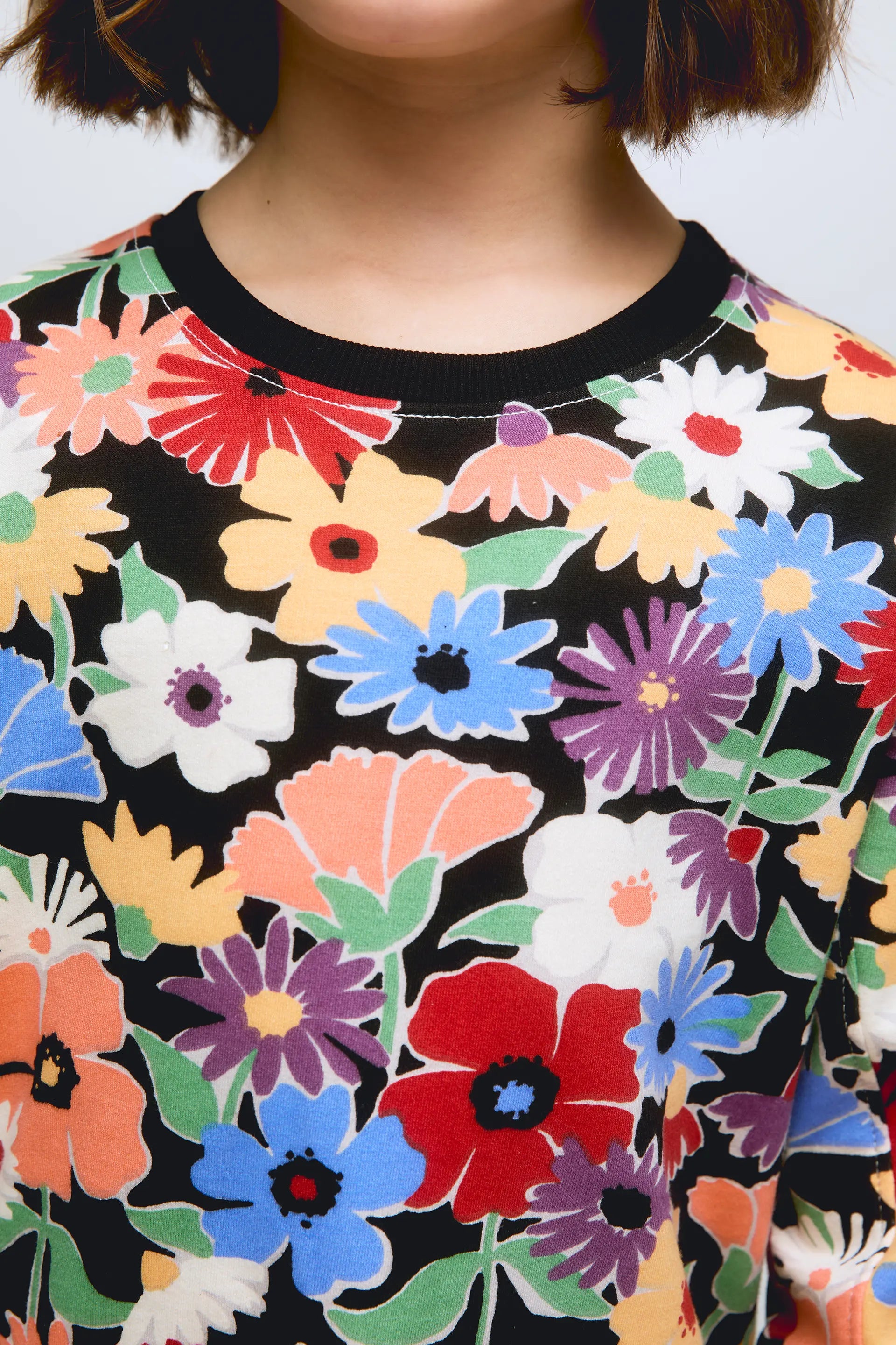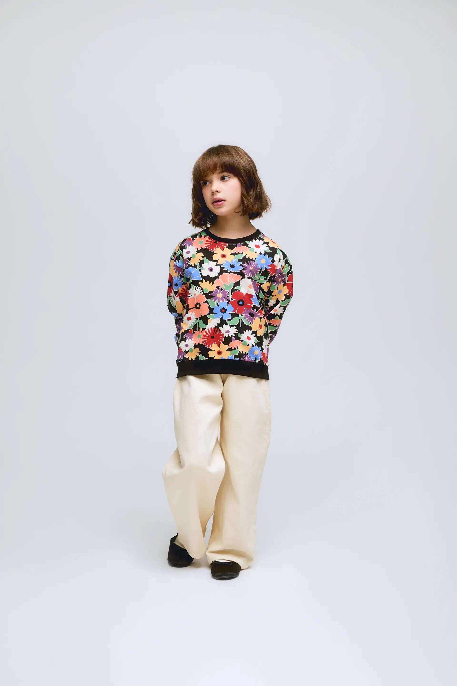 Felpa da bambina in cotone con stampa floreale multicolore, scollo rotondo, polsini e orlo a coste neri.