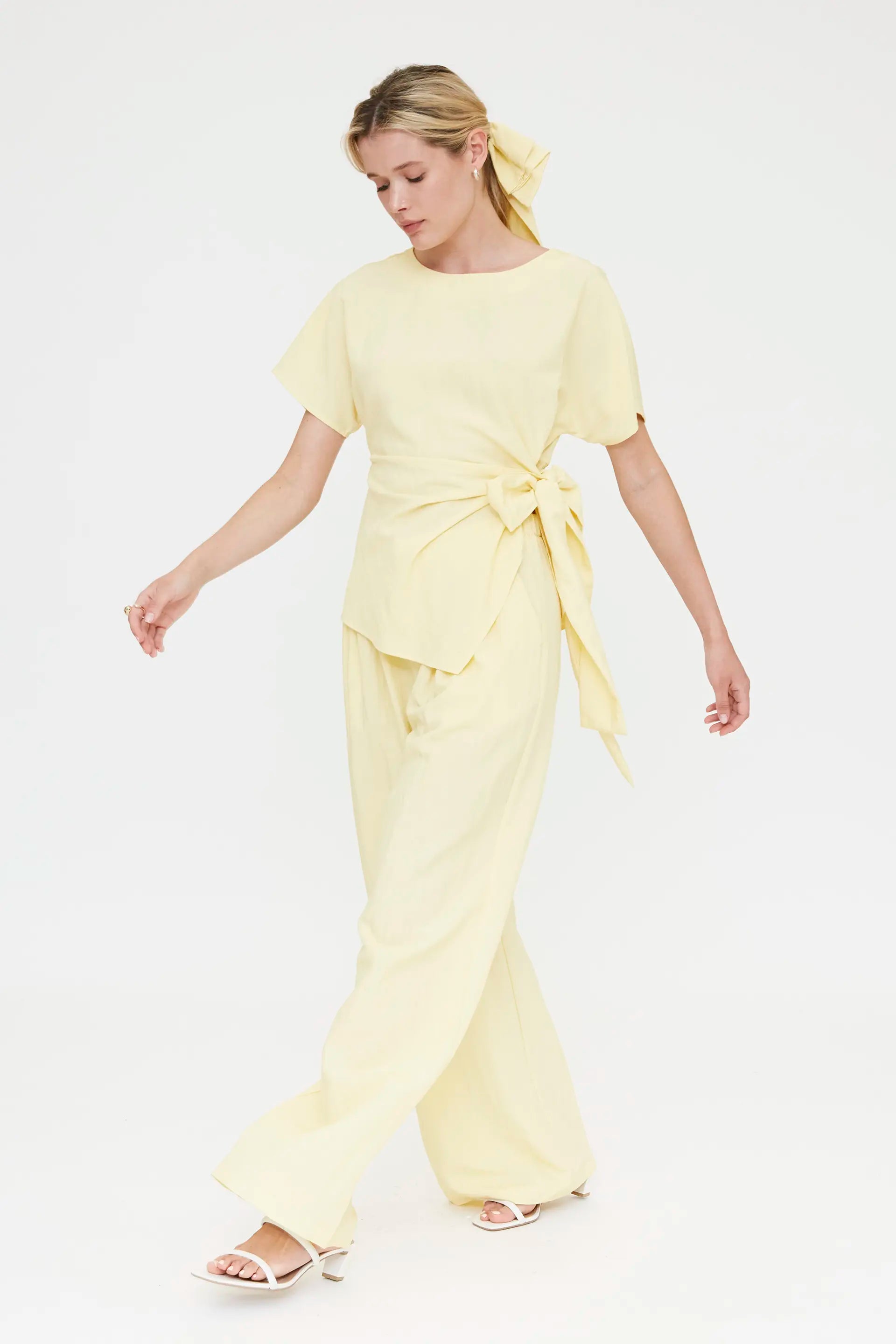 Top in crêpe giallo chiaro. Scollo rotondo e maniche corte. Dettaglio laterale drappeggiato con fiocco. La modella è alta 175 cm e indossa una taglia S.