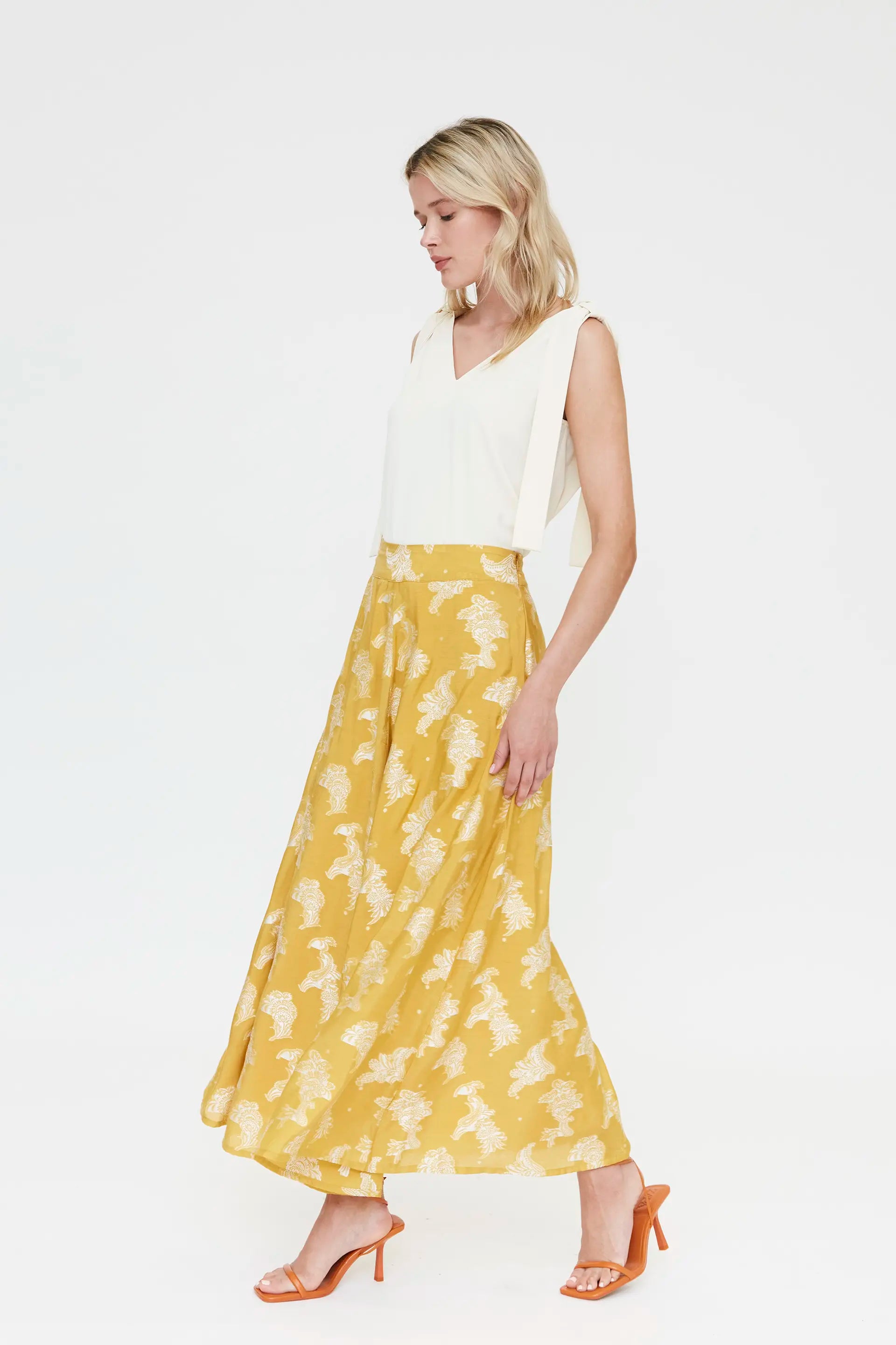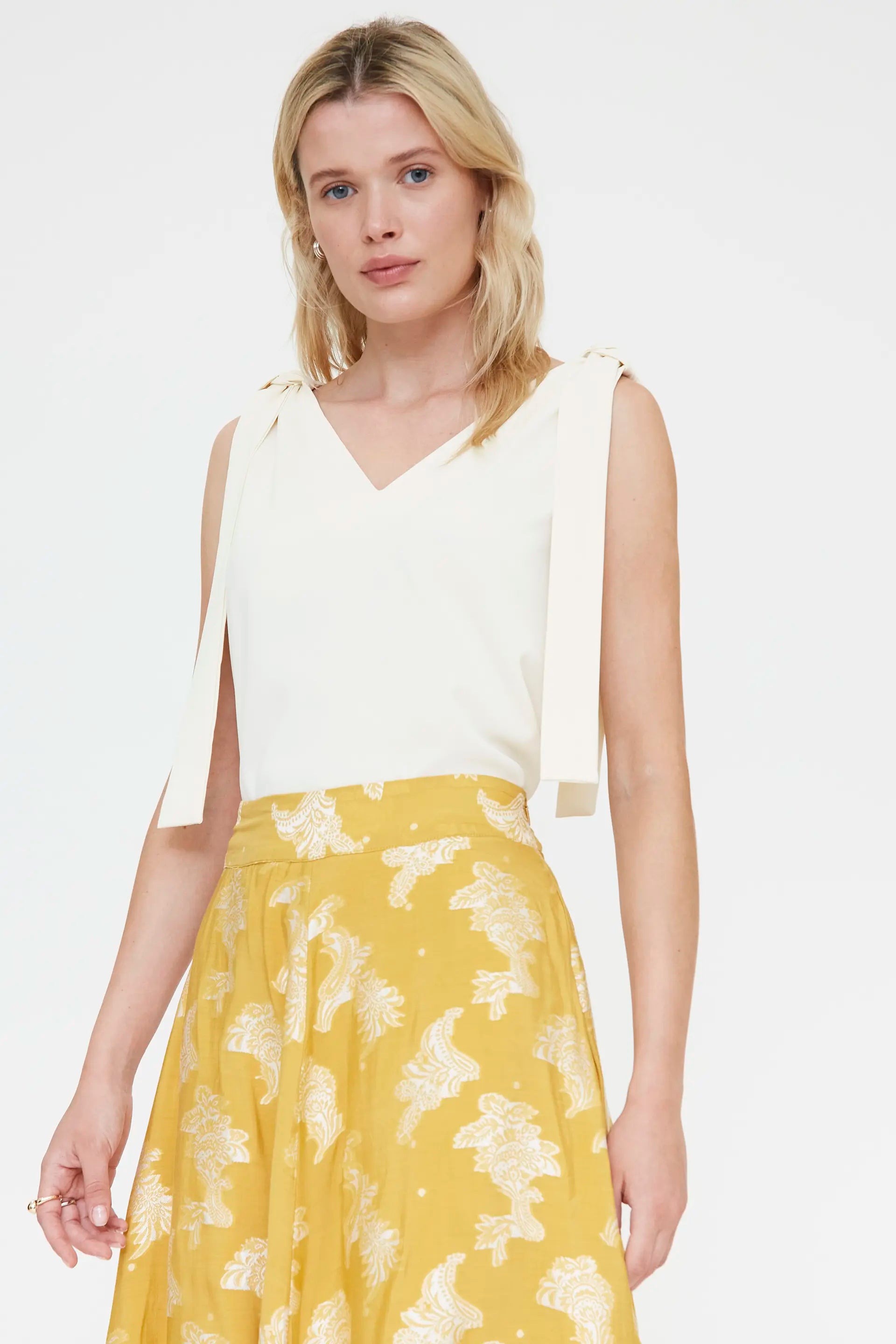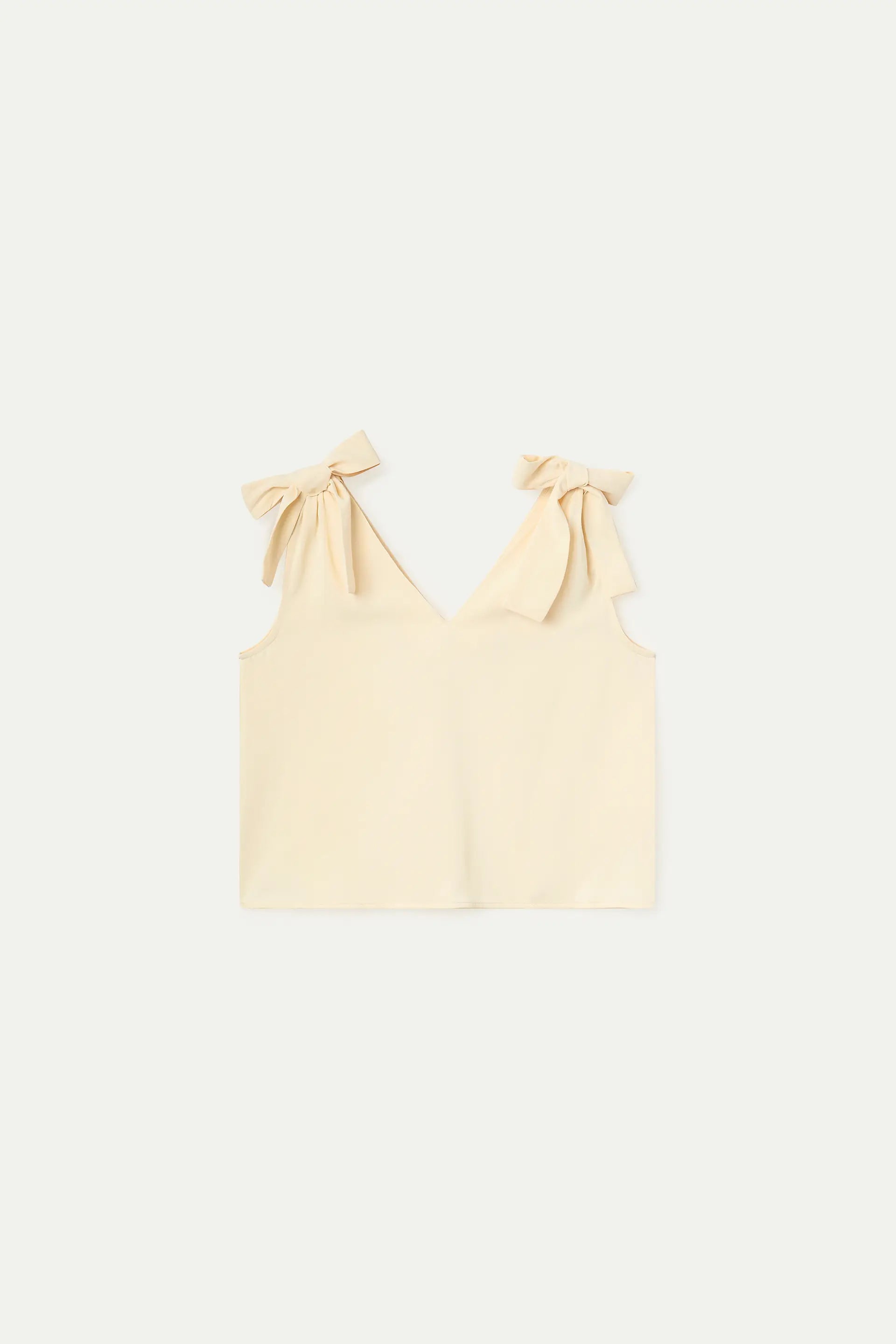 Top in crêpe bianco sporco. Scollo a V con spalline annodate. La modella è alta 175 cm e indossa una taglia S.