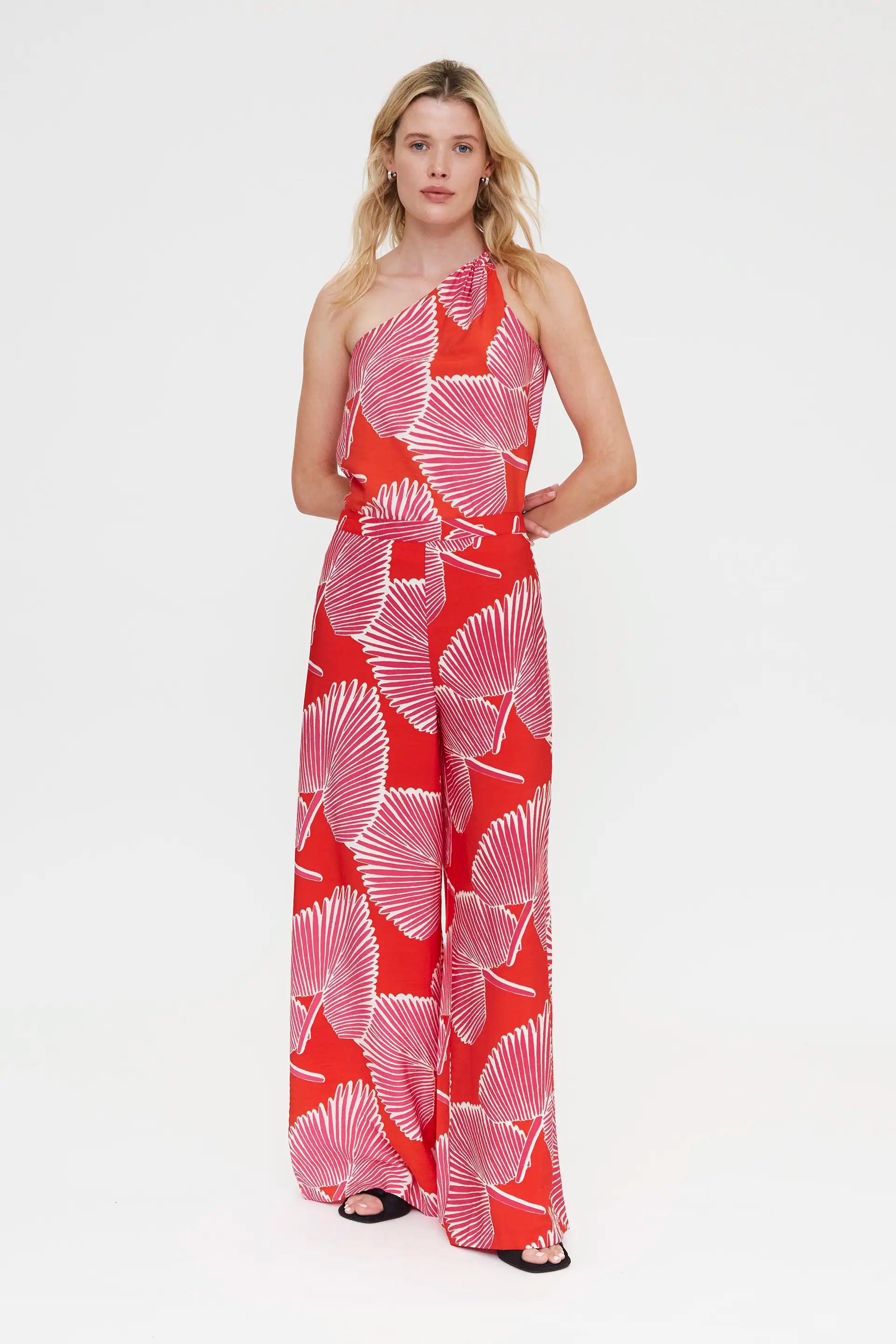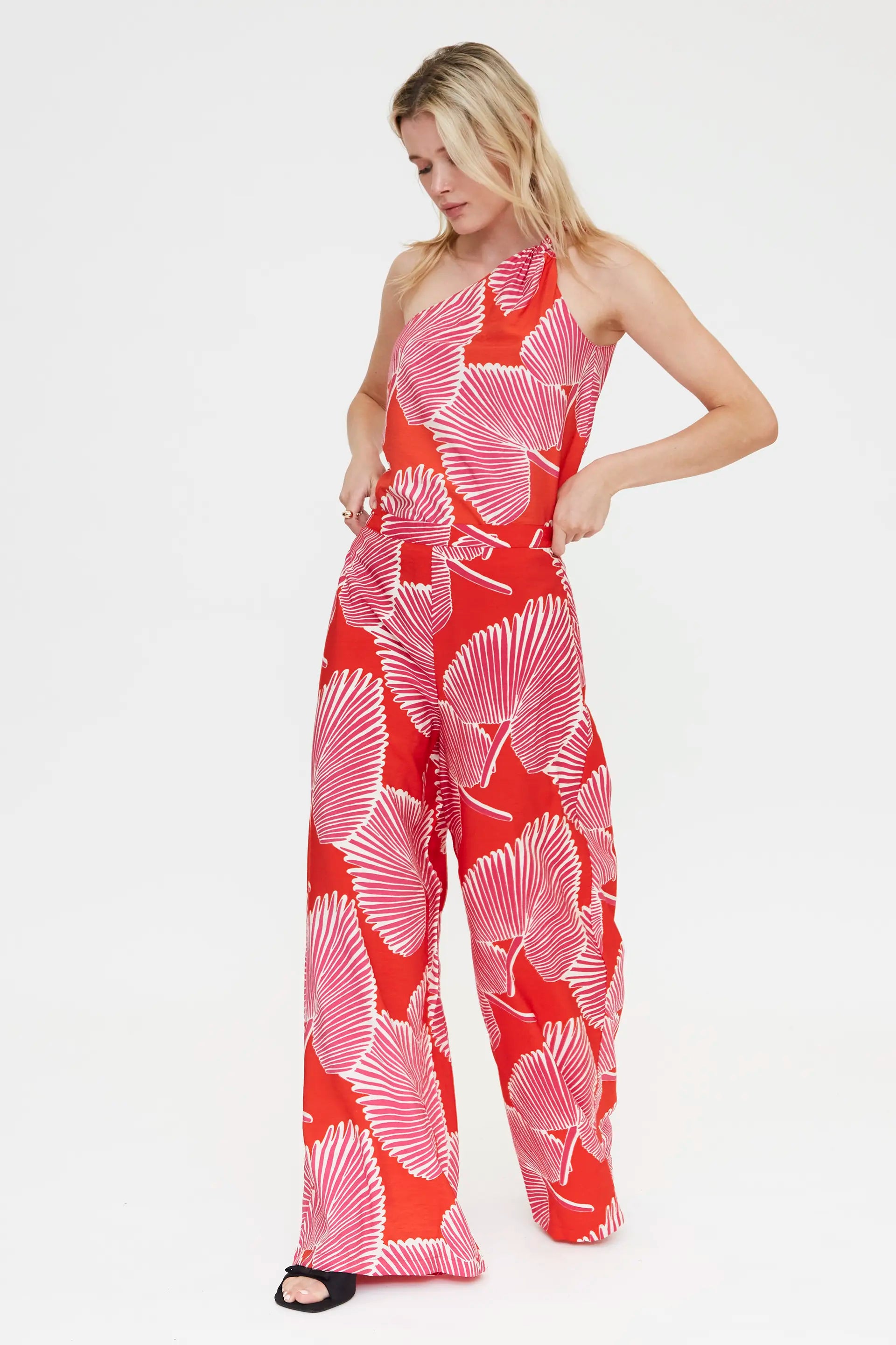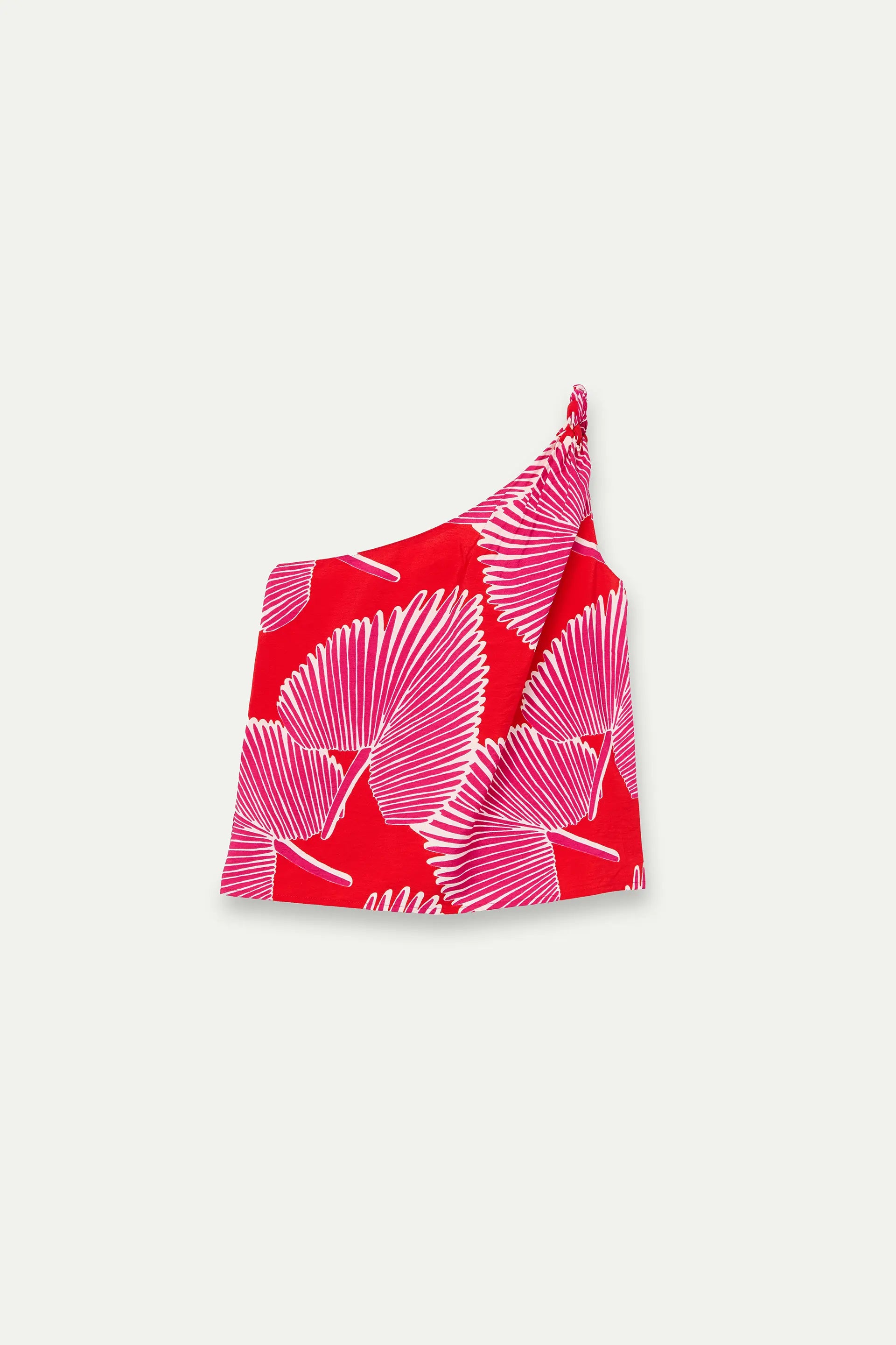 Top in crêpe con stampa di palme. Taglio asimmetrico con dettaglio annodato. La modella è alta 175 cm e indossa una taglia S.