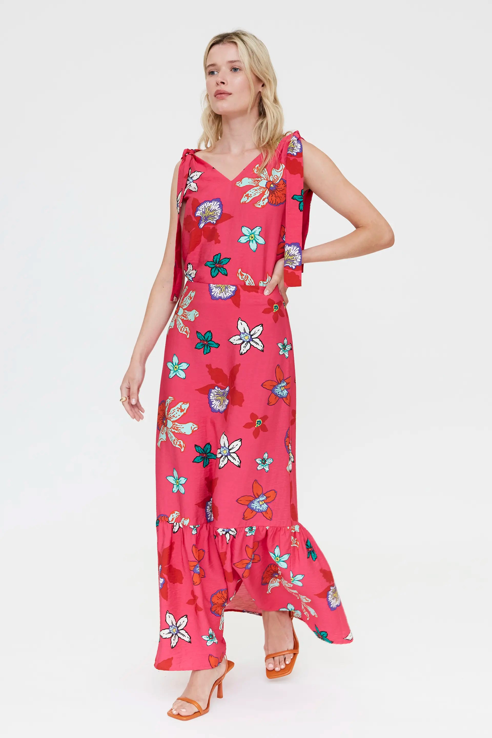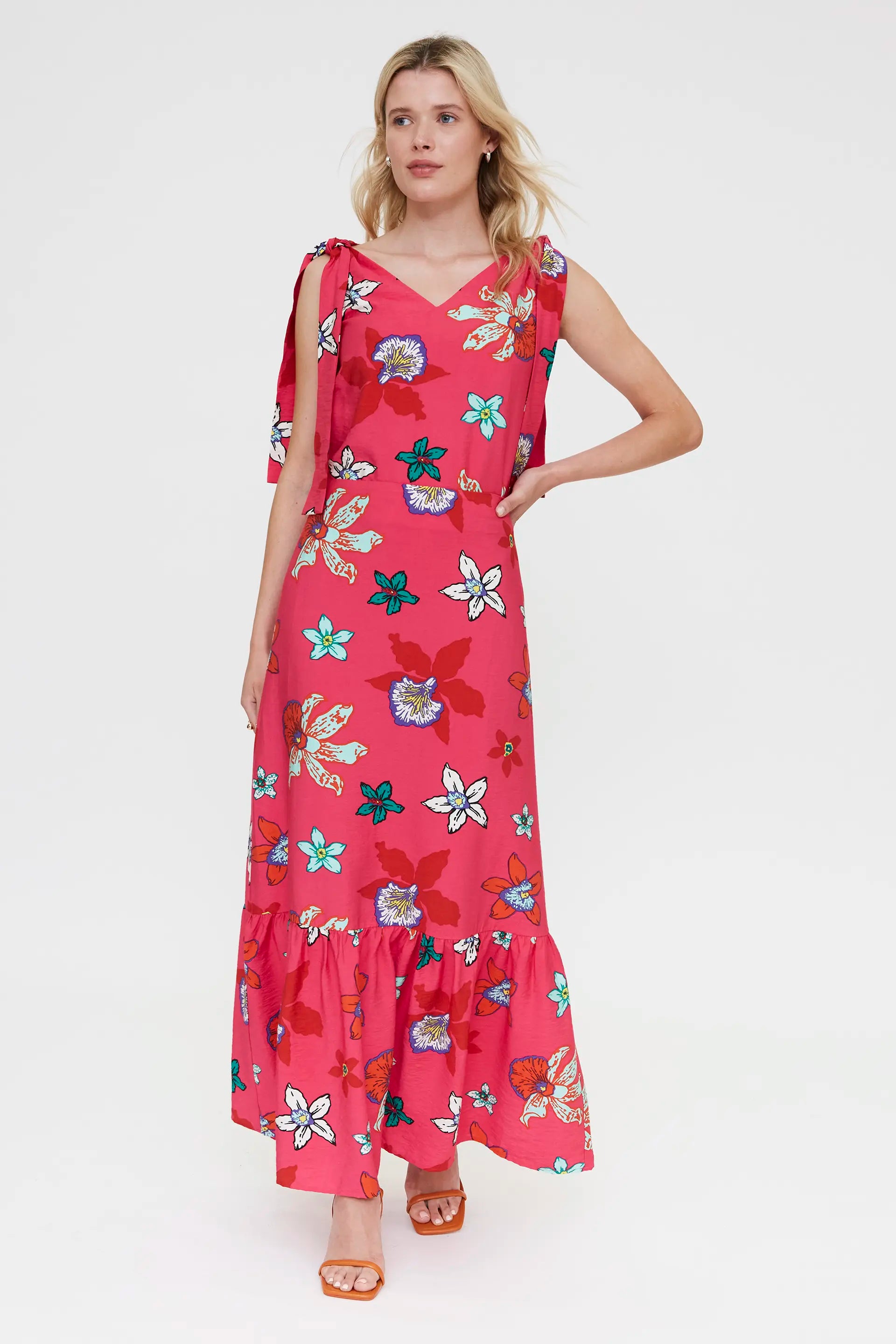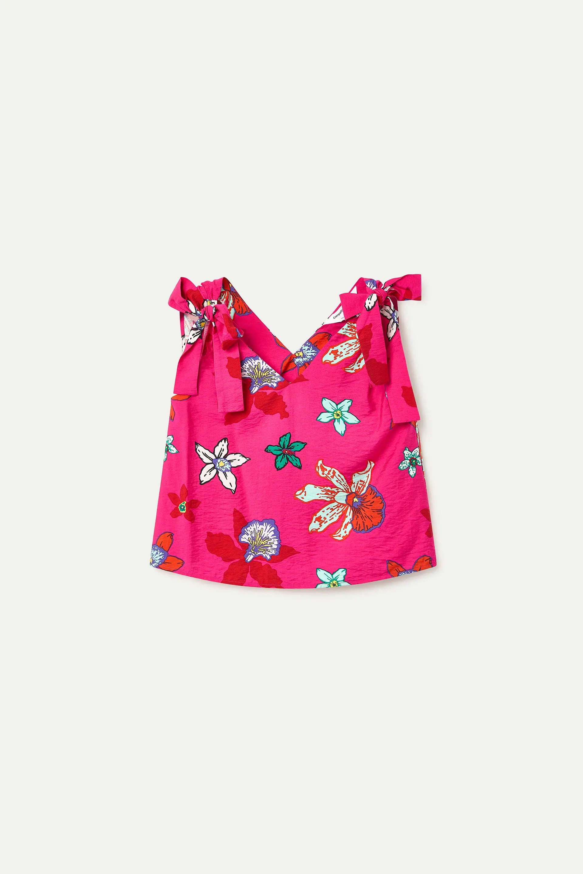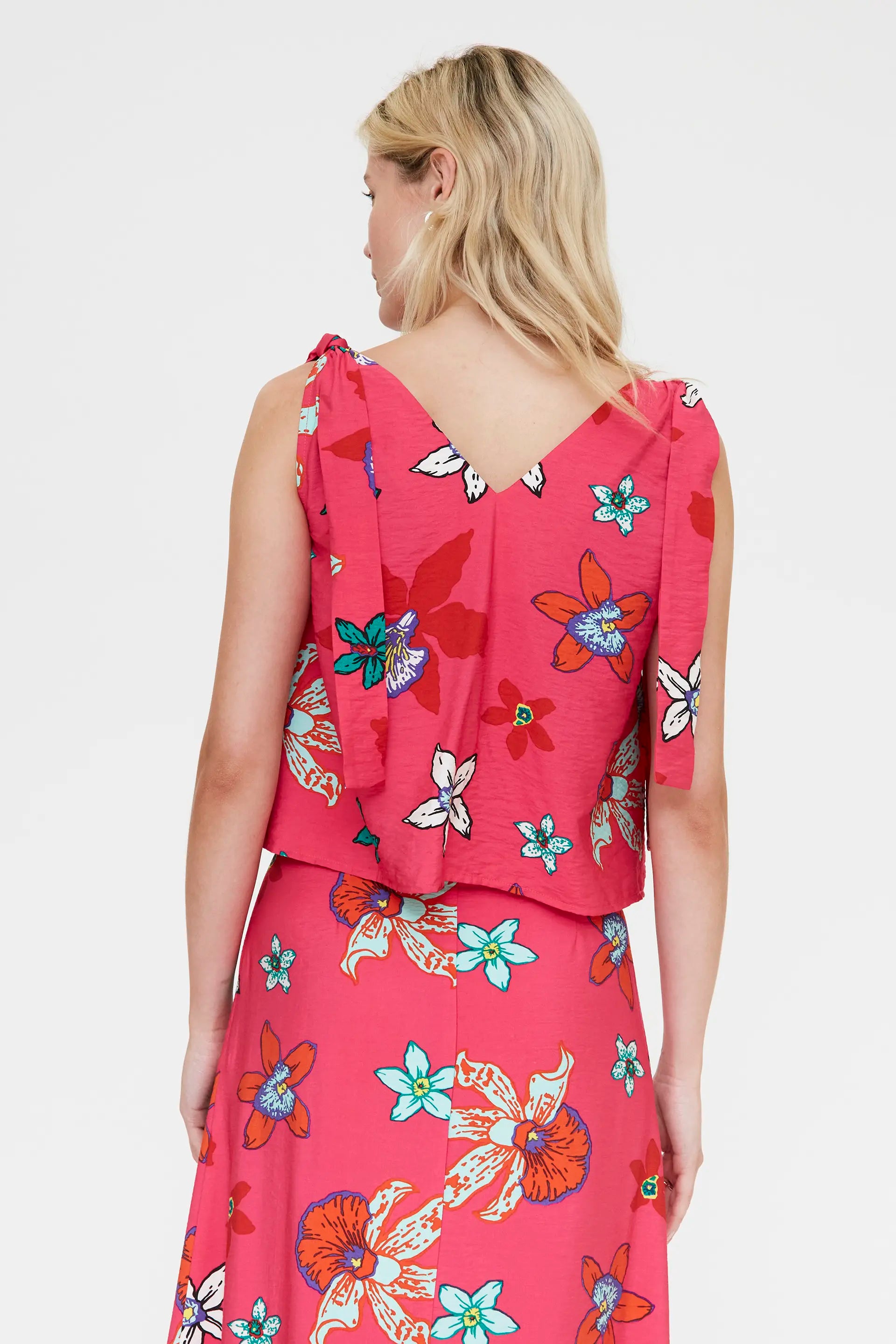 Top in crêpe con stampa Vanda. Scollo a V e spalline regolabili. La modella è alta 175 cm e indossa una taglia S.