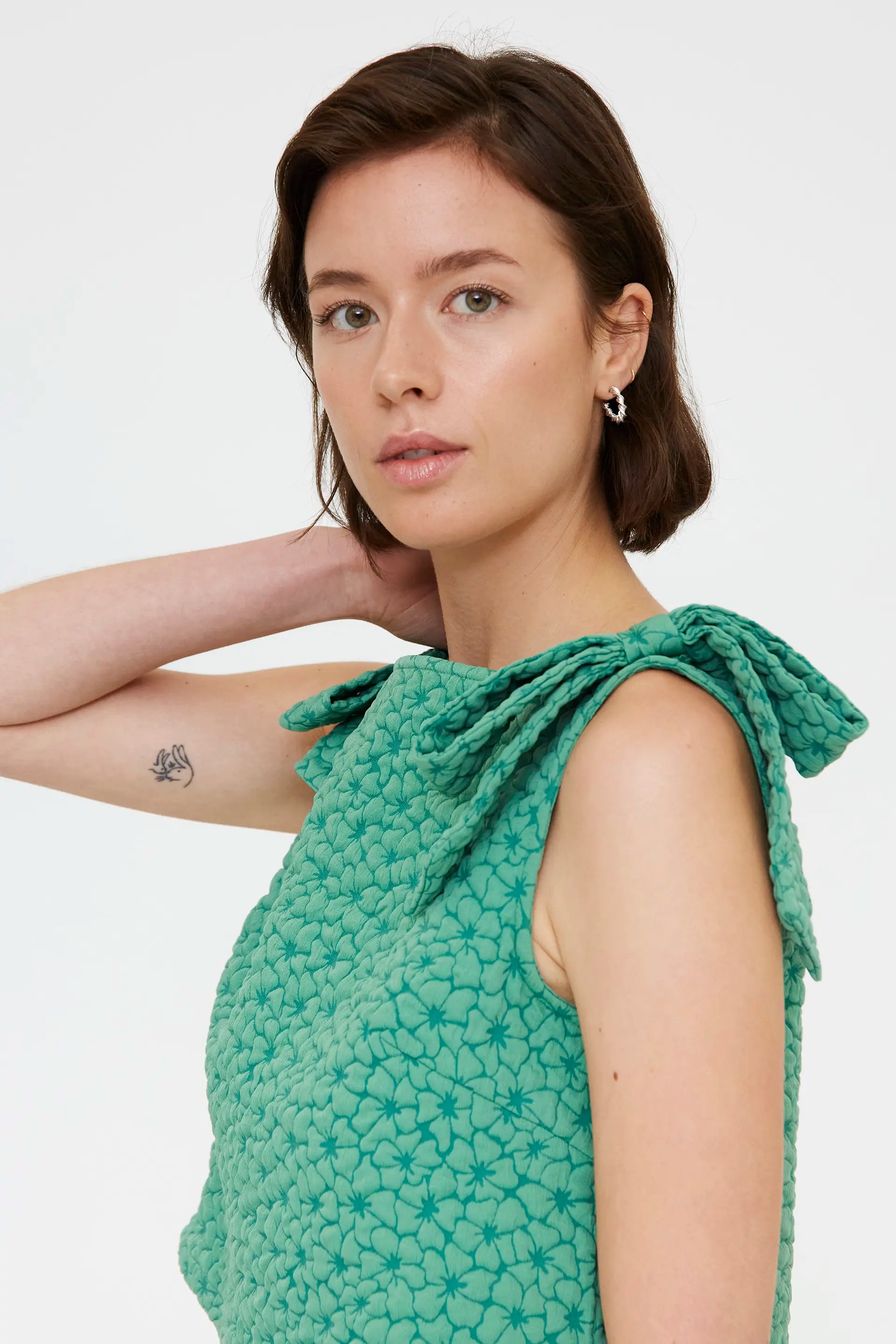Top in maglia jacquard verde. Scollo a barca e spalline spesse. Dettaglio texture floreale. La modella è alta 177 cm e indossa una taglia S.