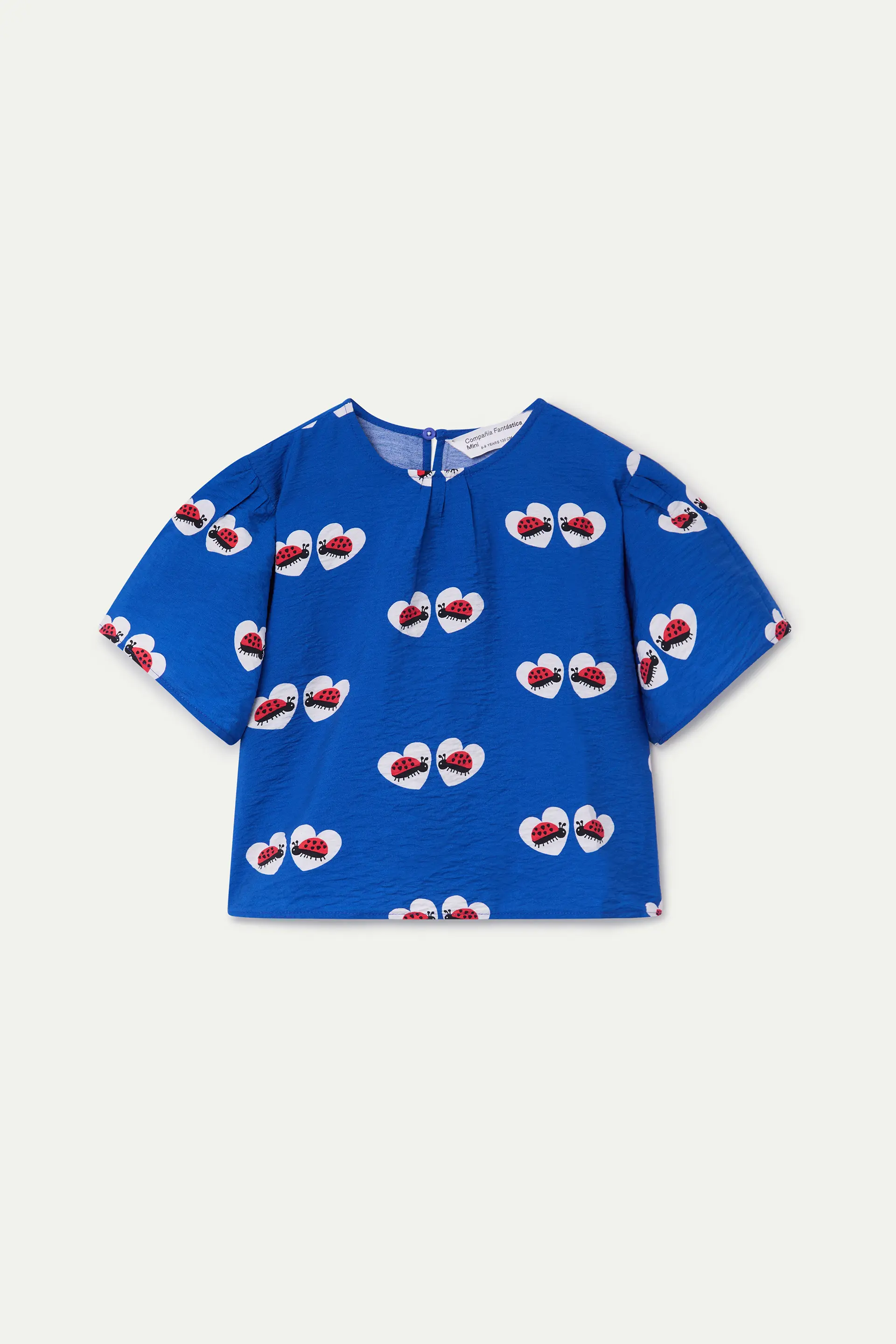 Top in crêpe per bambina con stampa a coccinella. Scollo rotondo e ampie maniche corte. La modella è alta 135 cm e indossa la taglia 8-9 anni.