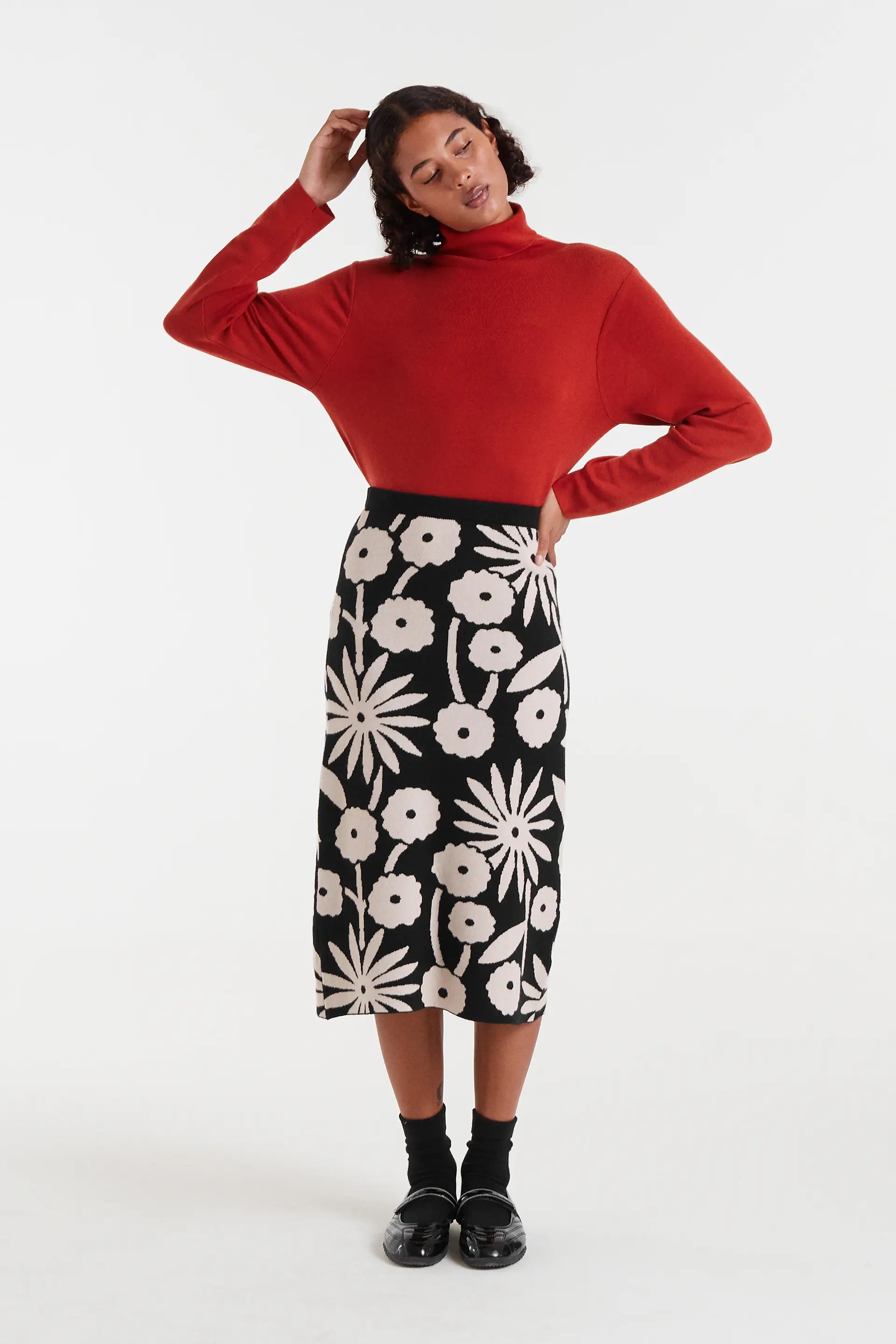Top in maglia fine color ruggine con collo alto e maniche lunghe. La modella è alta 175 cm e indossa una taglia S.
