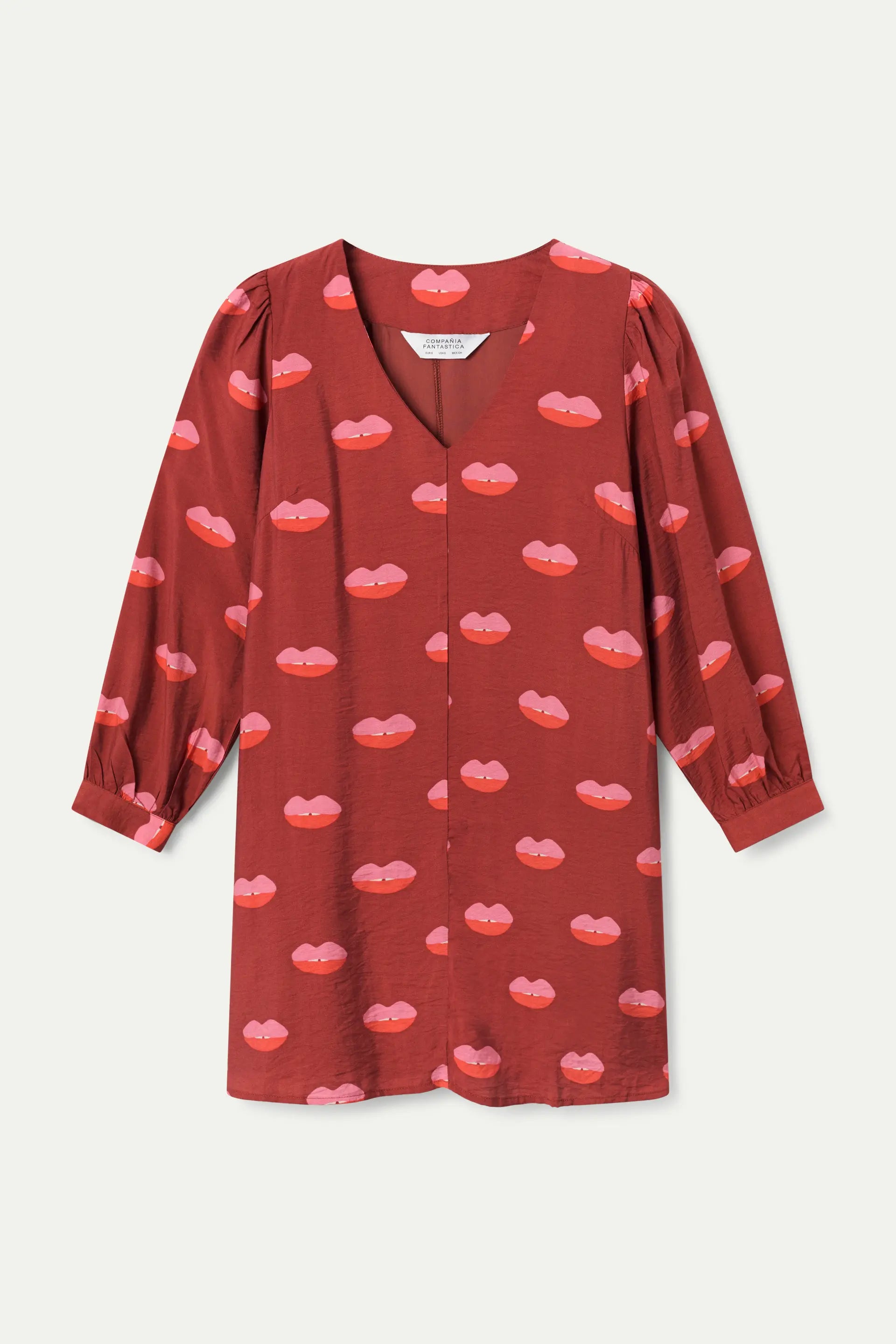 Vestido corto de tejido crepé ligero con estampado lips. Escote pico y manga larga ligeramente abullonada. Forro interior.