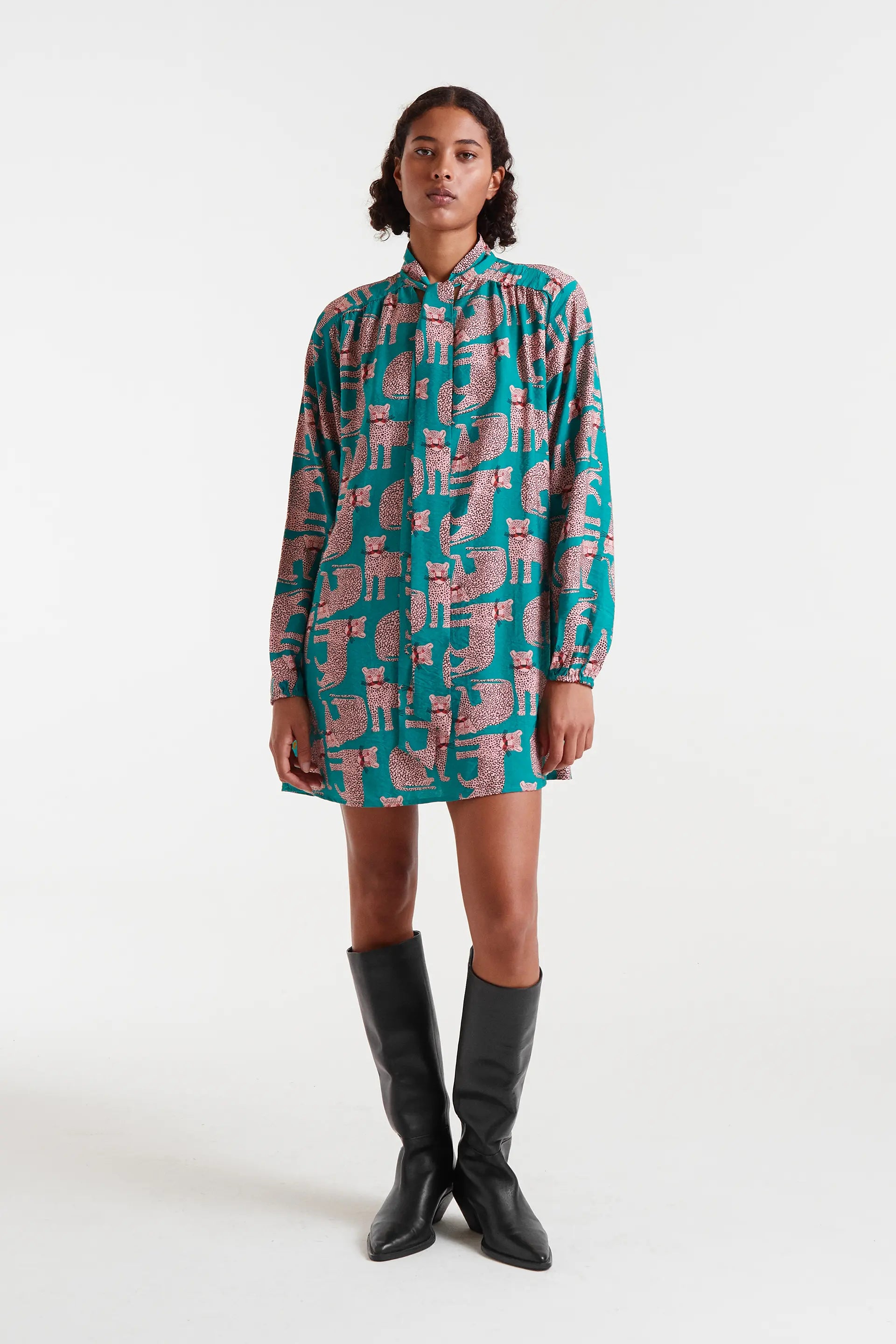 Abito corto in leggero tessuto crêpe con stampa Onca. Presenta scollo alto con laccetto e maniche lunghe con polsini elasticizzati. La modella è alta 175 cm e indossa una taglia S.