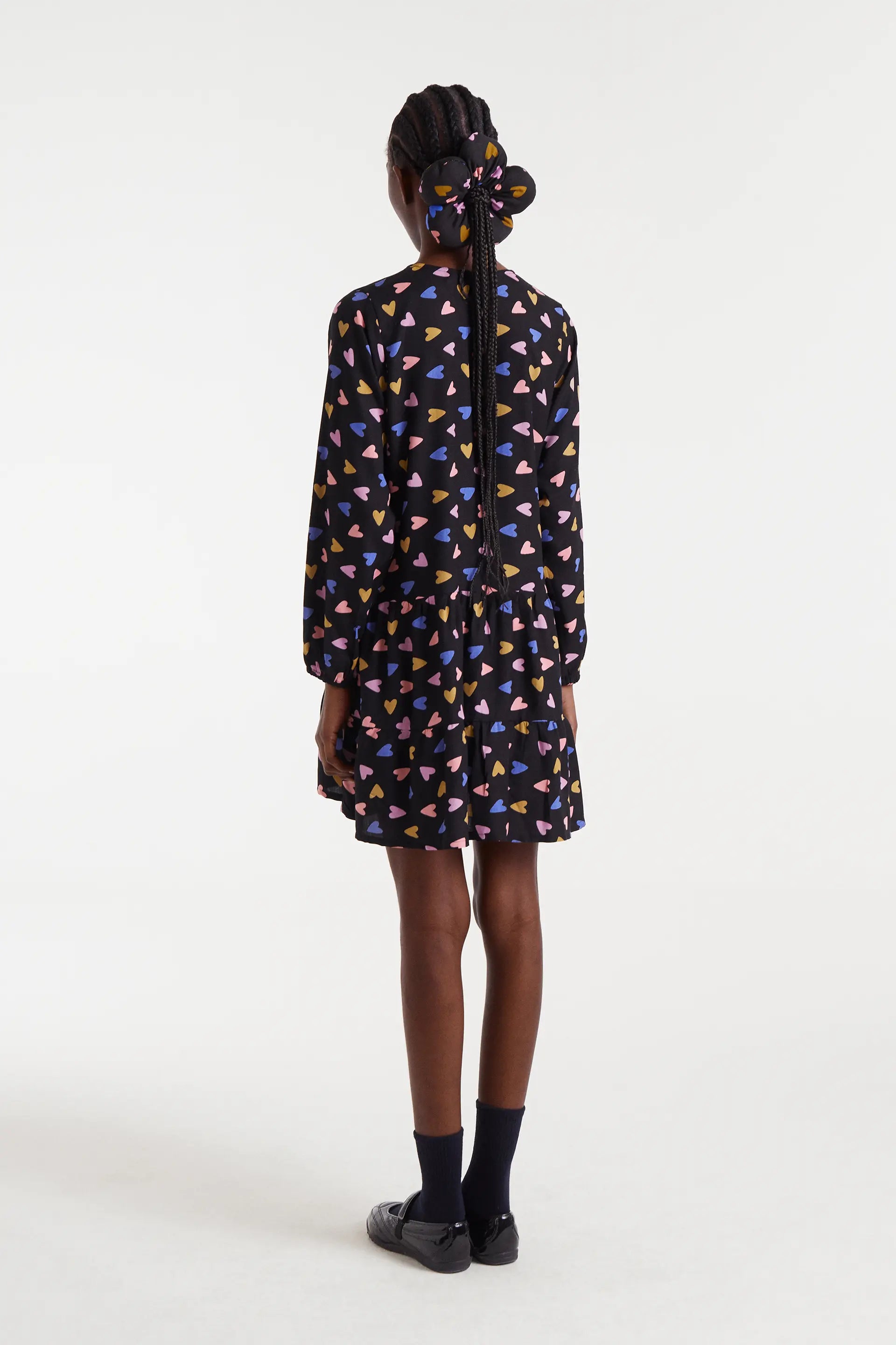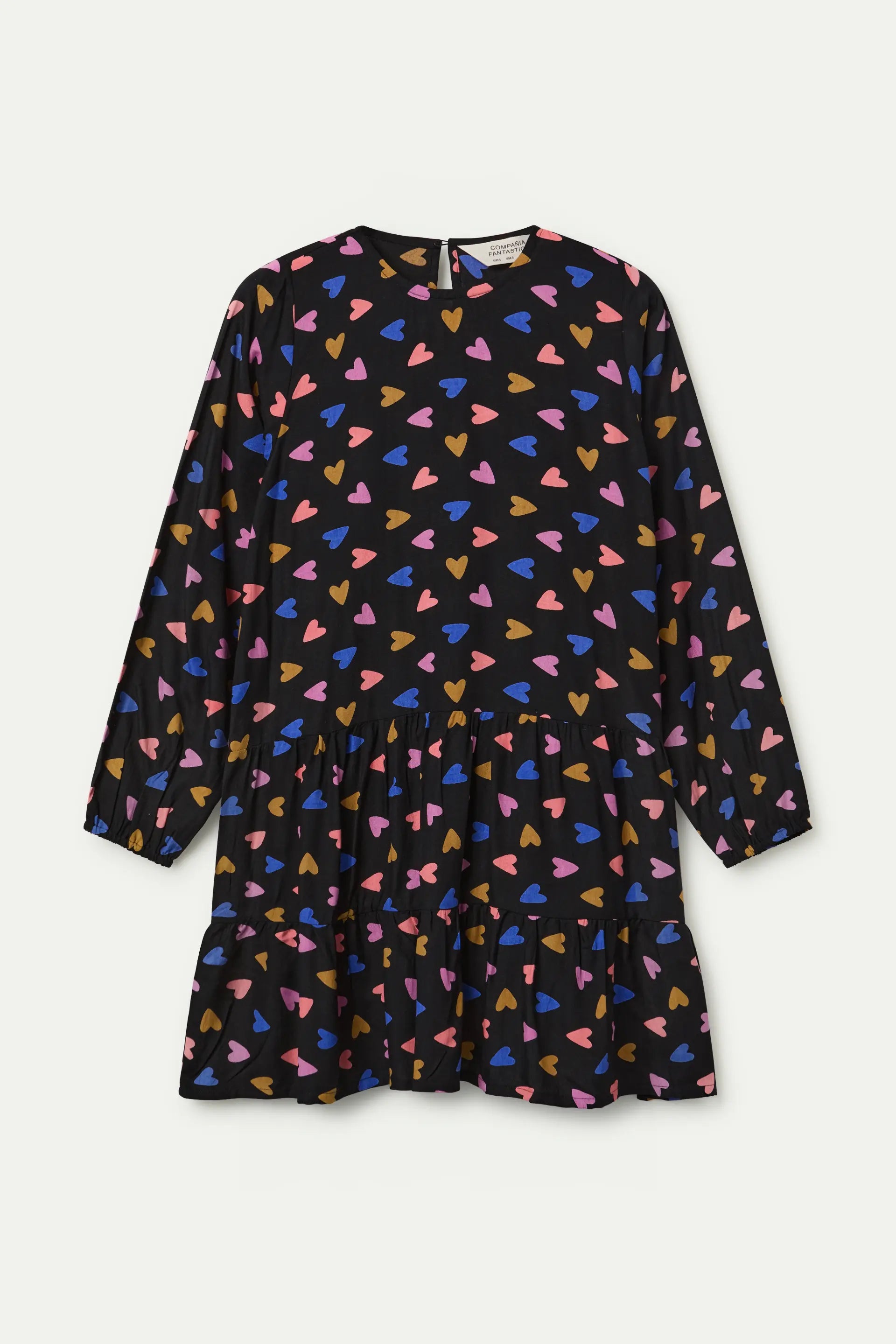 Abito corto in tessuto di viscosa leggera con stampa Potpourri. Scollo rotondo e maniche lunghe. Dettaglio plissettato sulla gonna. La modella è alta 178 cm e indossa una taglia S.