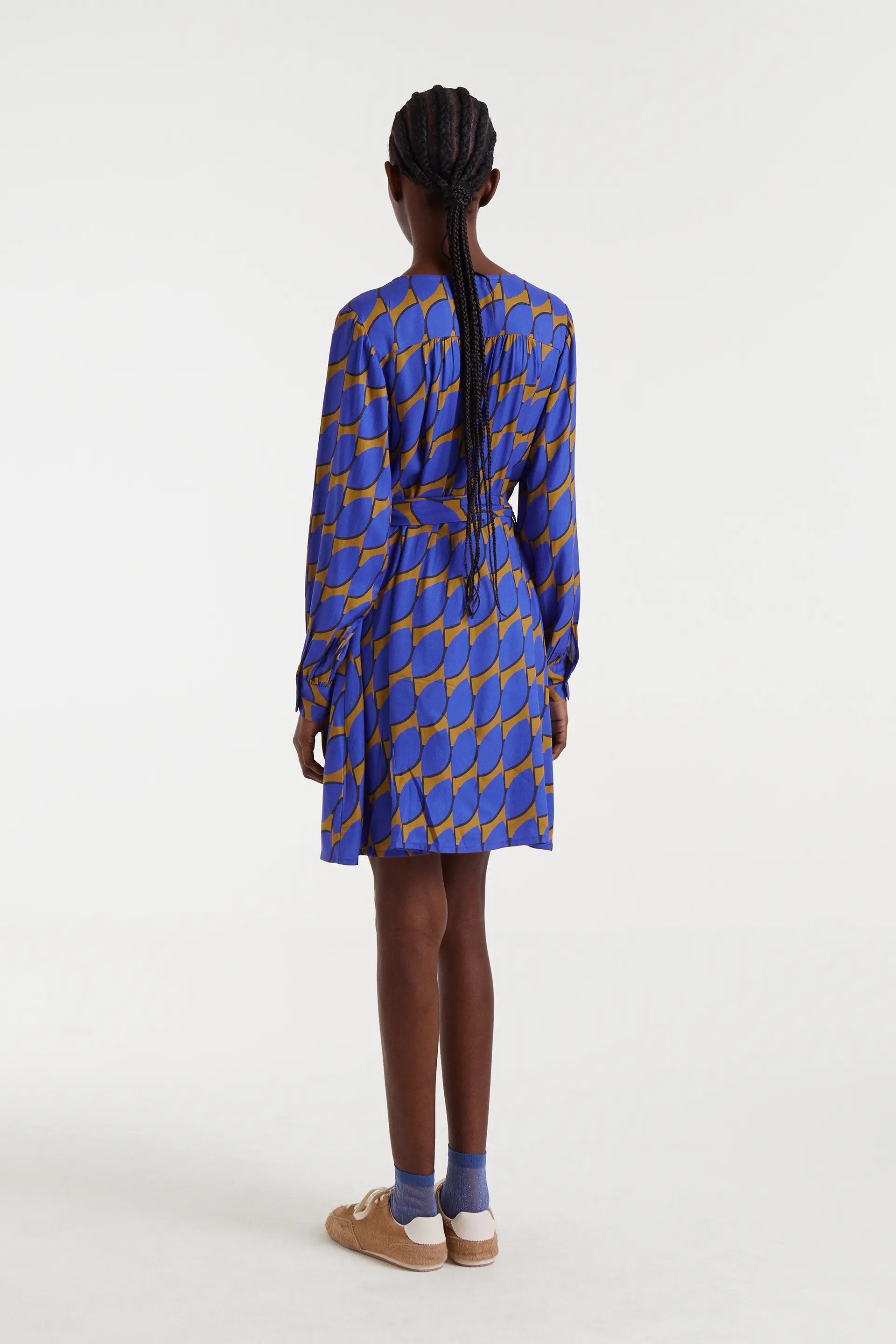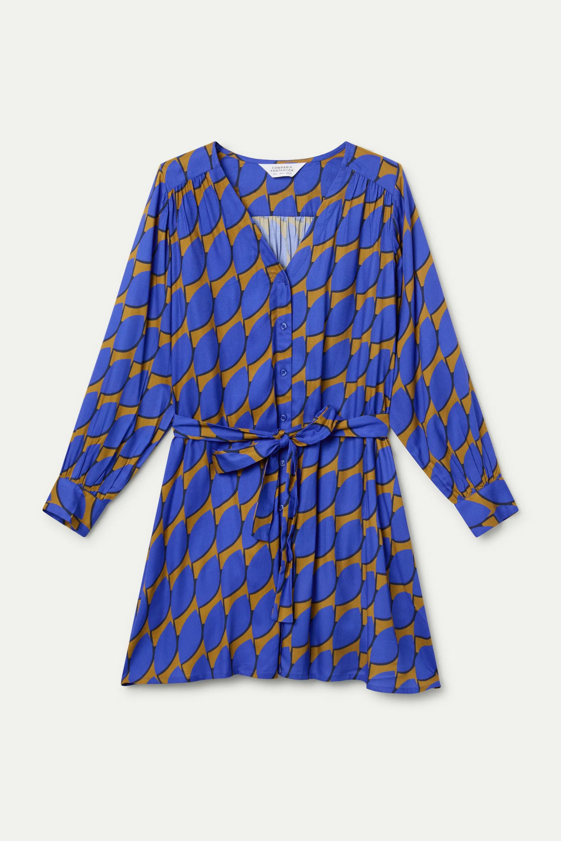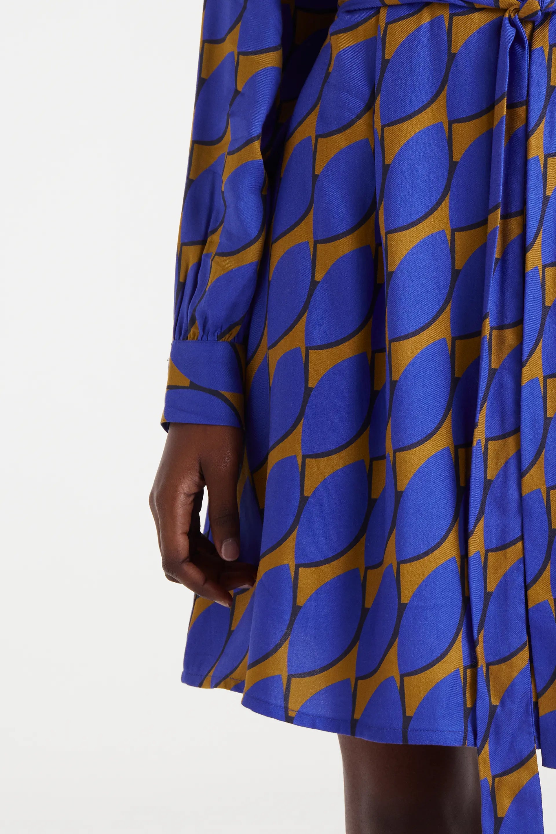 Abito corto in twill di viscosa con stampa Skouros Big. Presenta scollo a V e maniche lunghe con polsini abbottonati. Chiusura frontale con bottoni e cintura in vita. La modella è alta 178 cm e indossa una taglia S.
