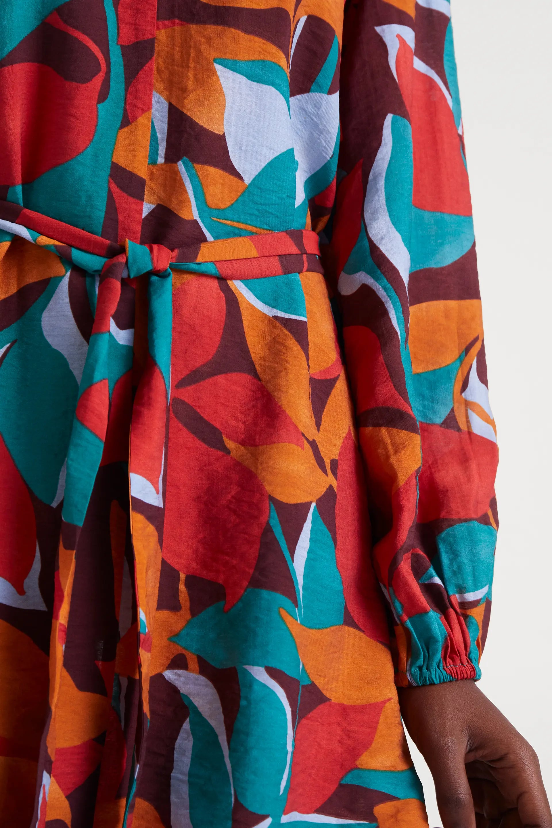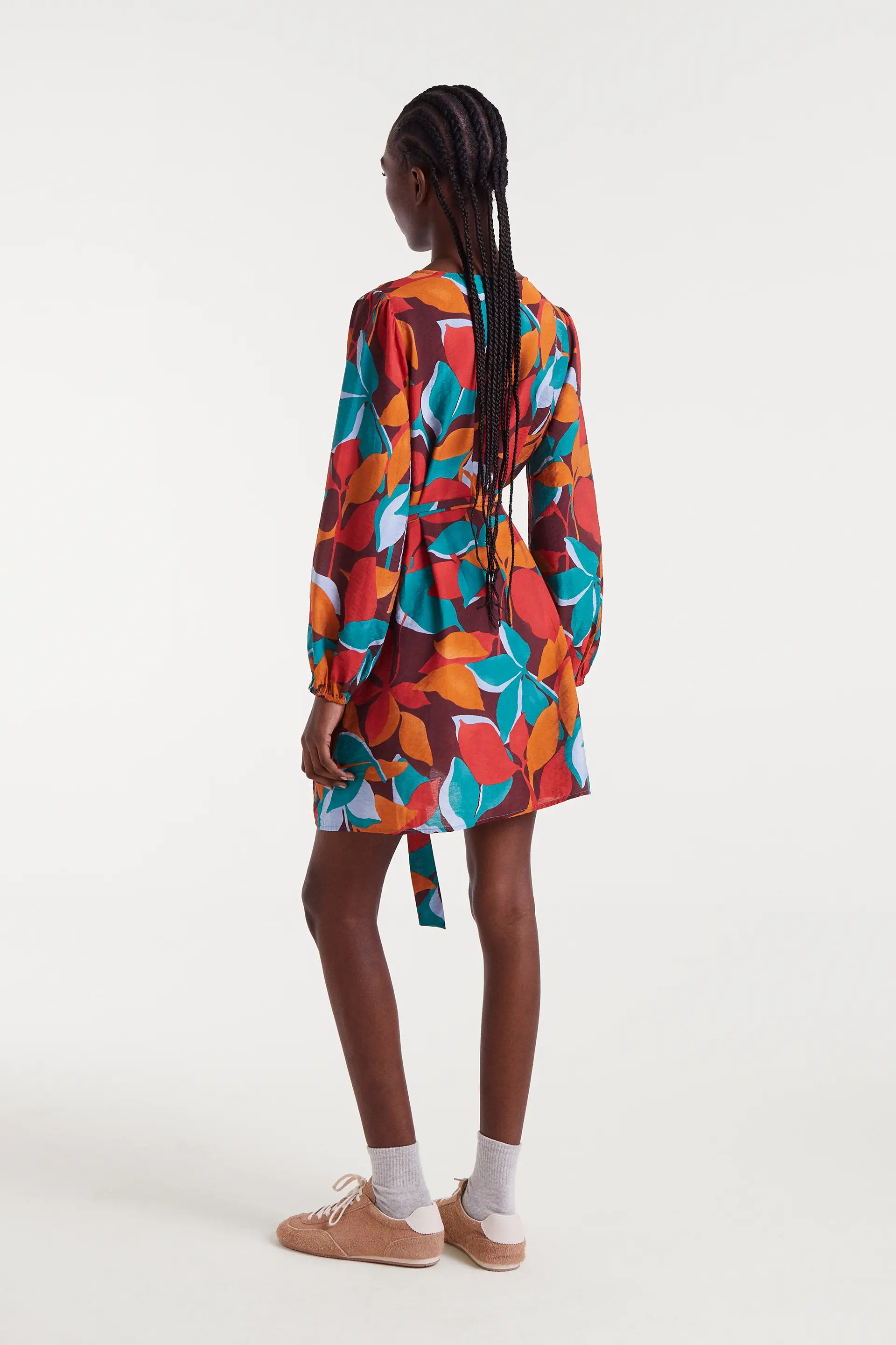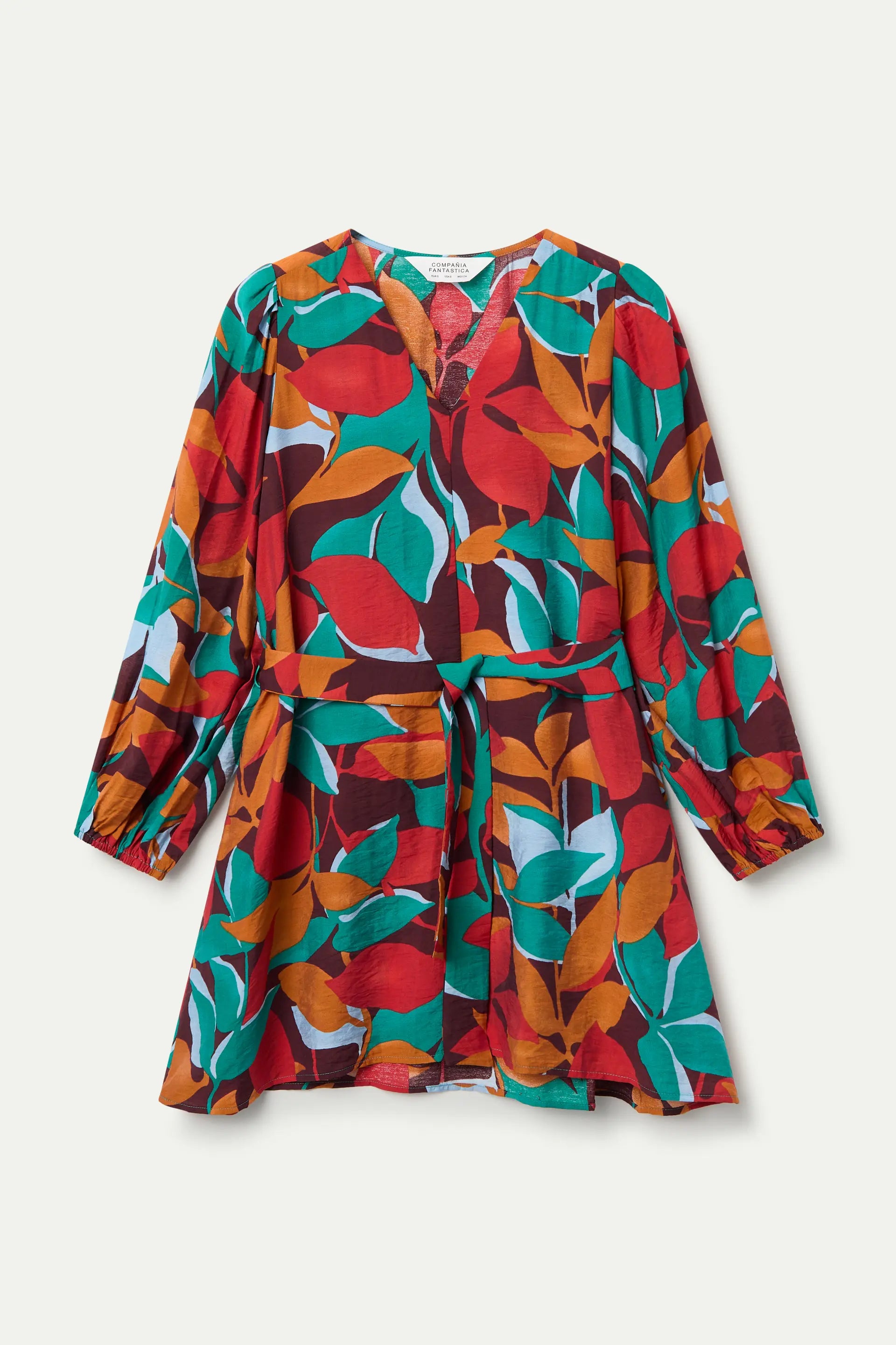 Abito corto in leggero tessuto crêpe con stampa Ponziana. Scollo a V e maniche a tre quarti con polsini elastici. Tasche laterali e dettaglio con laccetto in vita. La modella è alta 178 cm e indossa una taglia S.