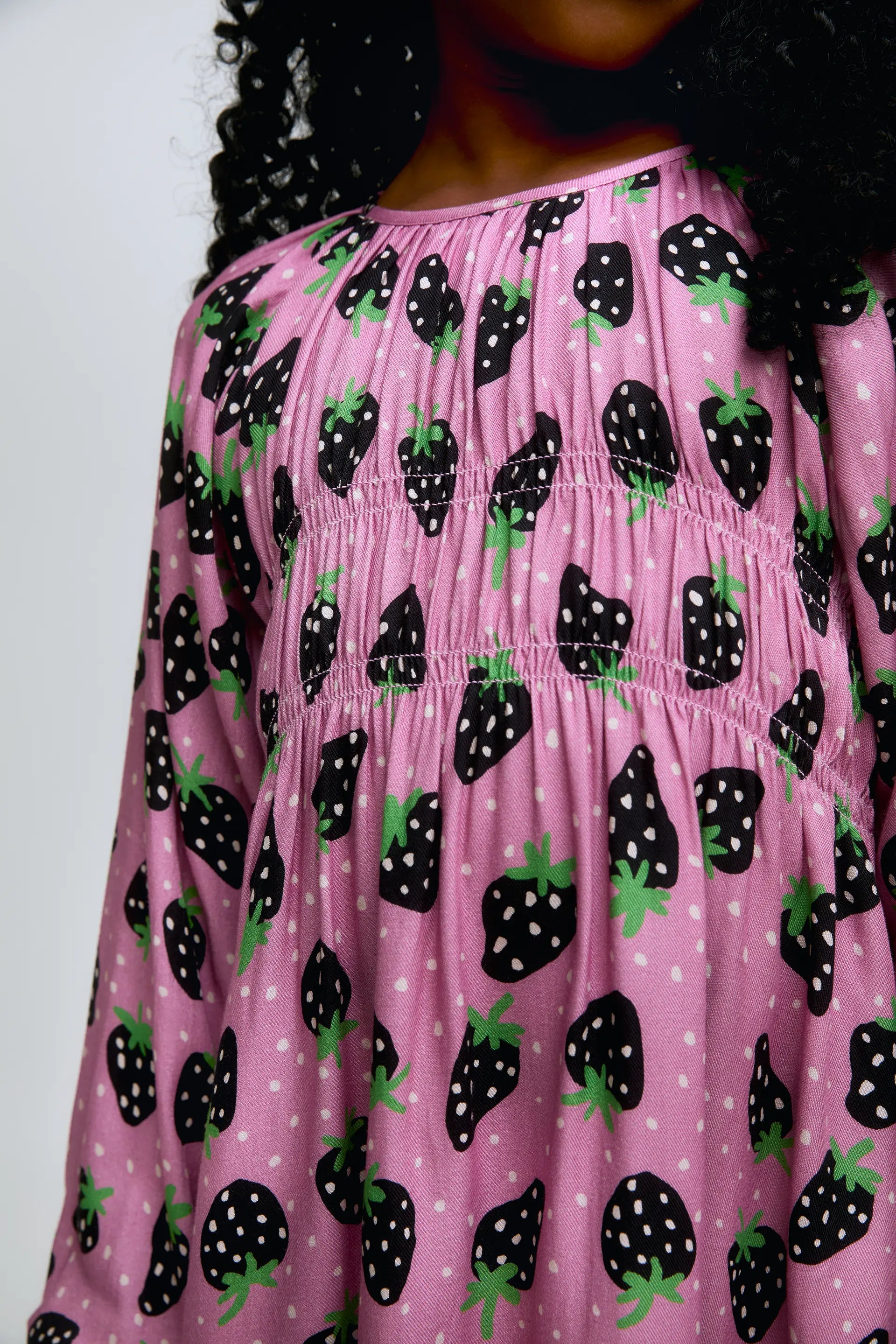Vestido corto de niña con estampado de fresas. Manga larga con puños fruncidos, cuello redondo, detalles de frunces en el pecho. Cuenta con bolsillos laterales.