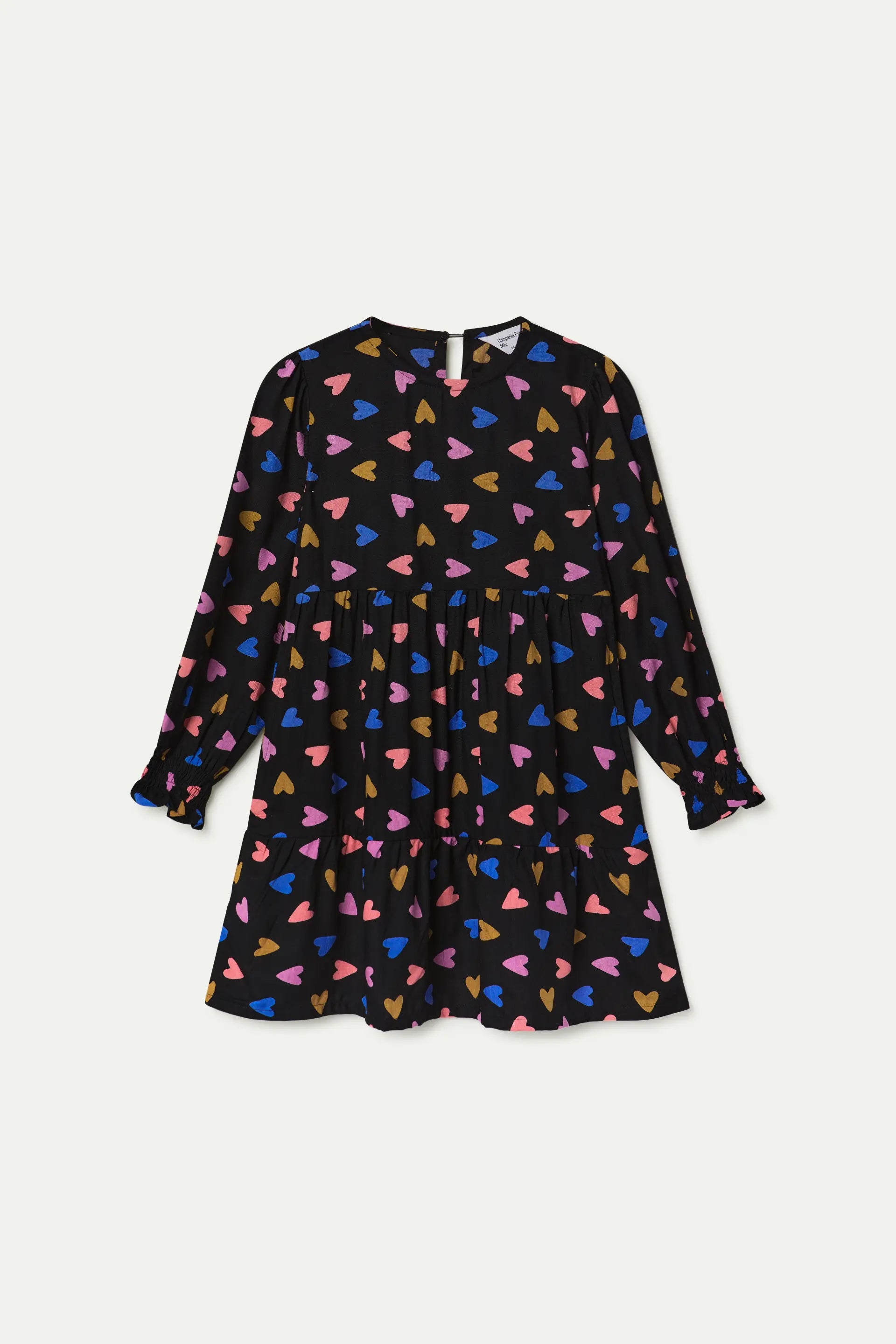 Abito corto e lungo da bambina Porpourri con stampa a cuori multicolore. Presenta polsini arricciati, chiusura con bottoni sul retro e vita arricciata.