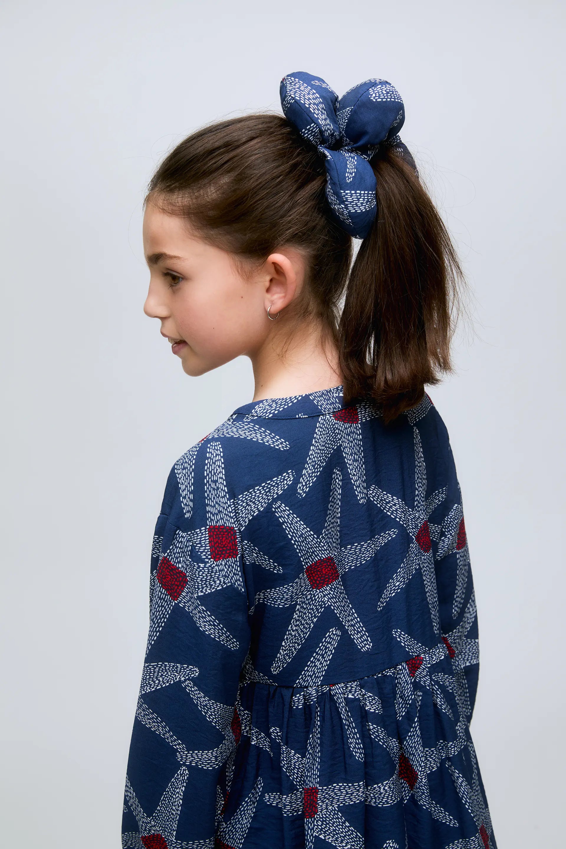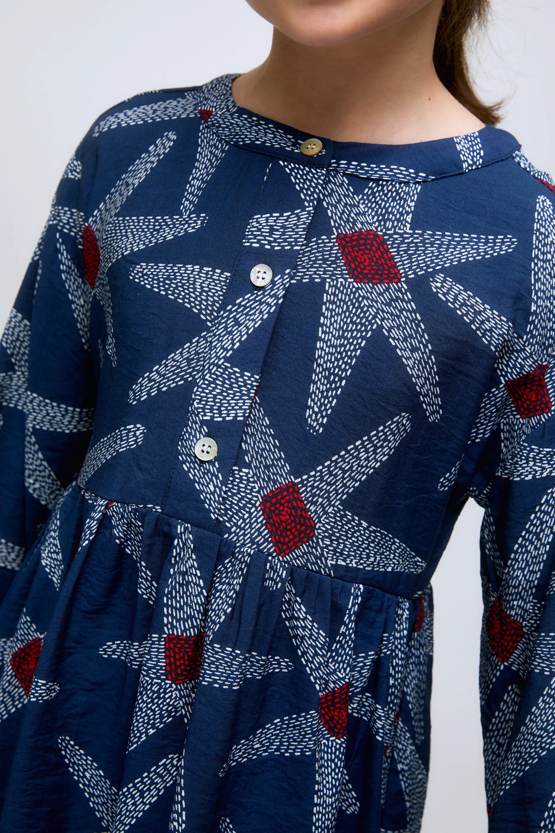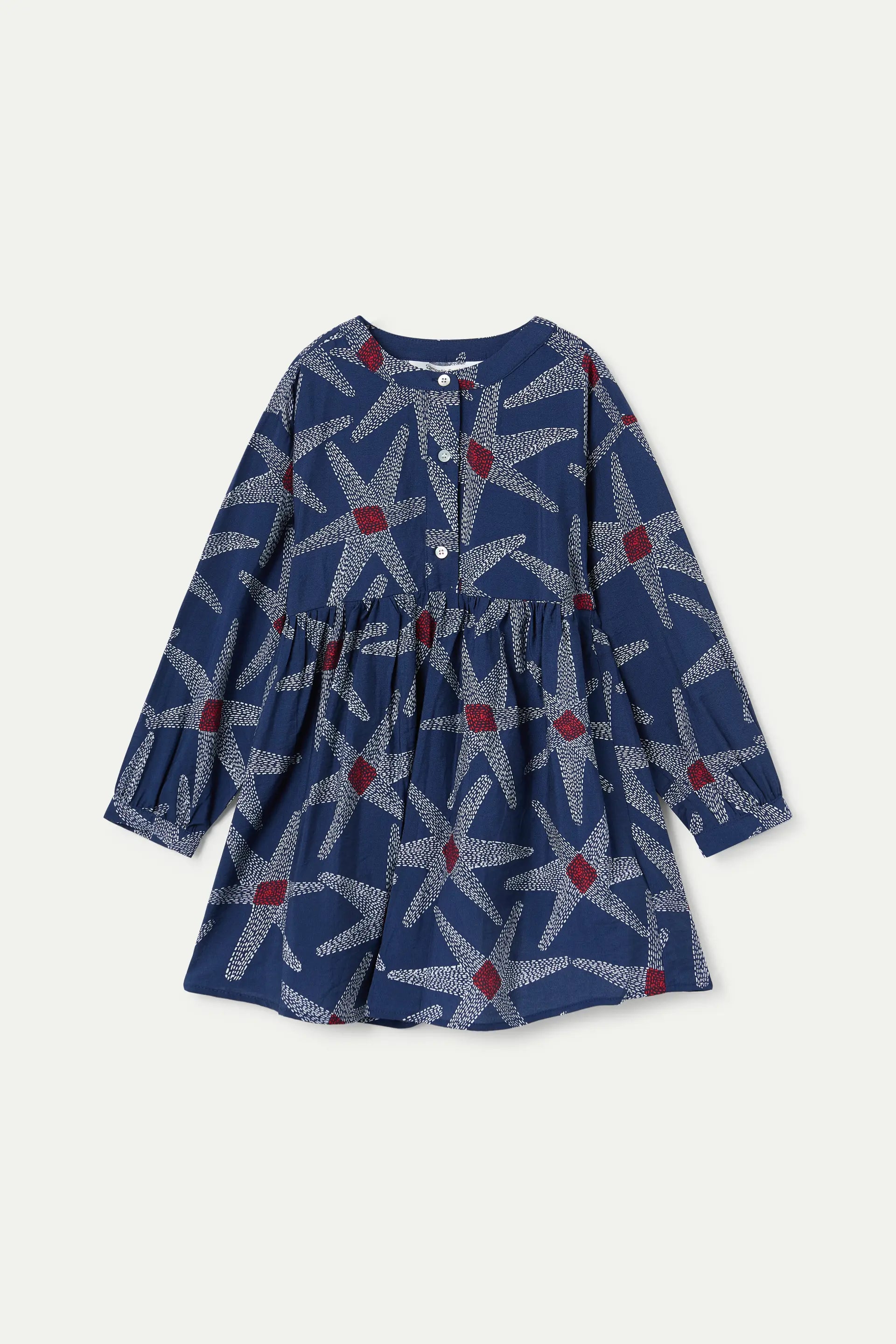 Abito corto da bambina a maniche lunghe con stampa a stelle su sfondo blu navy. Silhouette a trapezio e tessuto morbido, perfetto per l'uso quotidiano. Polsini e vita arricciati.