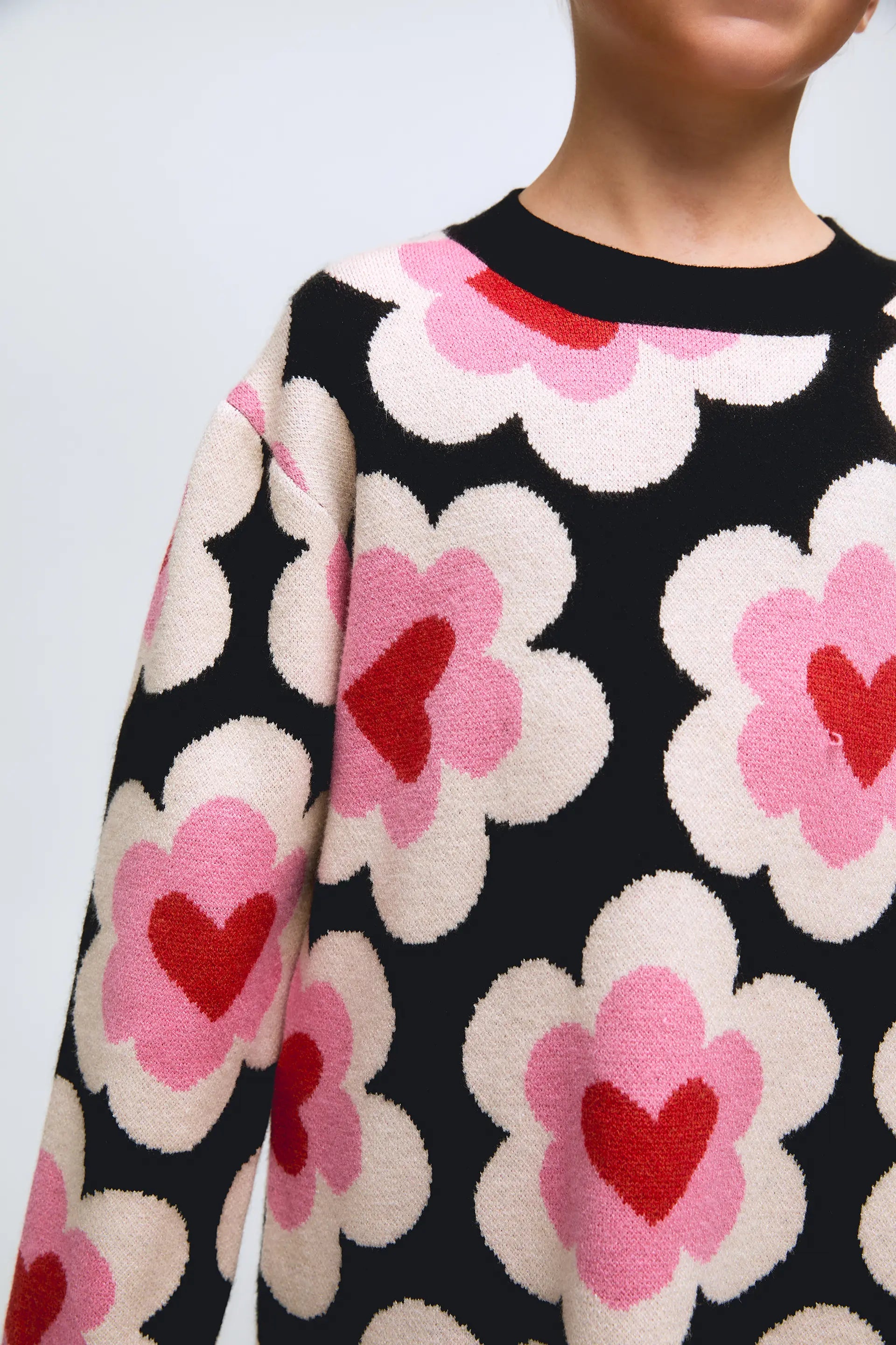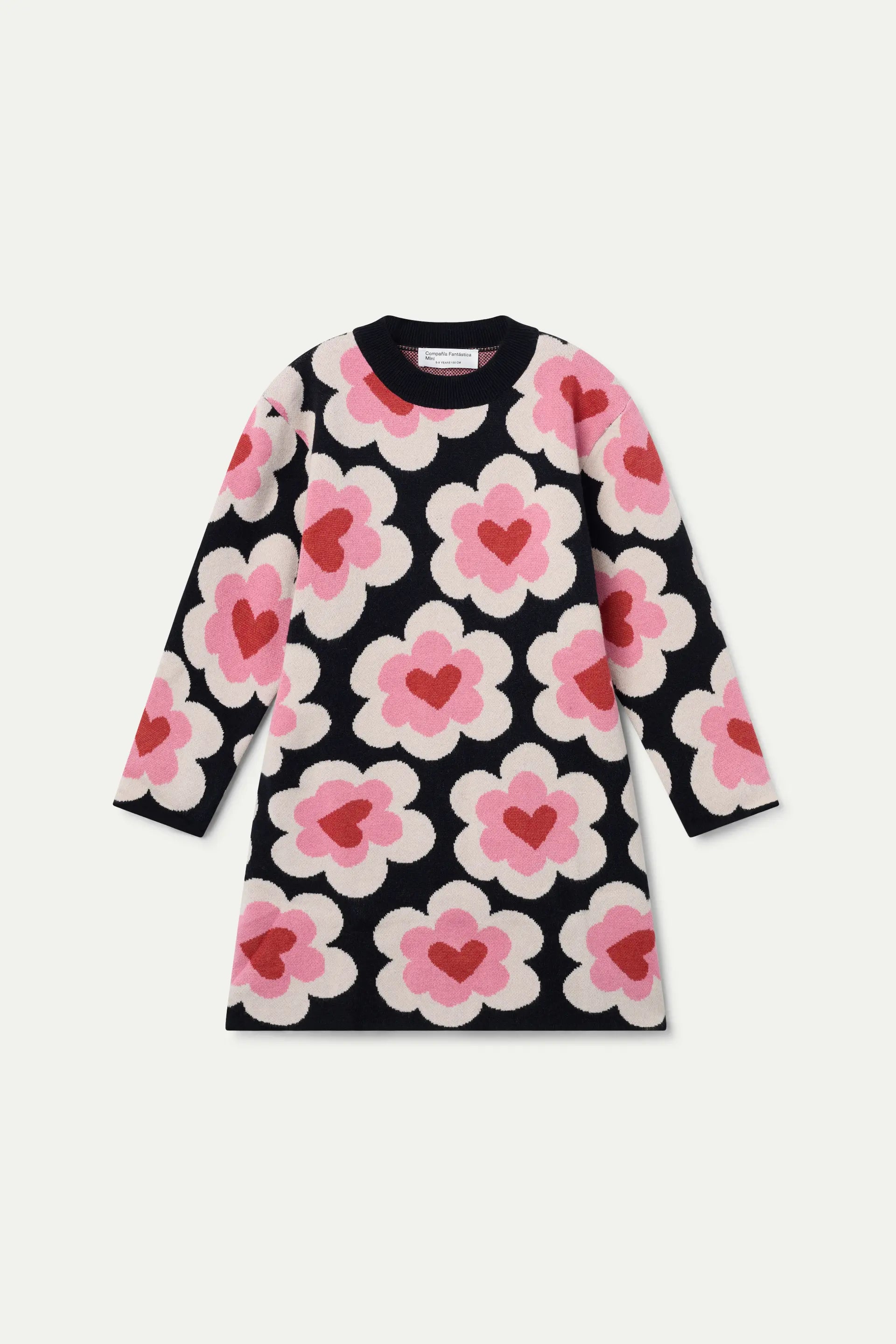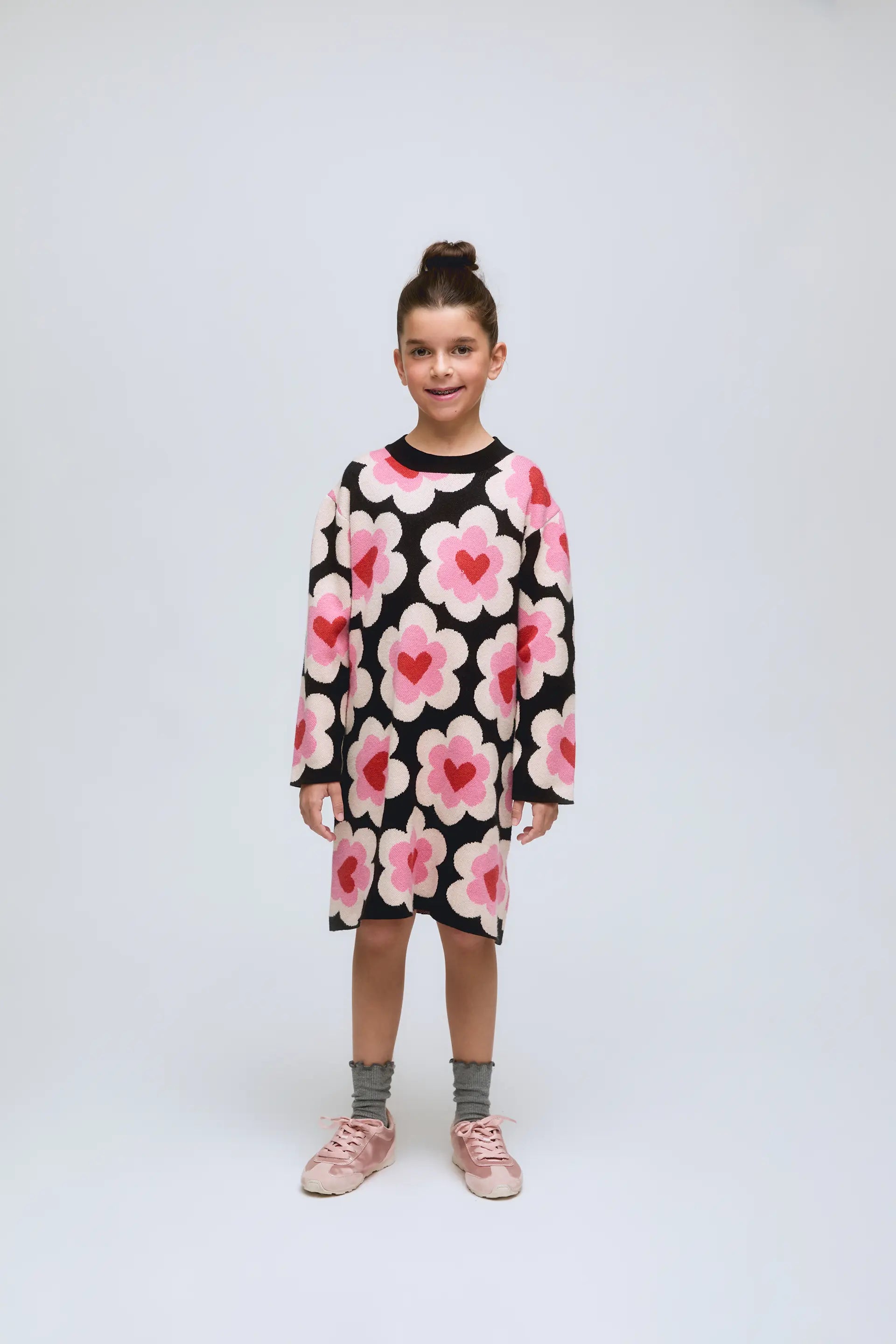 Abito corto da bambina in maglia jacquard con sfondo nero e stampa Sweet Heart. Con scollo rotondo e maniche lunghe.