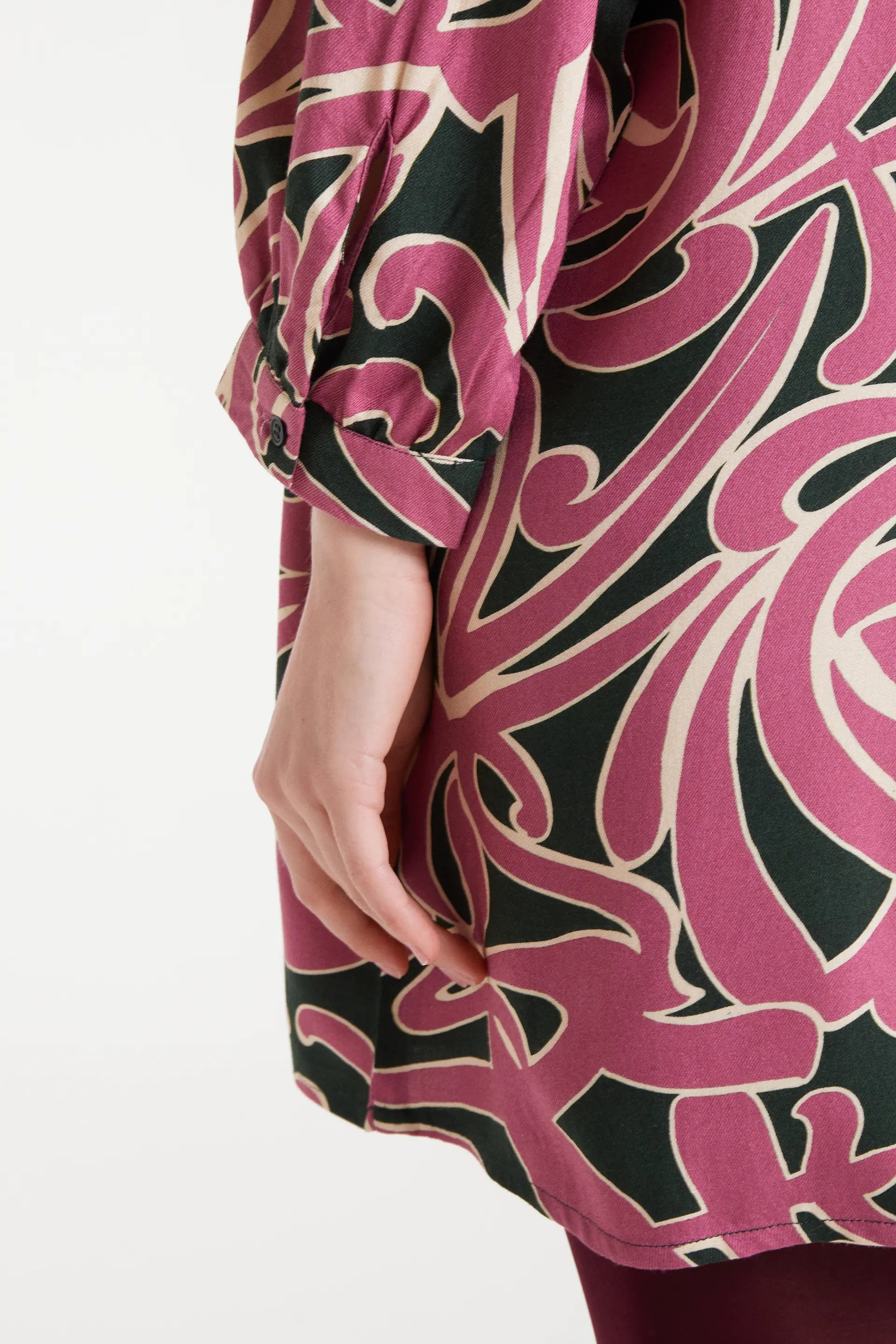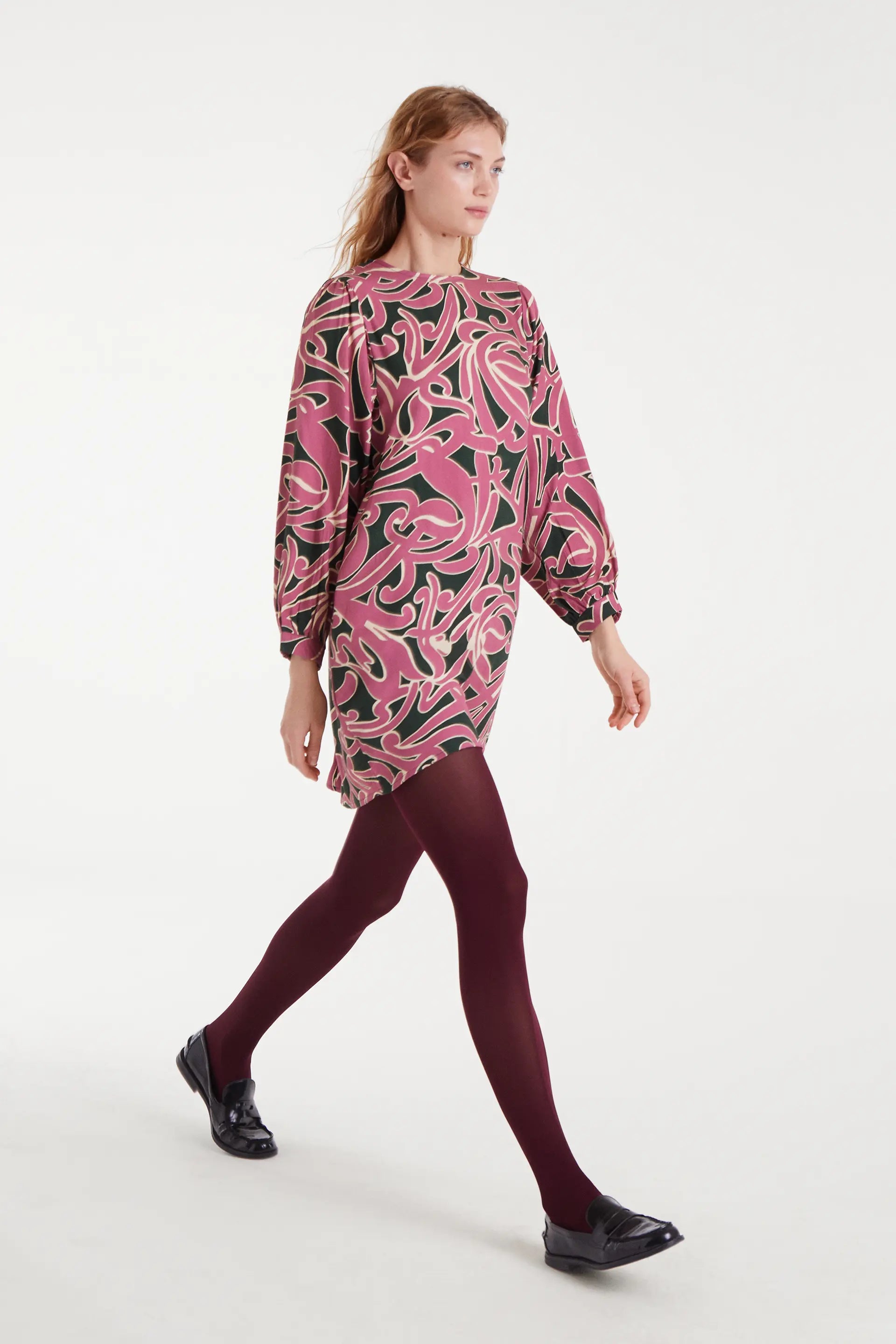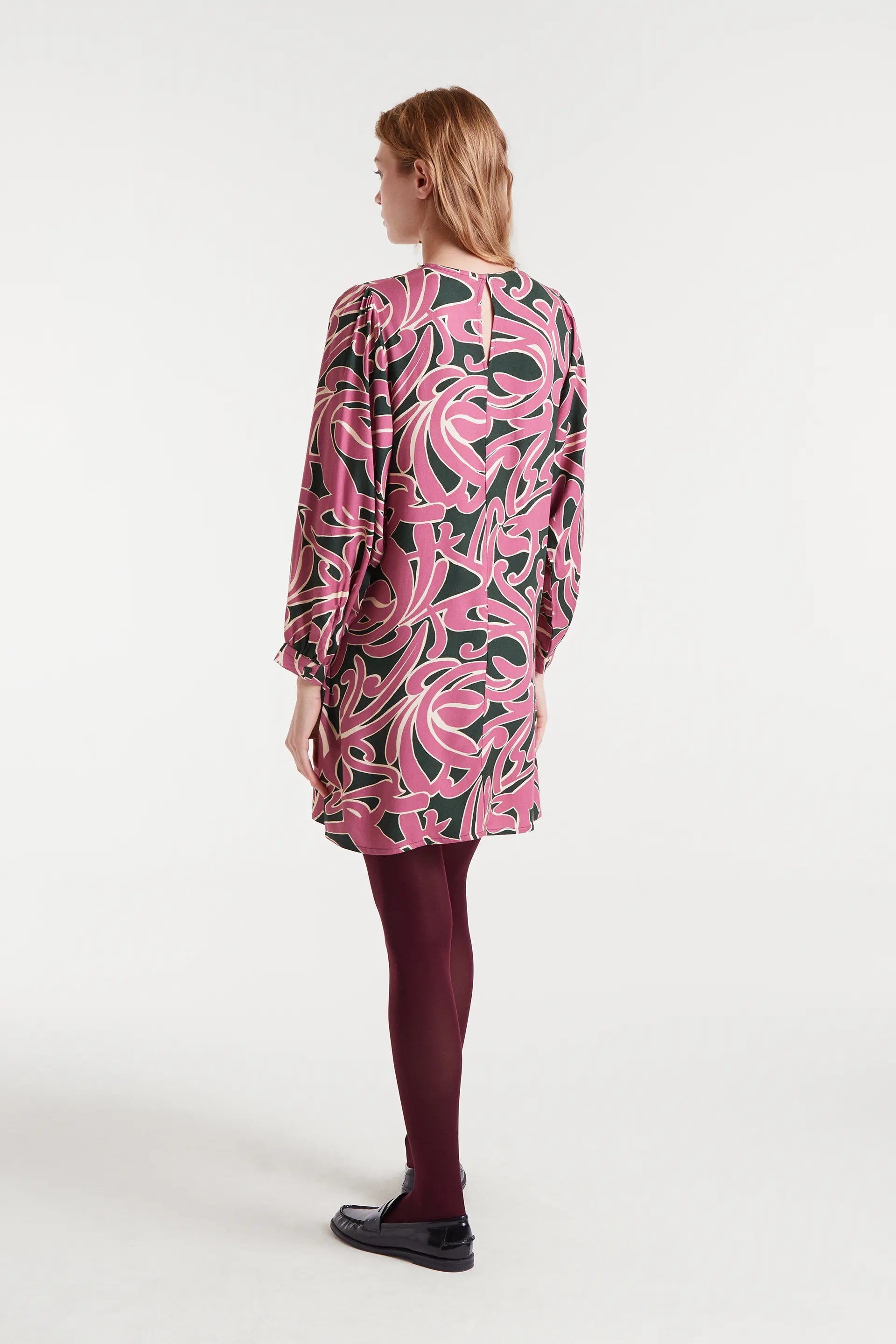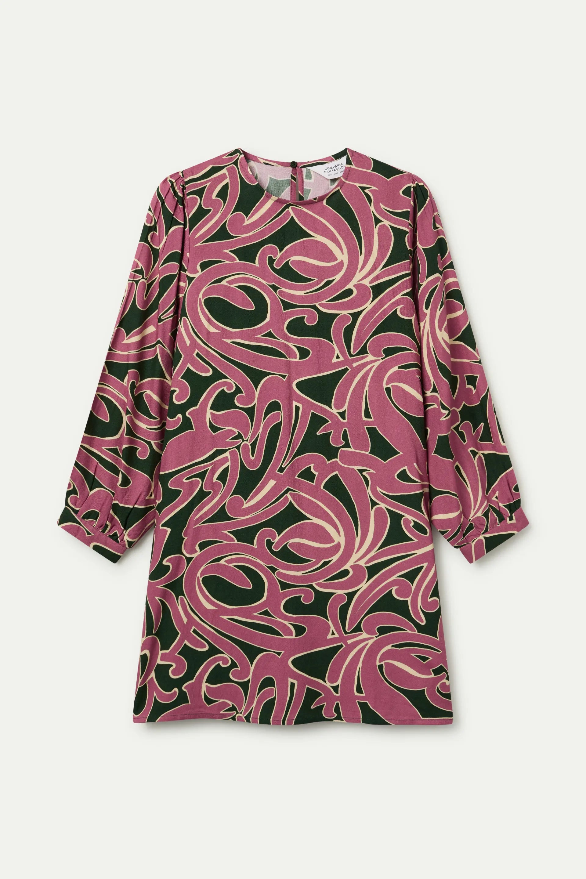 Abito corto con stampa Pastures. Scollo rotondo e maniche lunghe con polsini abbottonati. Chiusura con bottoni sul retro. La modella è alta 179 cm e indossa una taglia S.