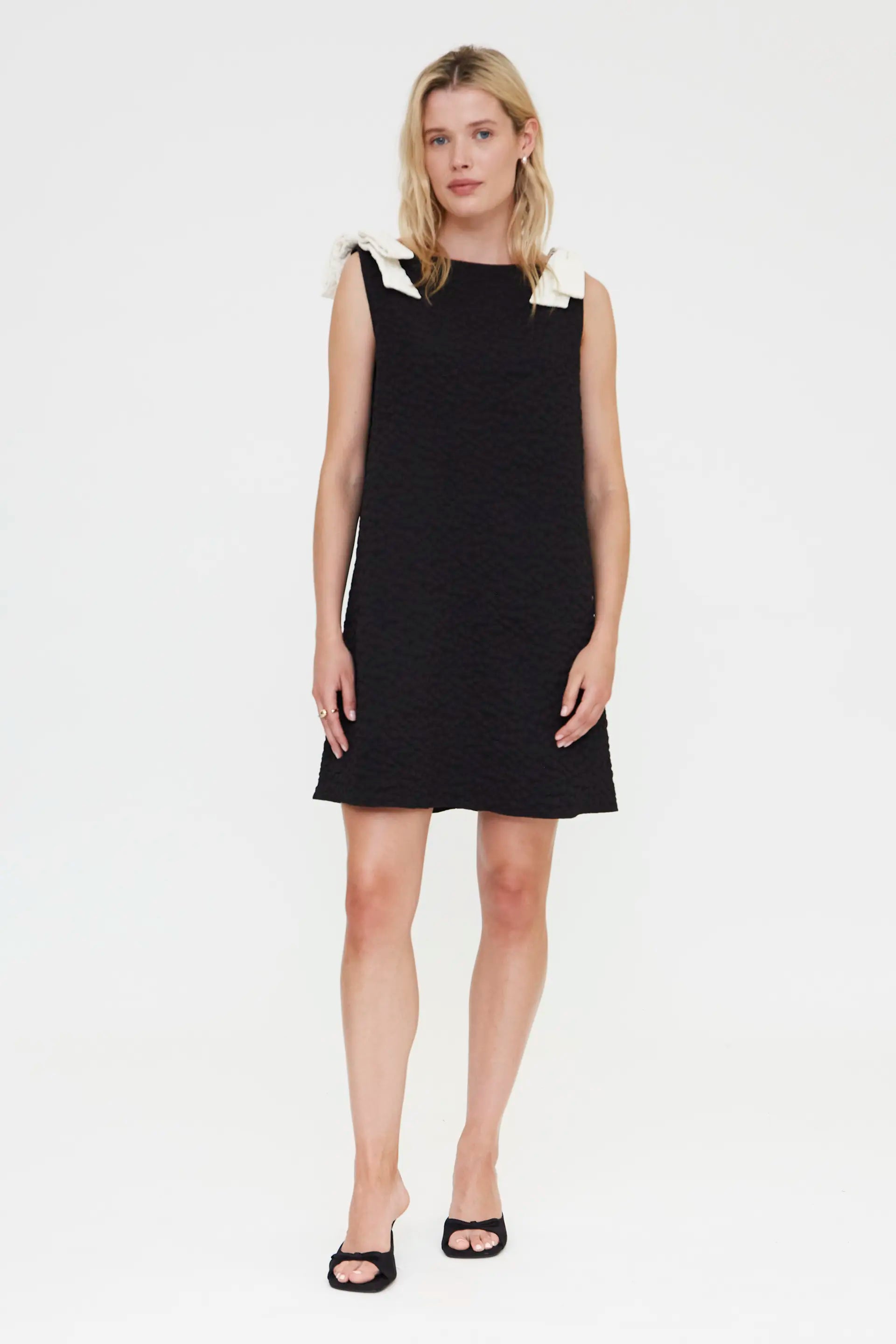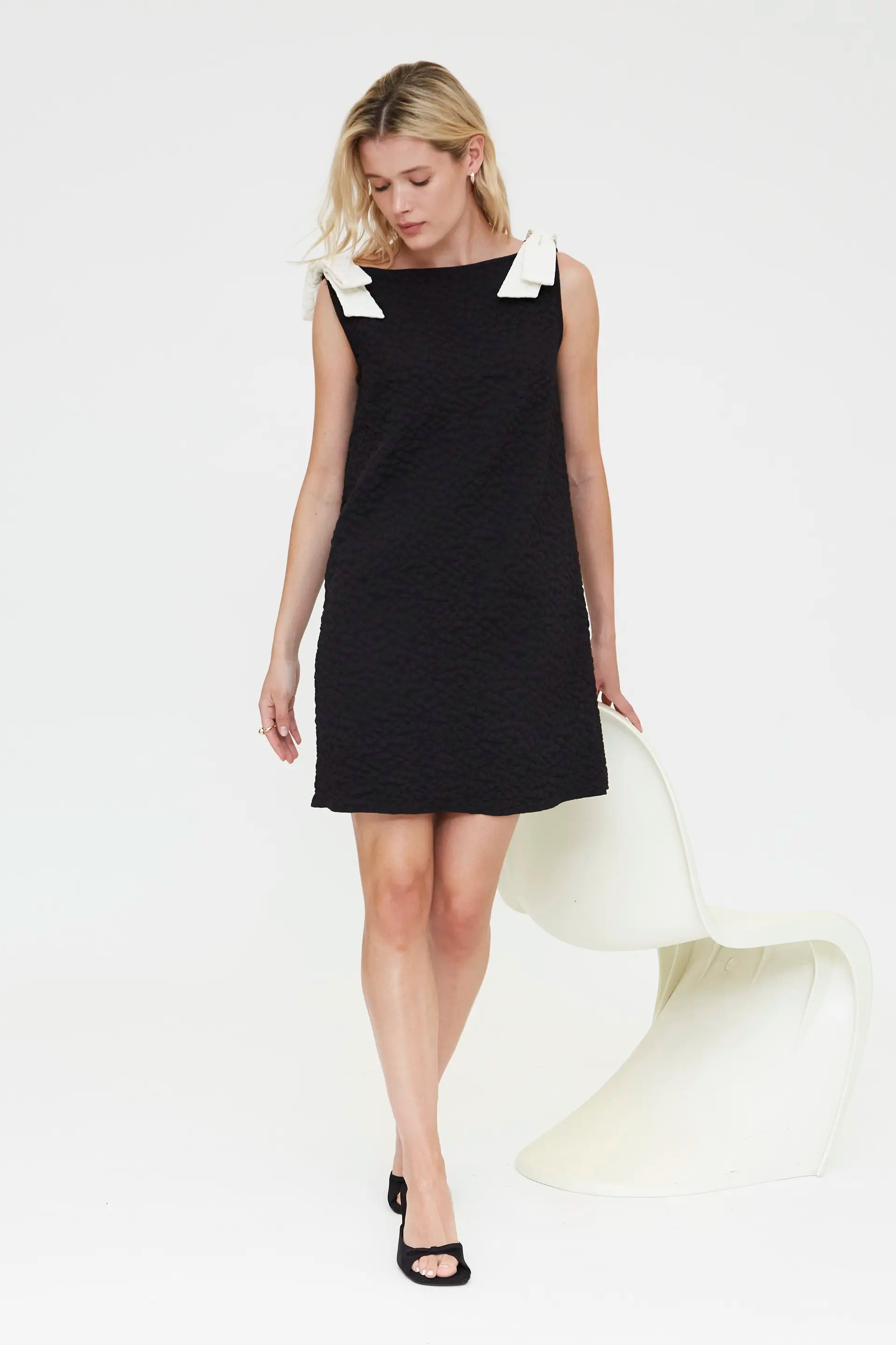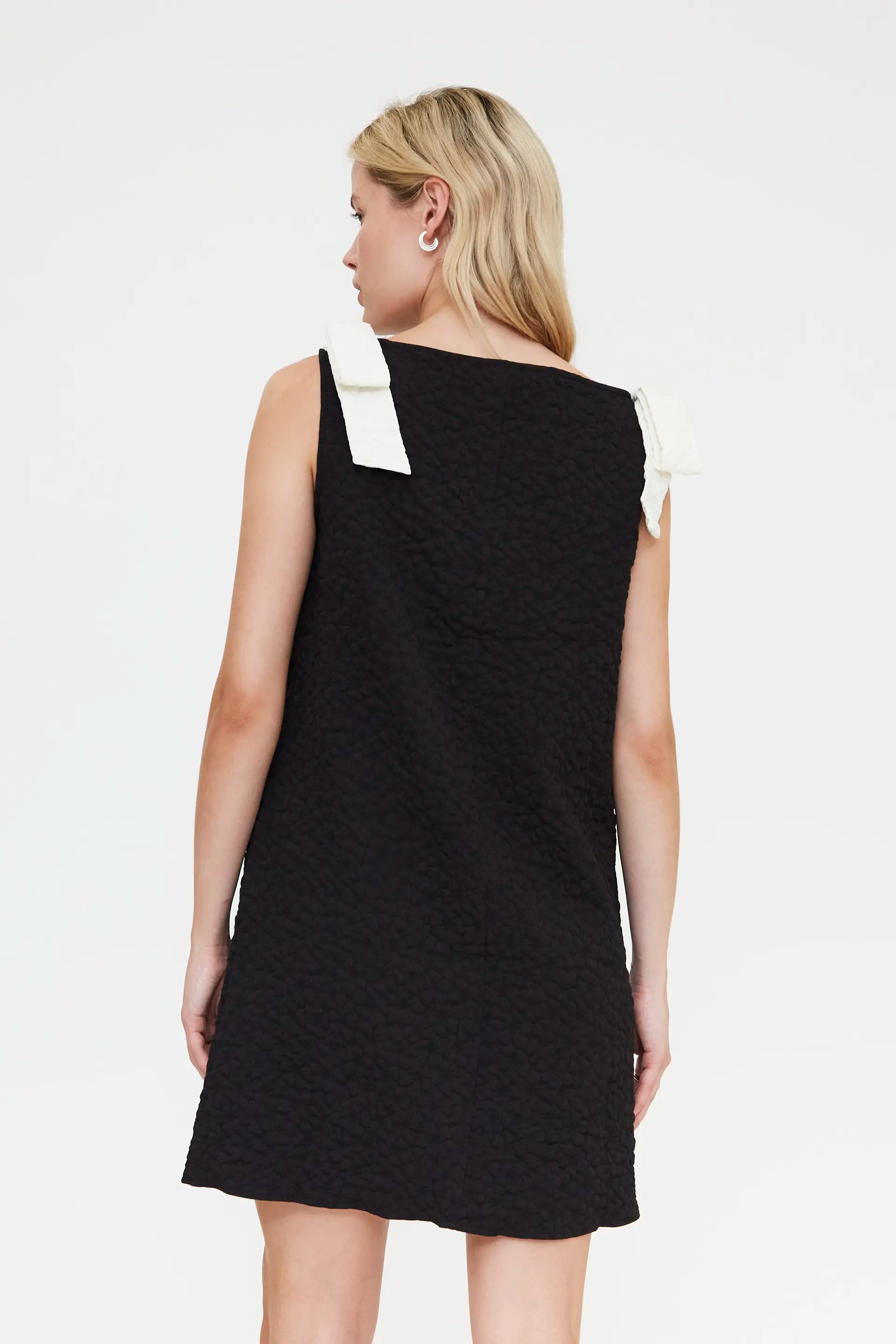 Abito corto in tessuto jacquard nero. Scollo rotondo e senza maniche. Dettaglio fiocco bianco. La modella è alta 175 cm e indossa una taglia S.