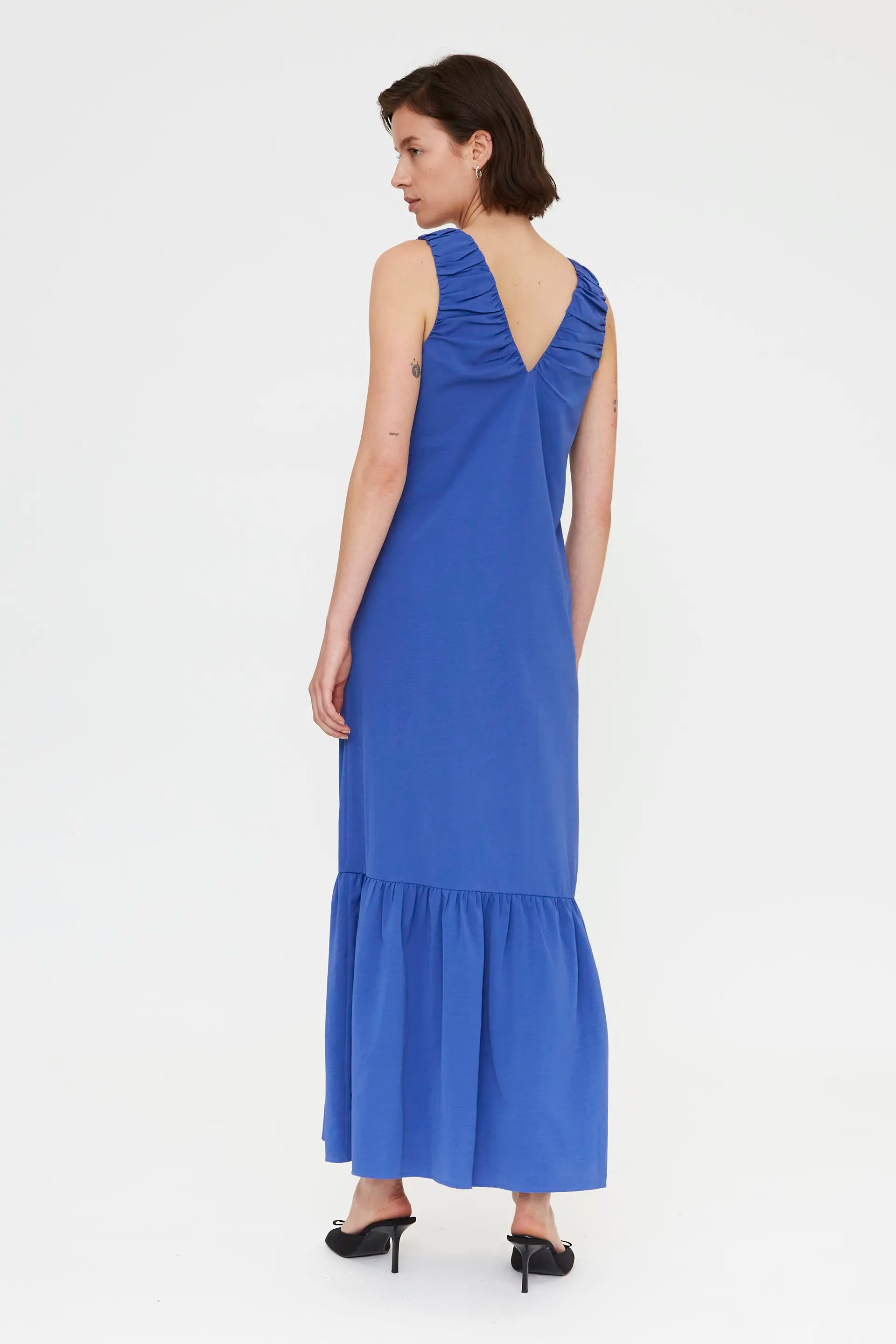 Abito lungo in crêpe blu. Scollo a V e spalline drappeggiate. Dettaglio volant sulla gonna. La modella è alta 177 cm e indossa una taglia S.