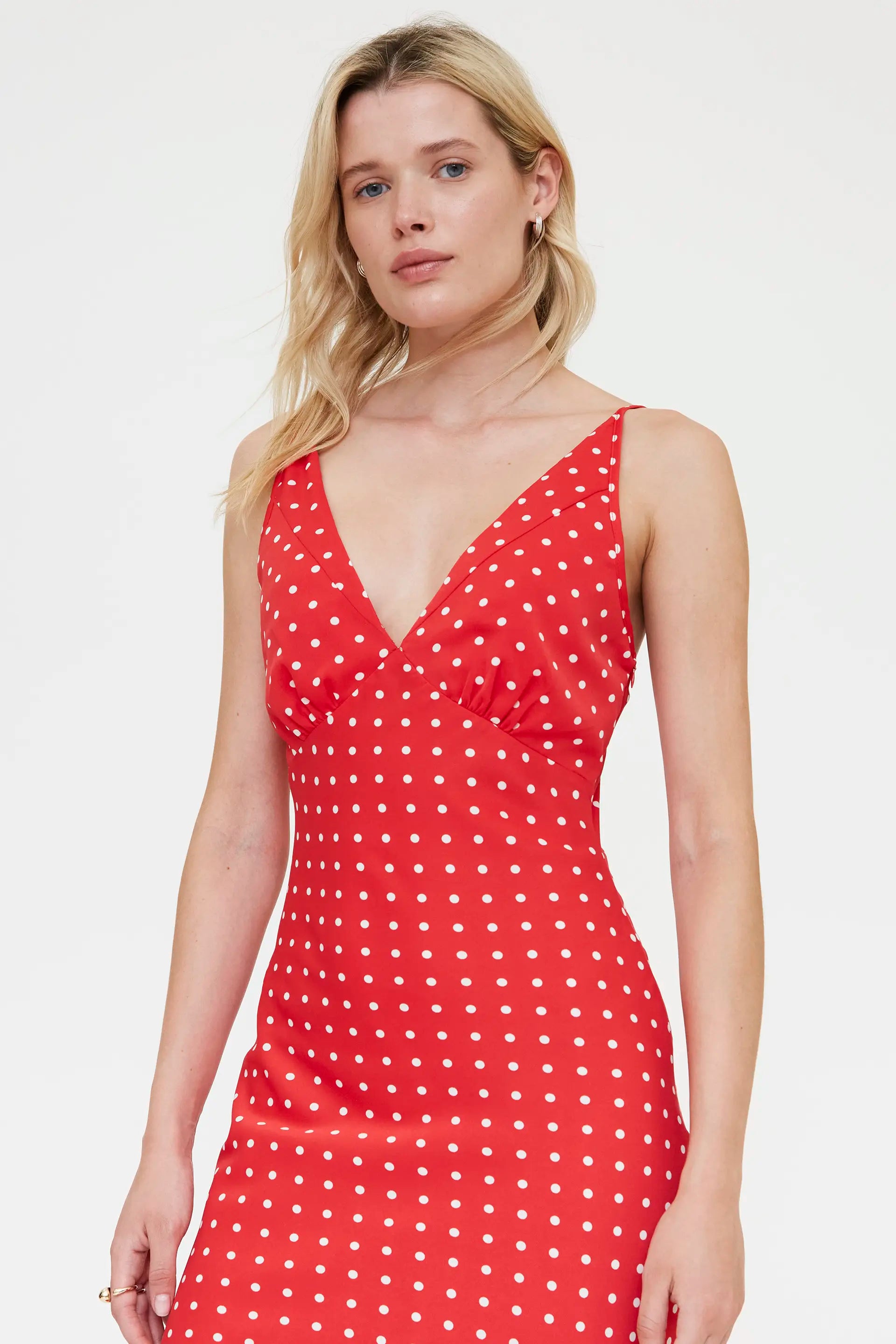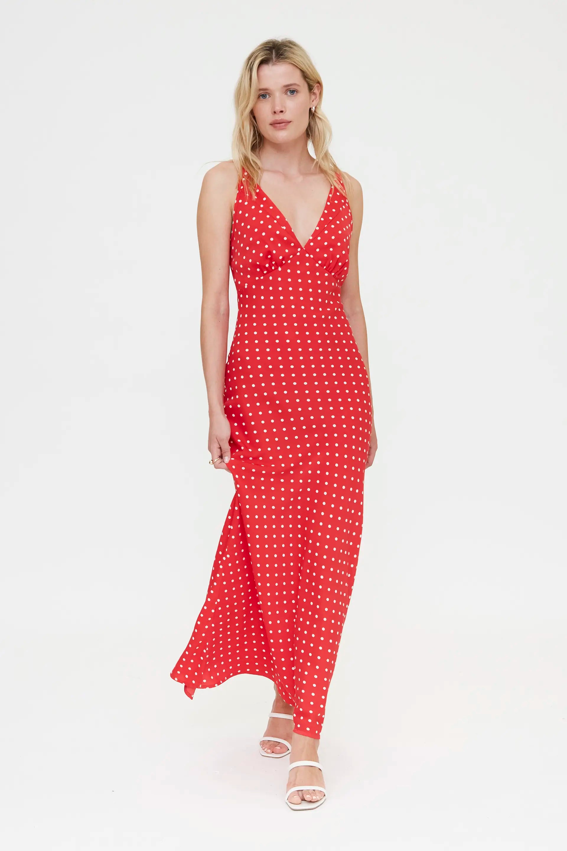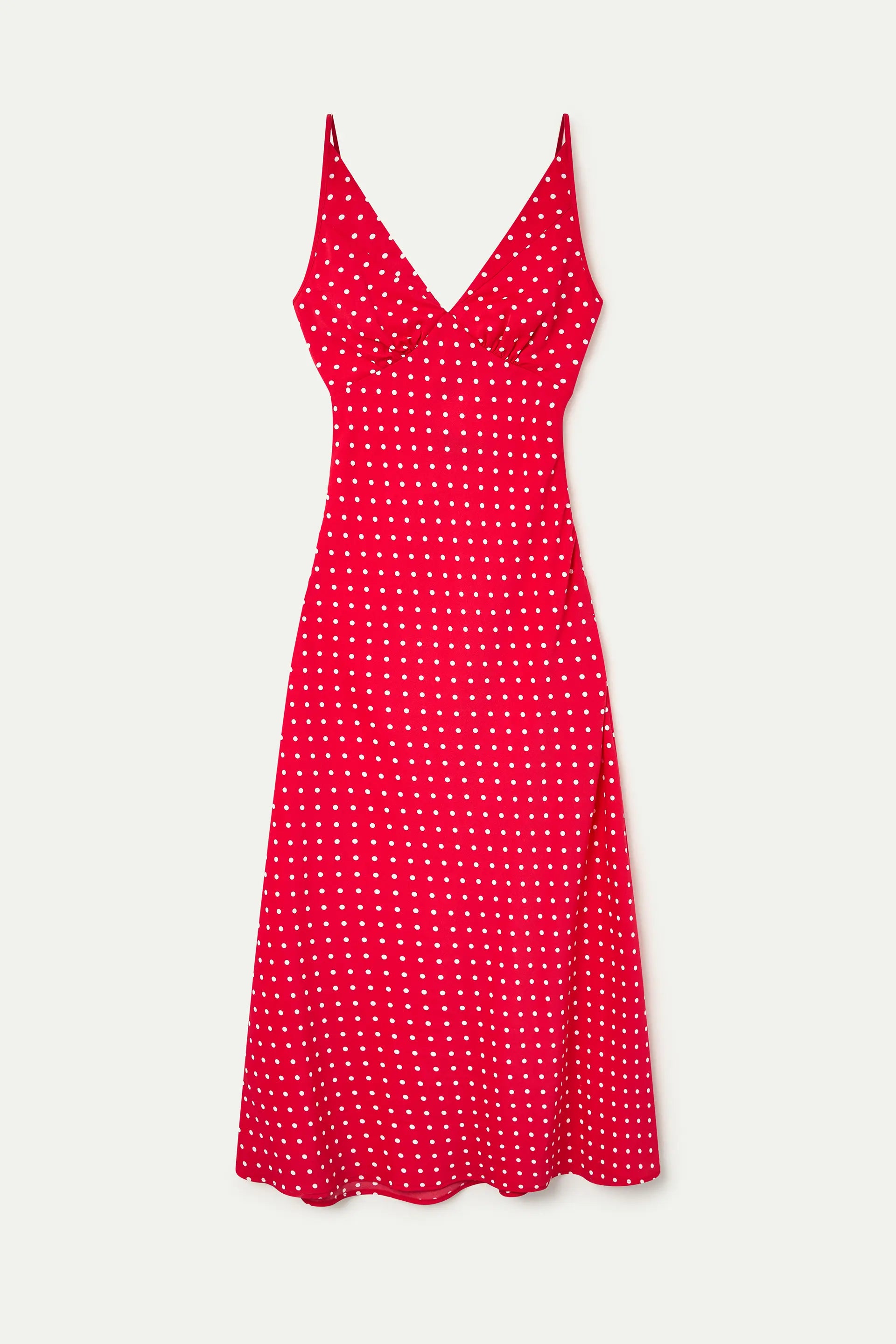 Abito lungo in crêpe rosso. Scollo a V e spalline sottili. Vestibilità fluida. La modella è alta 175 cm e indossa una taglia S.