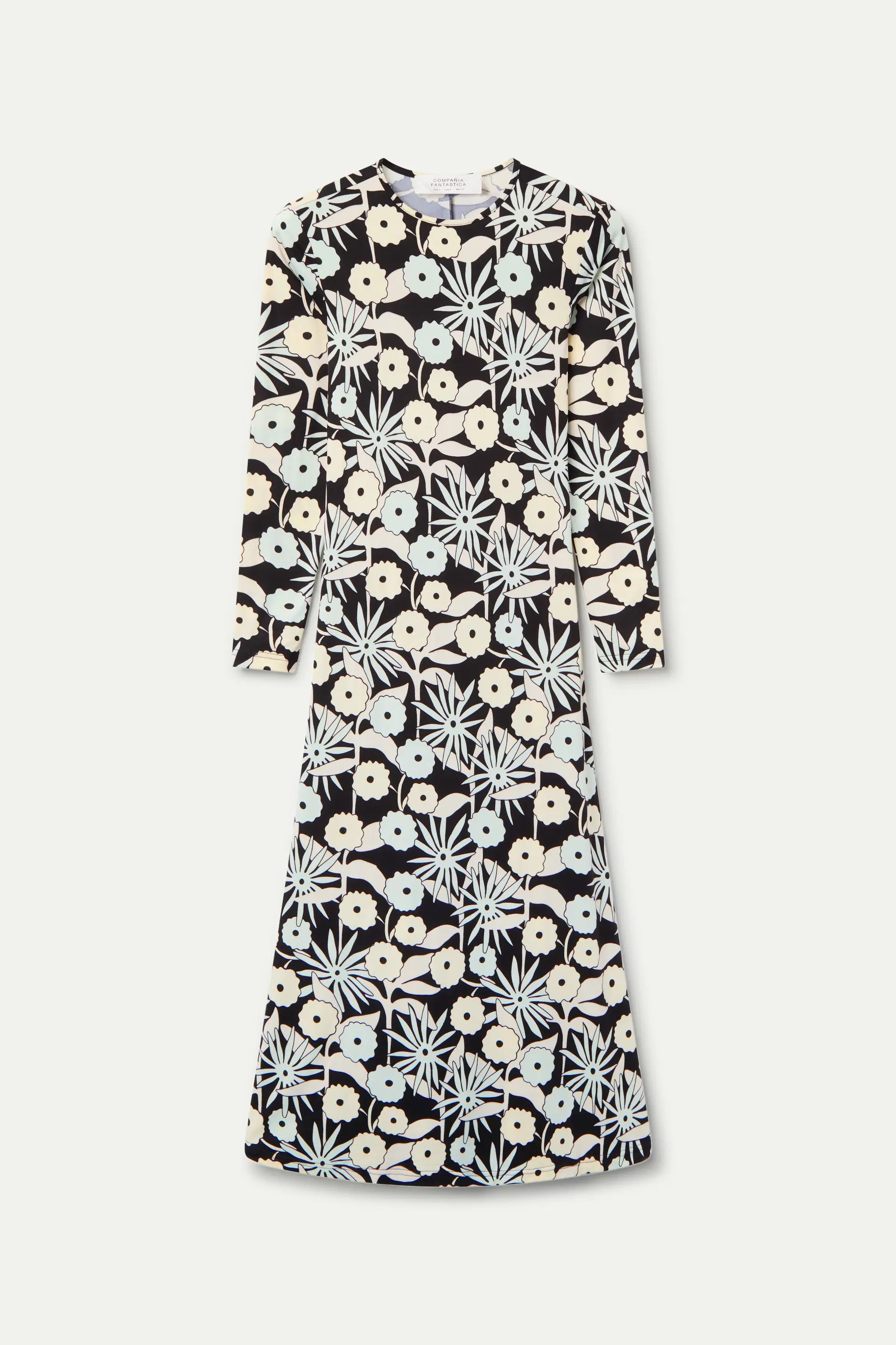 Abito lungo in maglia con stampa tofu. Presenta scollo a barca e maniche lunghe. La modella è alta 175 cm e indossa una taglia S.