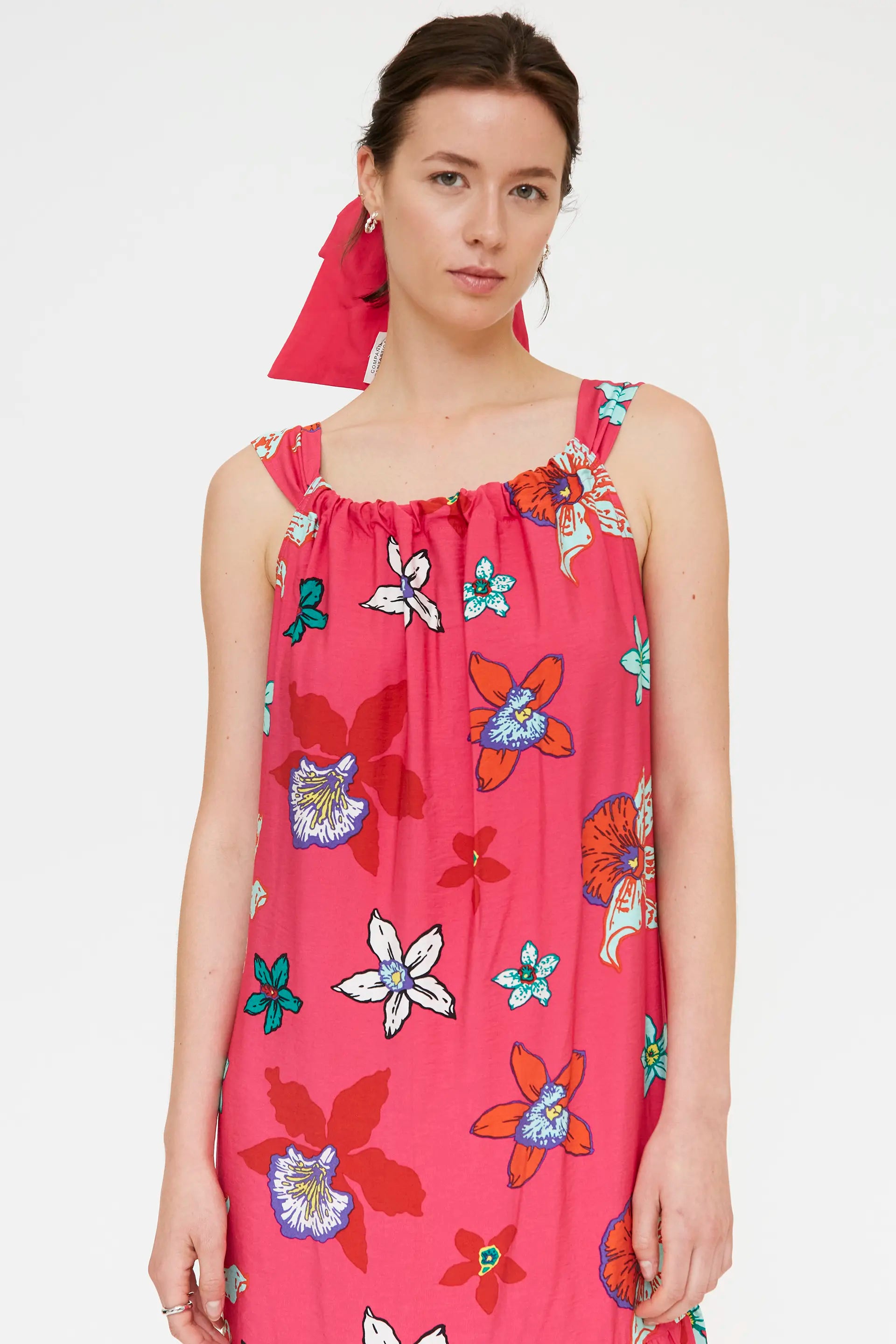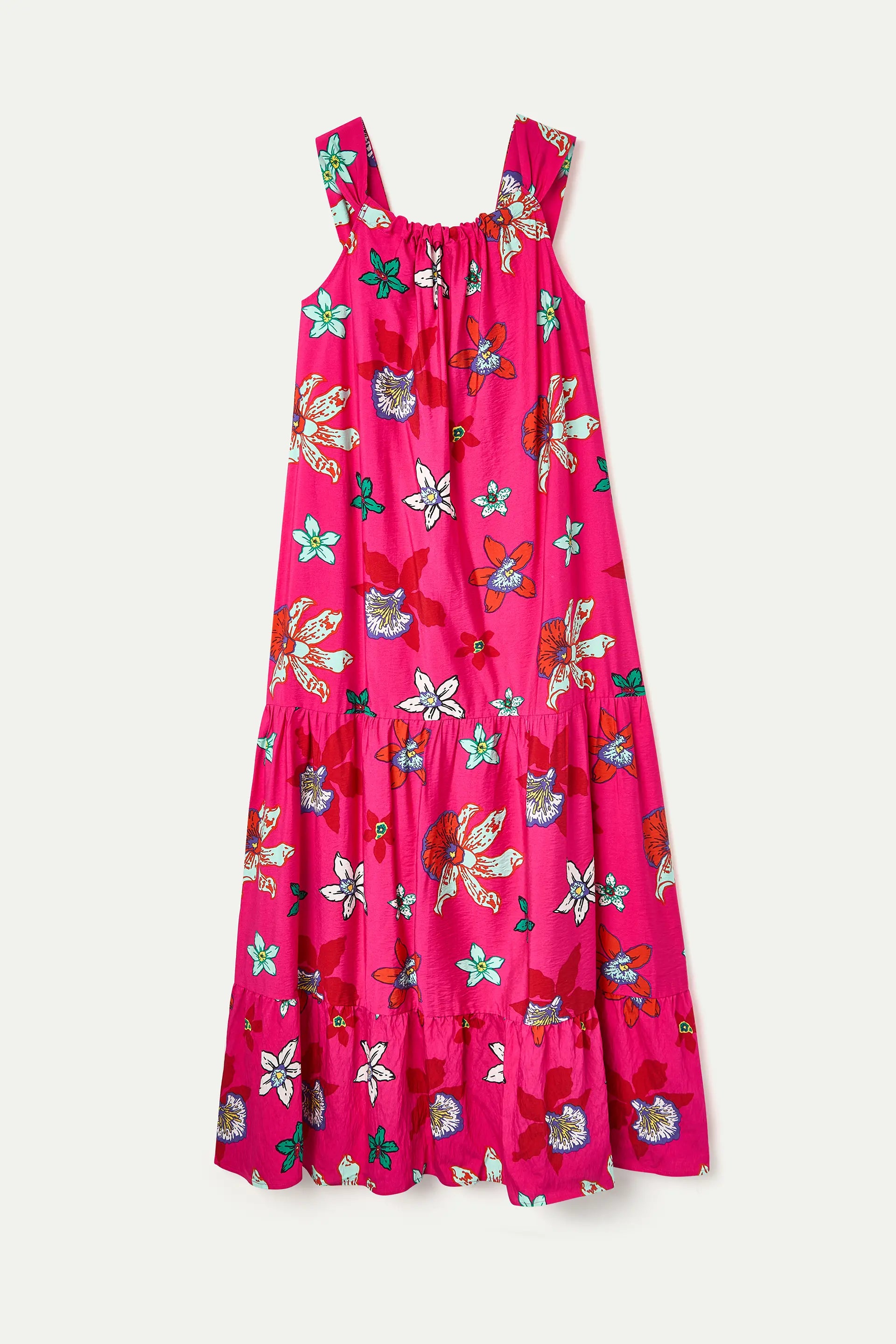 Abito lungo in crêpe con stampa Vanda. Scollo rotondo con spalline. Dettaglio volant sulla gonna. La modella è alta 177 cm e indossa una taglia S.