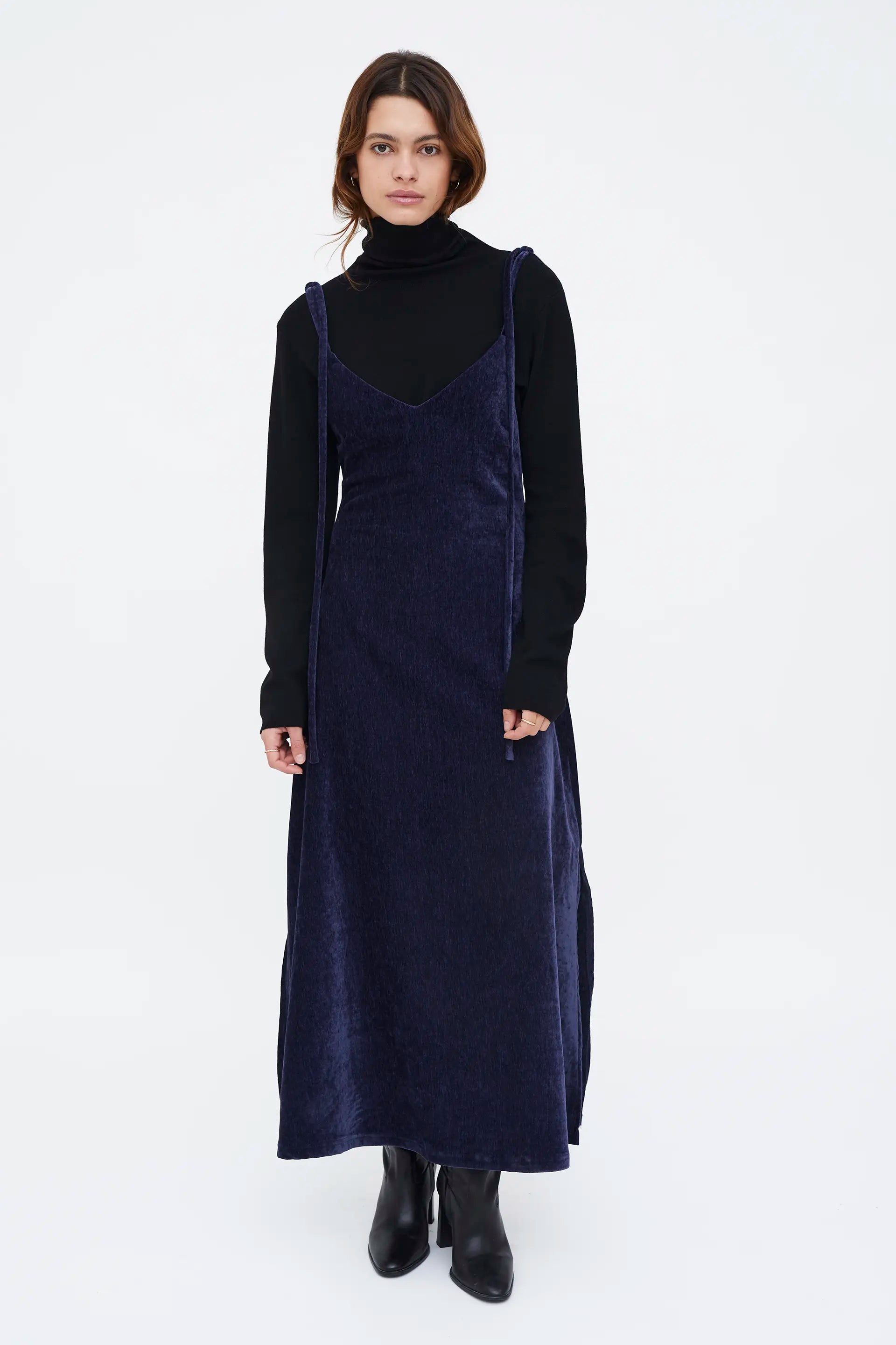 Abito lungo in velluto blu navy. Con scollo a V e spalline con lacci. Il modello presenta leggere pieghe. La modella è alta 174 cm e indossa una taglia S.