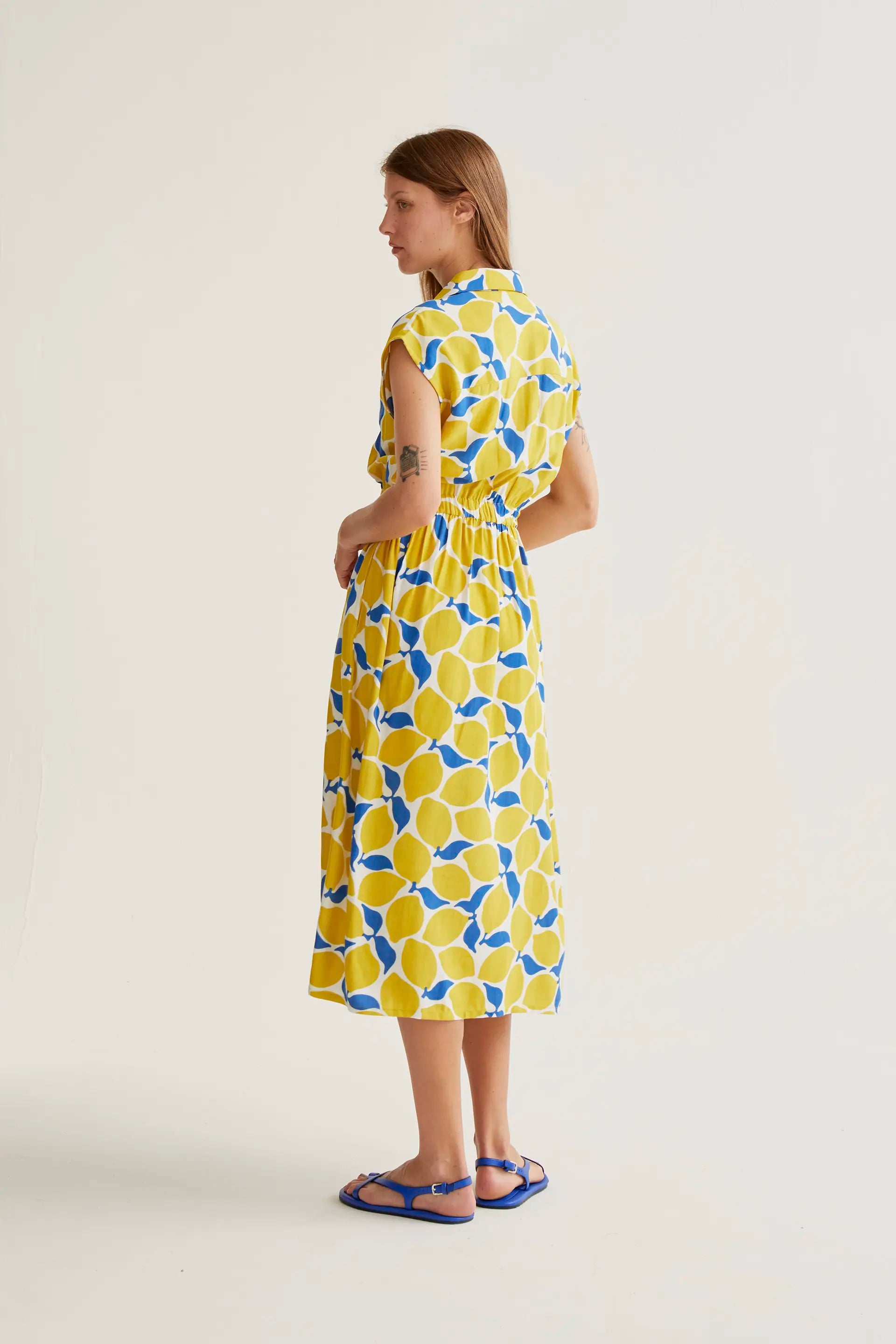 Abito con stampa limoncello. Collo a revers e senza maniche. Chiusura frontale con bottoni gialli. Vita elasticizzata regolabile. Tasche laterali. La modella è alta 177 cm e indossa una taglia S.