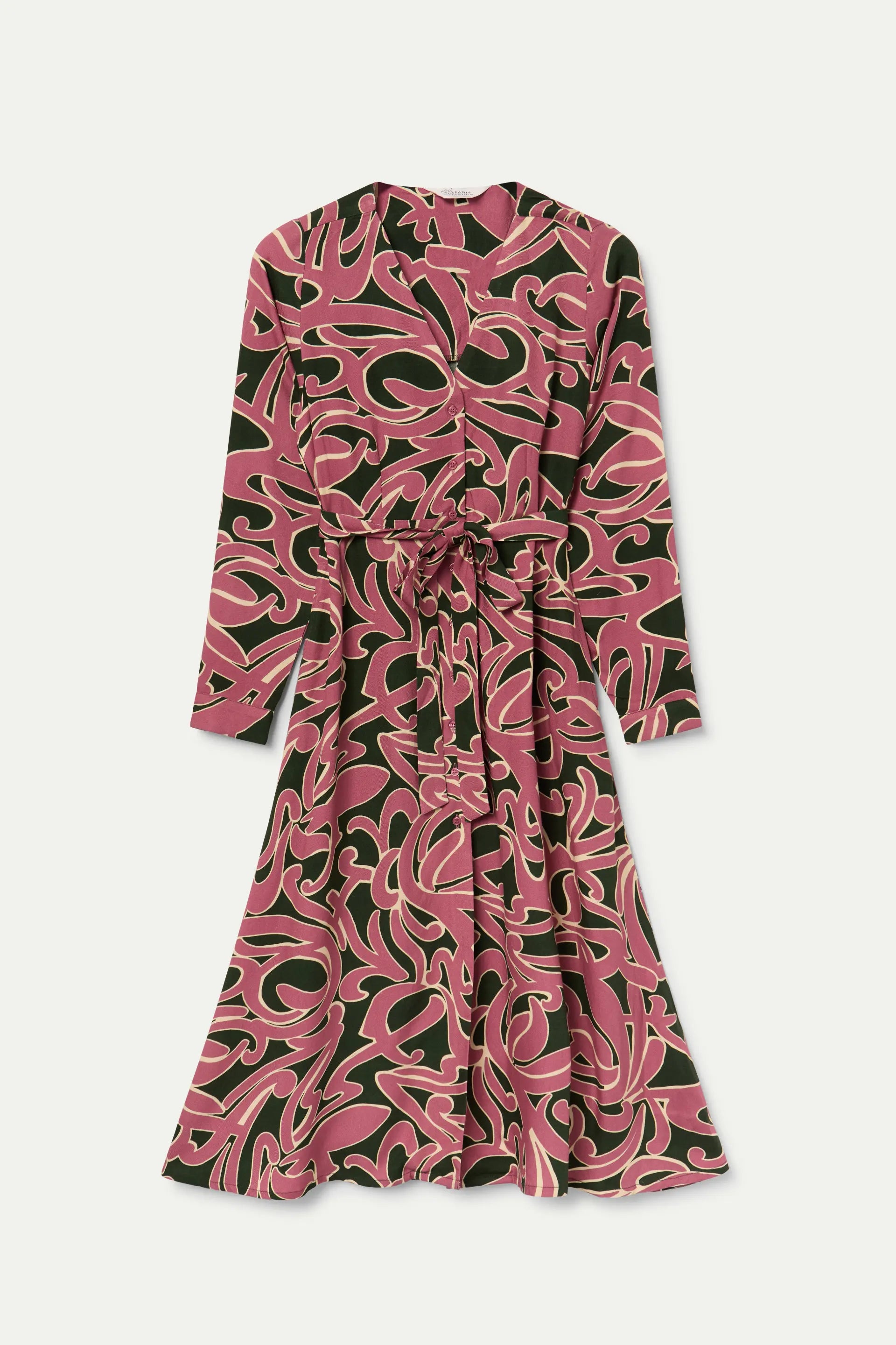Abito midi con stampa Pastures. Scollo a V e maniche lunghe con polsini abbottonati. Chiusura frontale con bottoni e cintura in vita. La modella è alta 177 cm e indossa una taglia S.