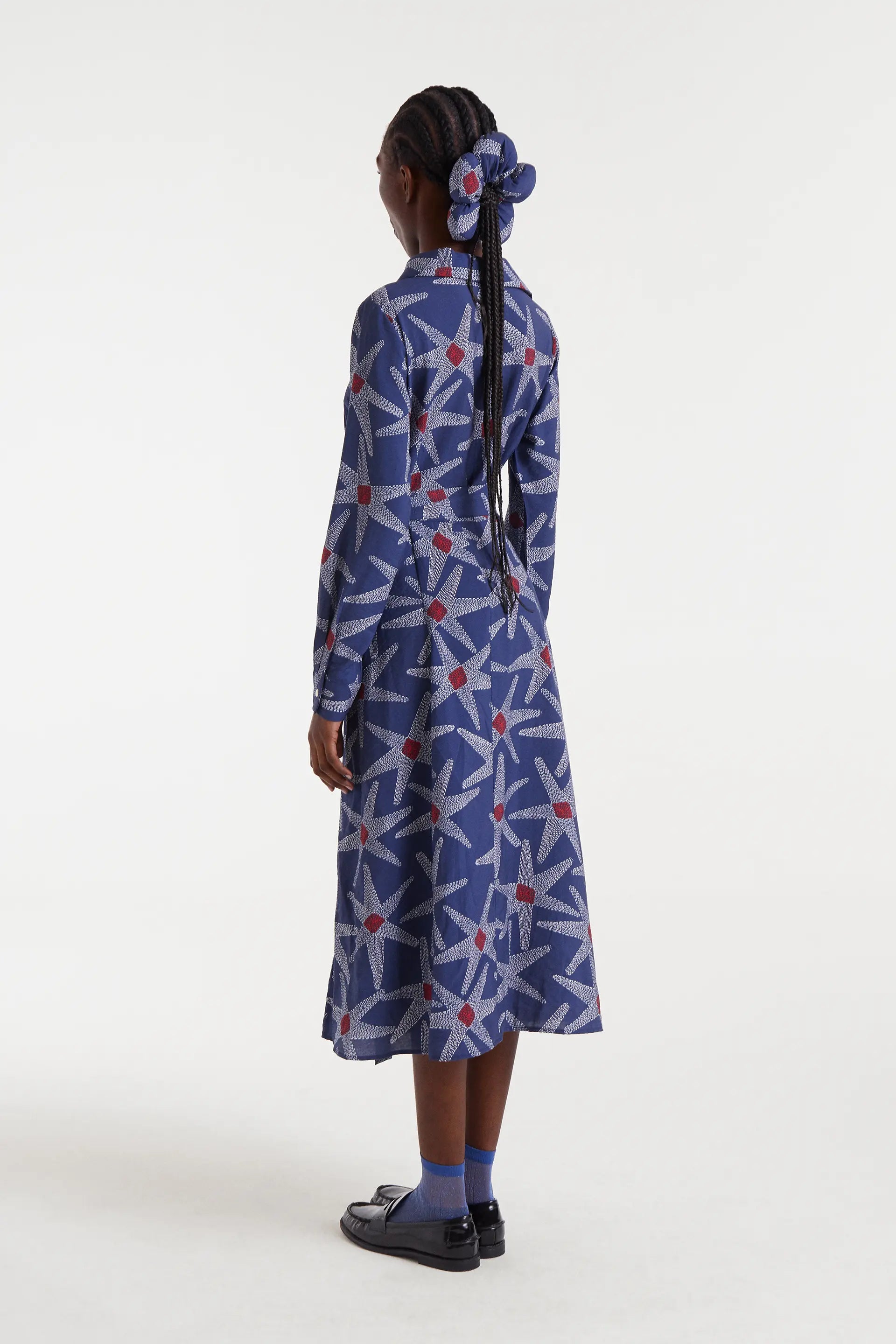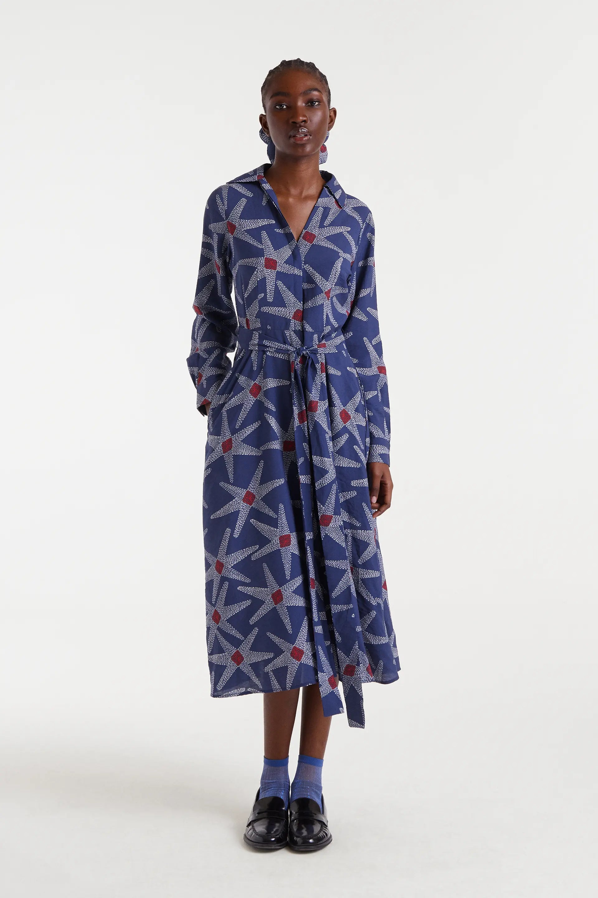 Abito midi in leggero tessuto crêpe con stampa Starship. Presenta scollo a V e maniche lunghe con polsini abbottonati. Chiusura frontale con bottoni nascosti e cintura in vita. La modella è alta 178 cm e indossa una taglia S.