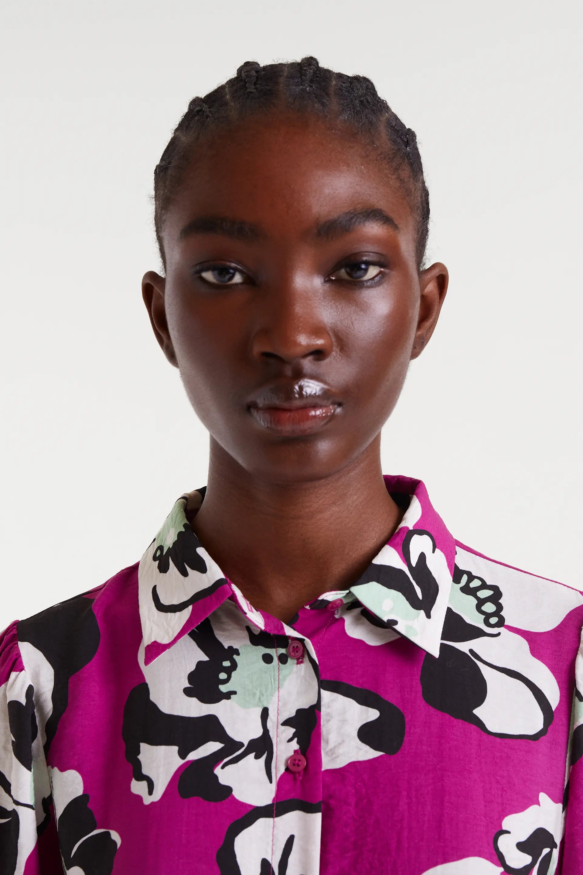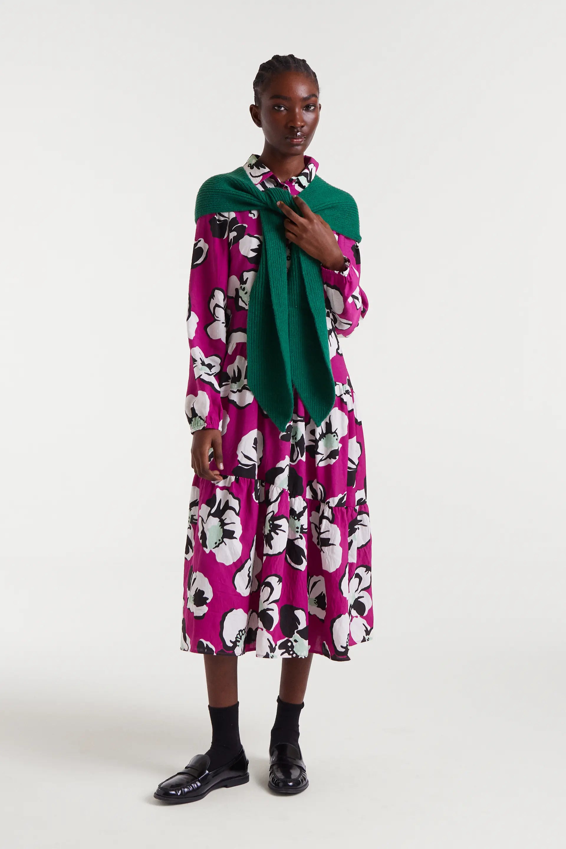 Abito midi in leggero tessuto crêpe con stampa Vivid Viola. Collo a revers e maniche lunghe con polsini elasticizzati. Chiusura frontale con bottoni. Dettagli asimmetrici sulla gonna. La modella è alta 178 cm e indossa una taglia S.