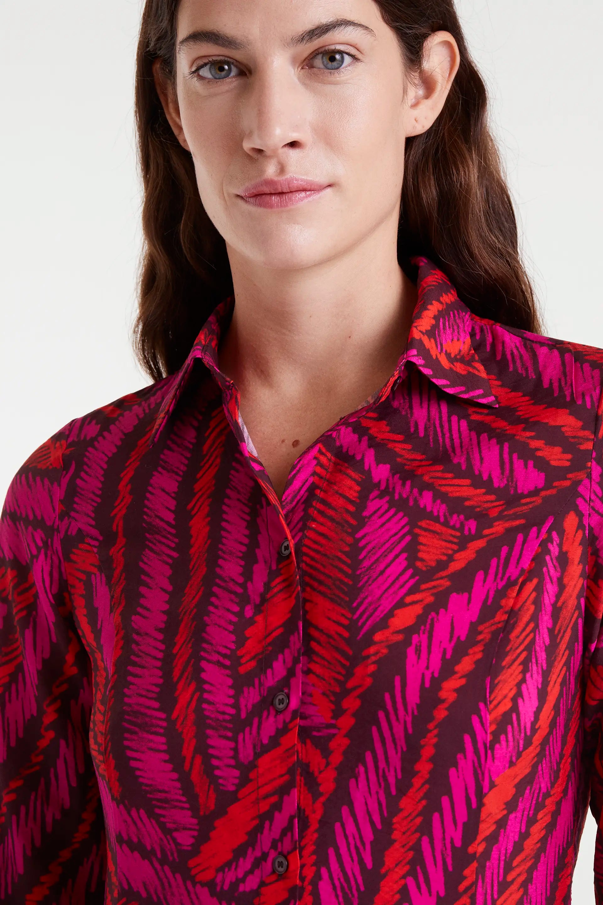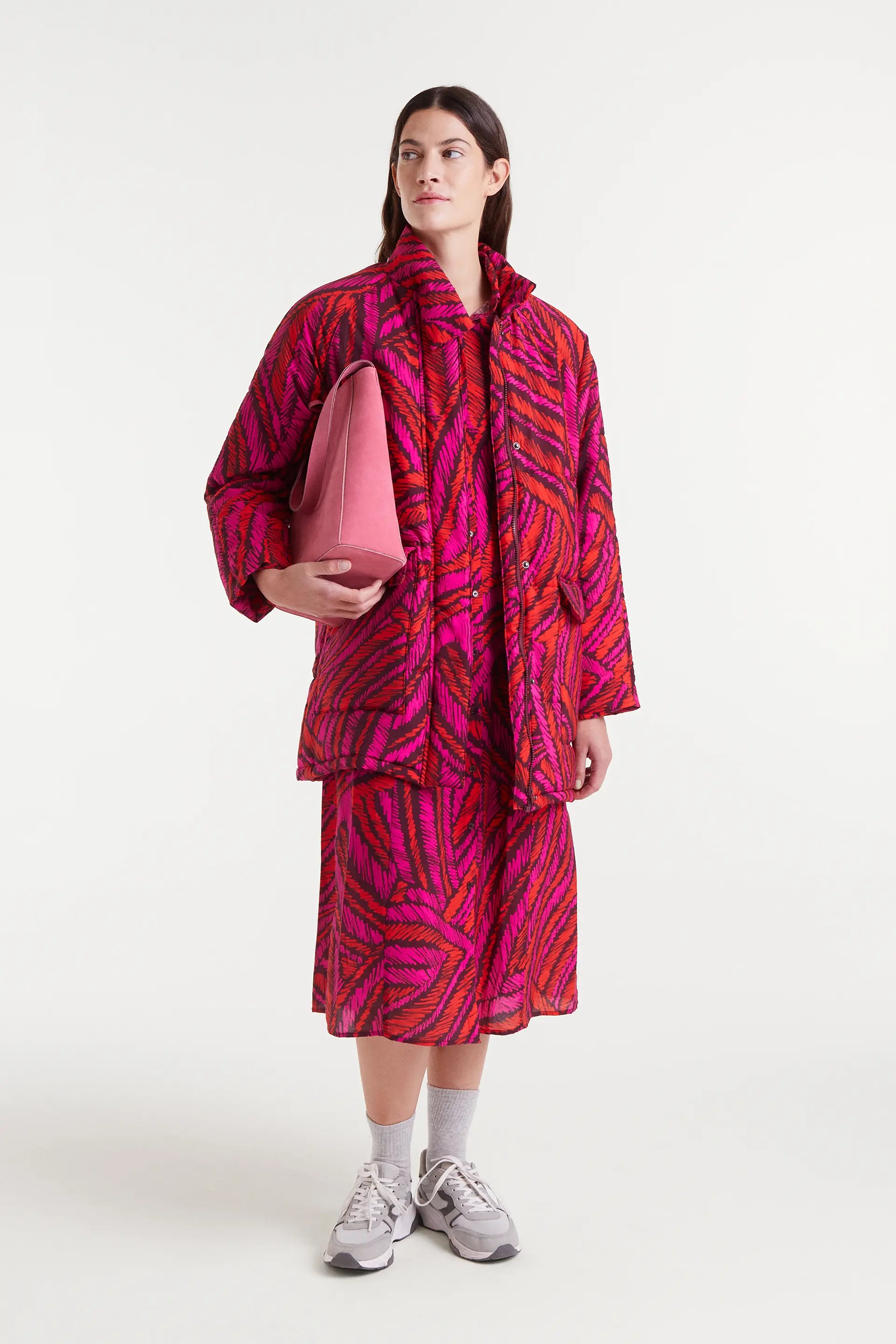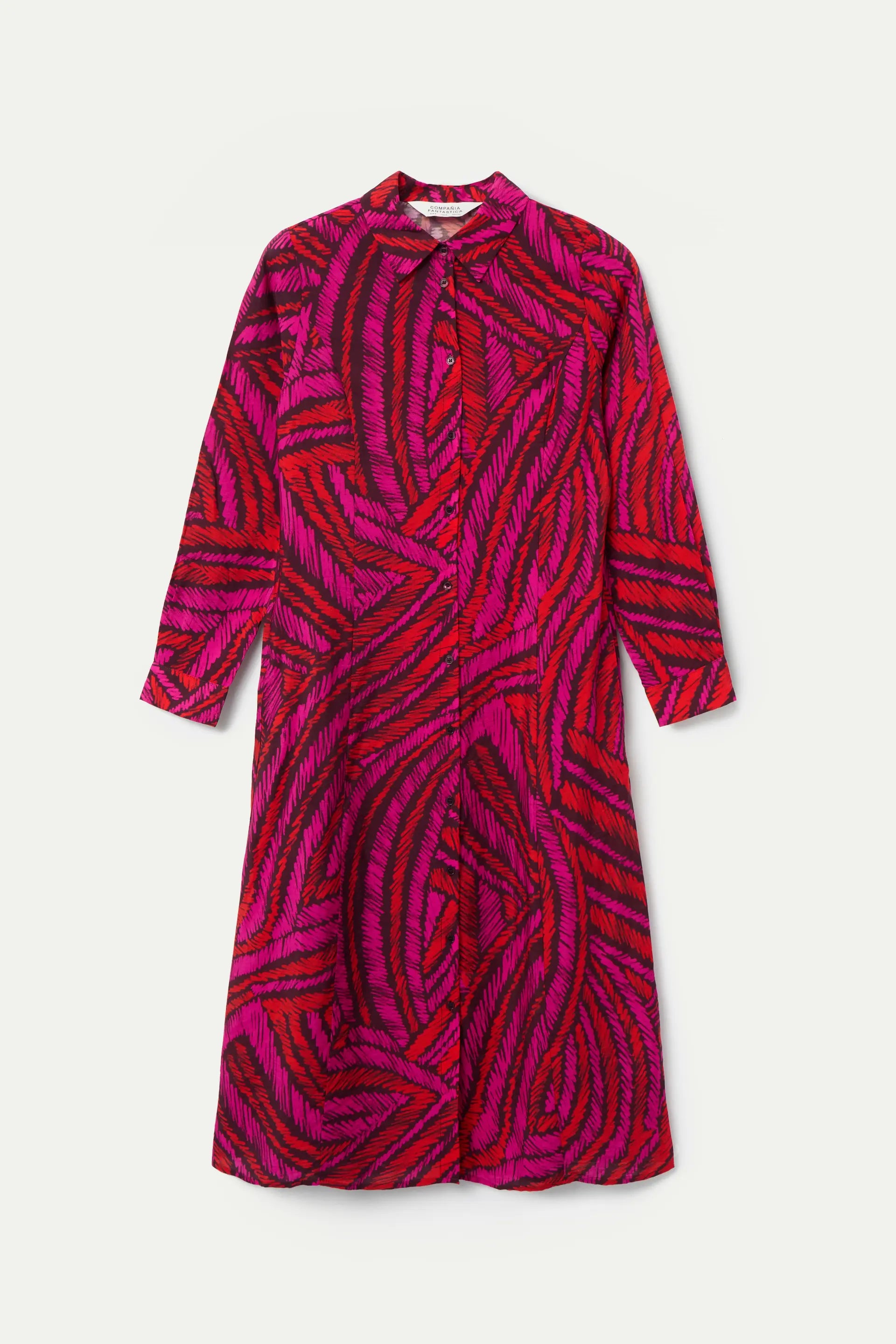 Abito midi in tessuto crêpe leggero con stampa fedora. Collo a revers, maniche lunghe con polsini con bottone, chiusura frontale con bottoni e coulisse regolabile in vita sul retro. Tasche laterali. La modella è alta 177 cm e indossa una taglia S.