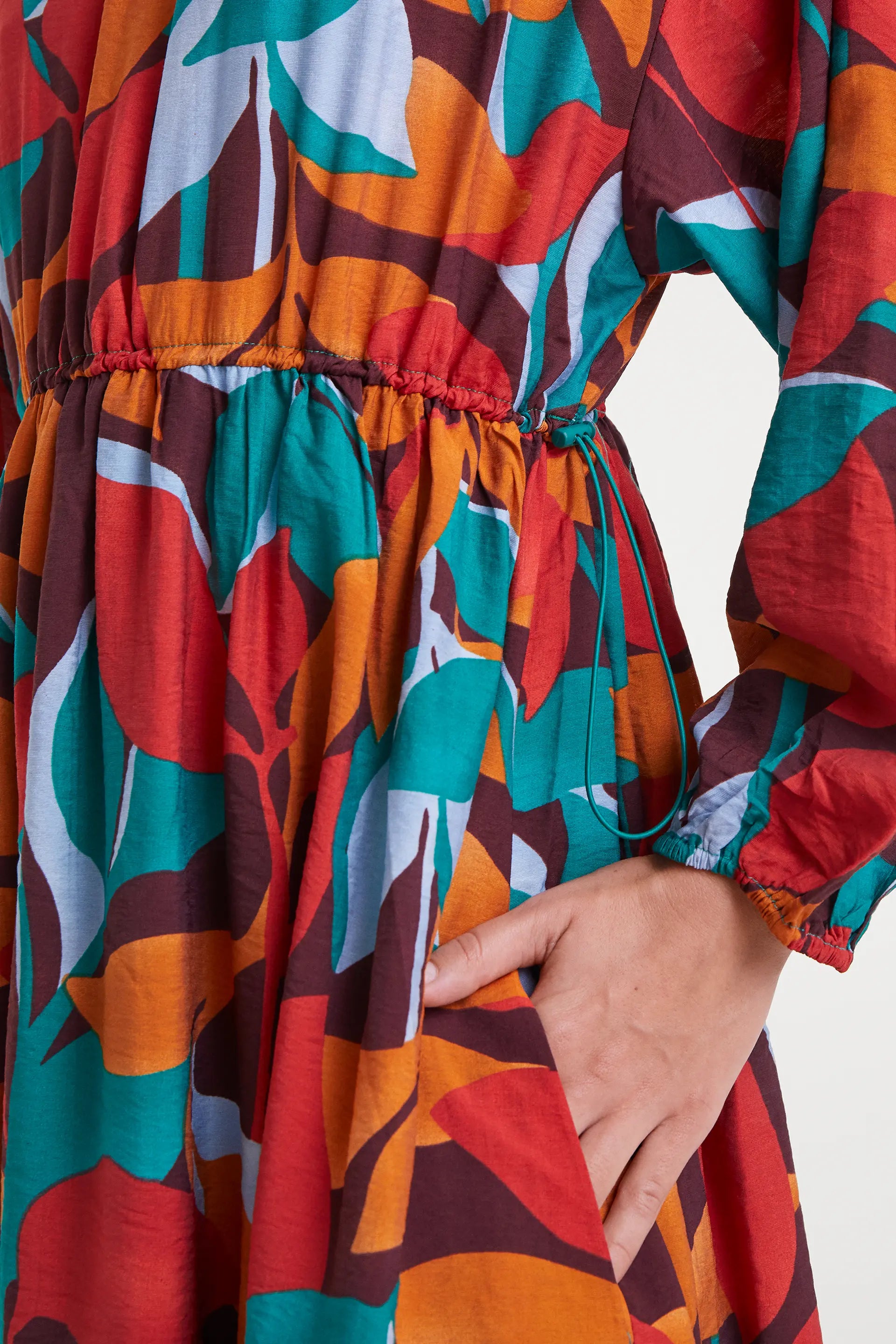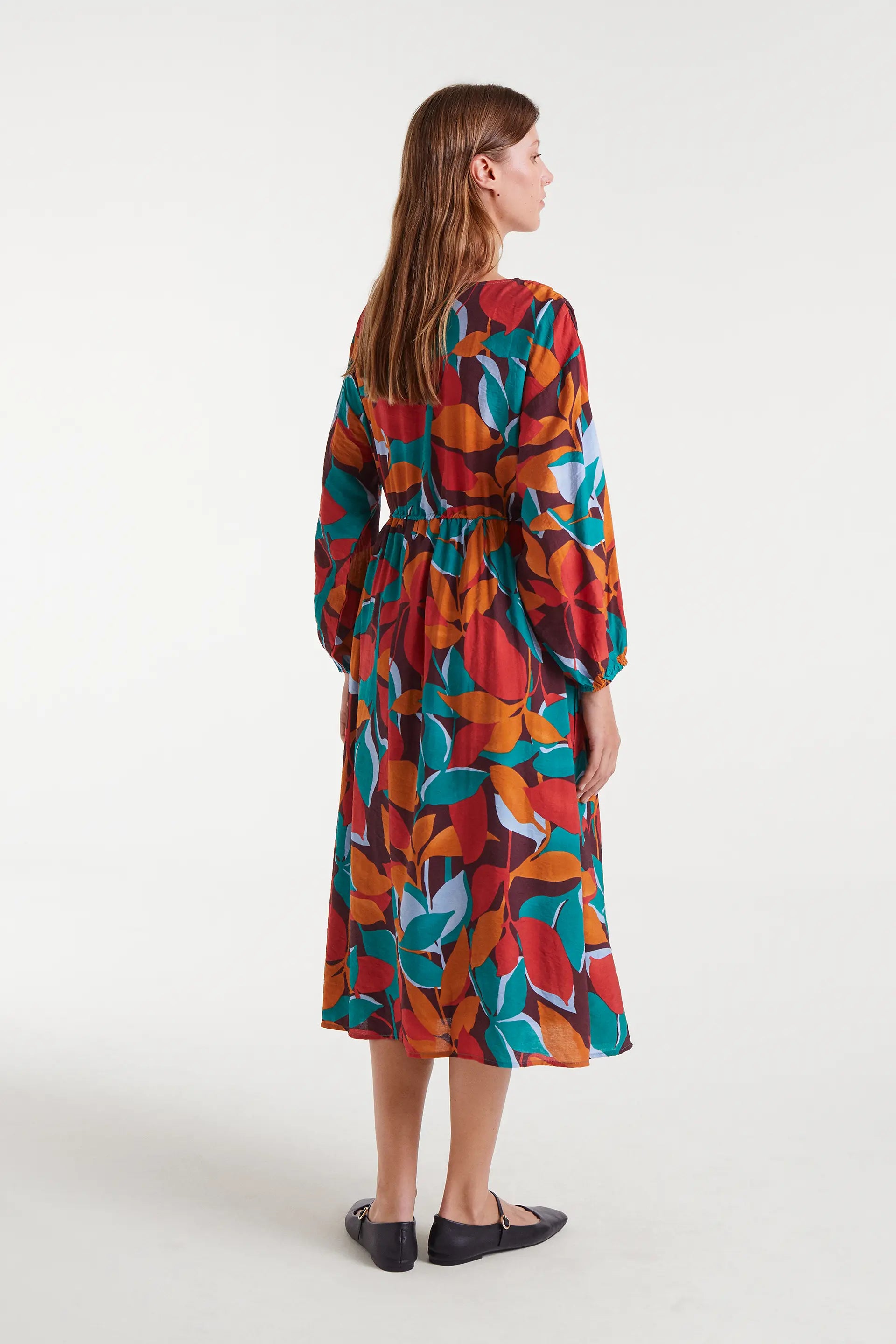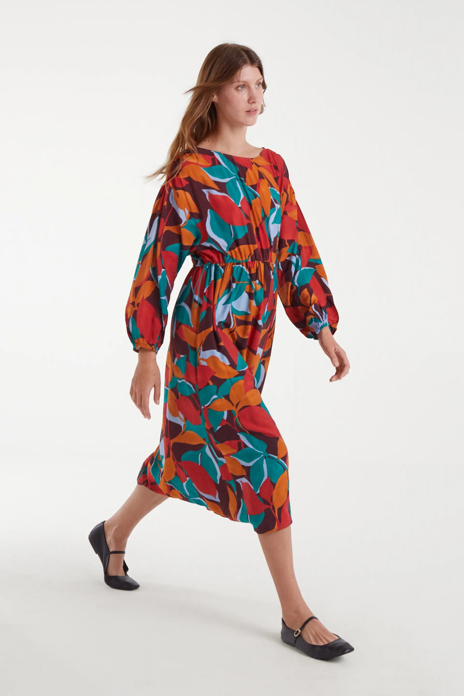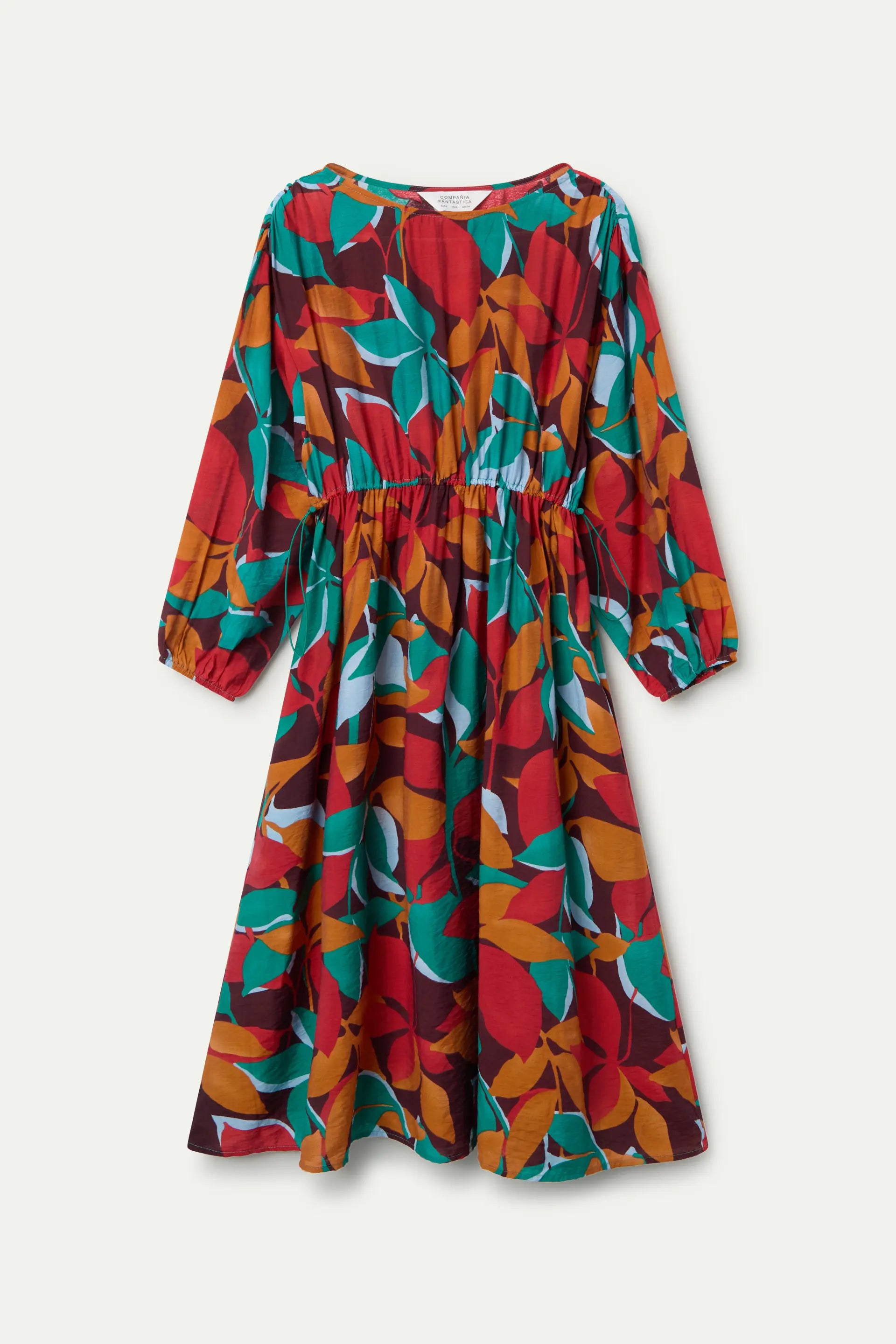 Abito midi in leggero tessuto crêpe con stampa Ponziana. Presenta scollo a barca, elastico in vita regolabile e maniche lunghe con polsini elastici. La modella è alta 177 cm e indossa una taglia S.