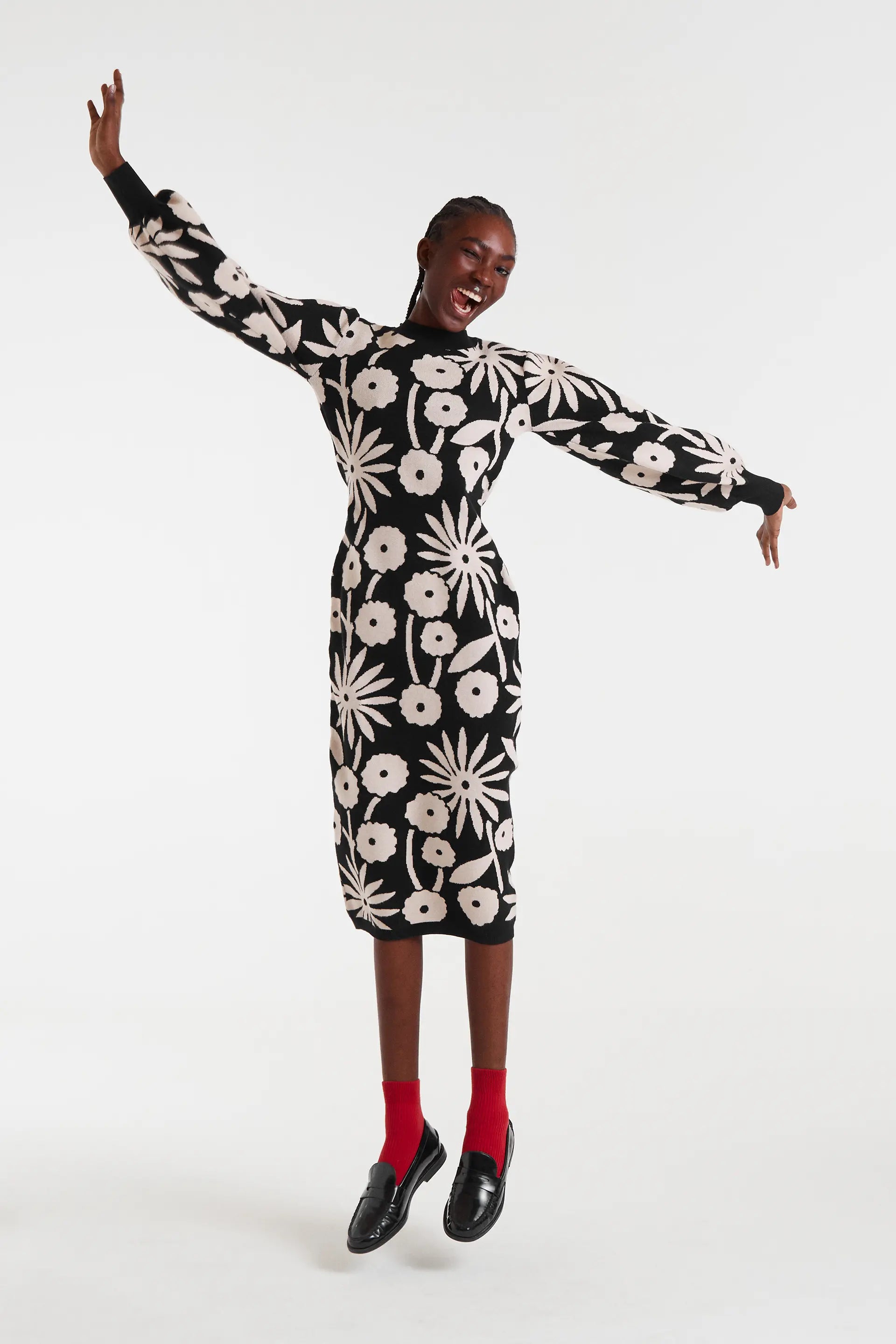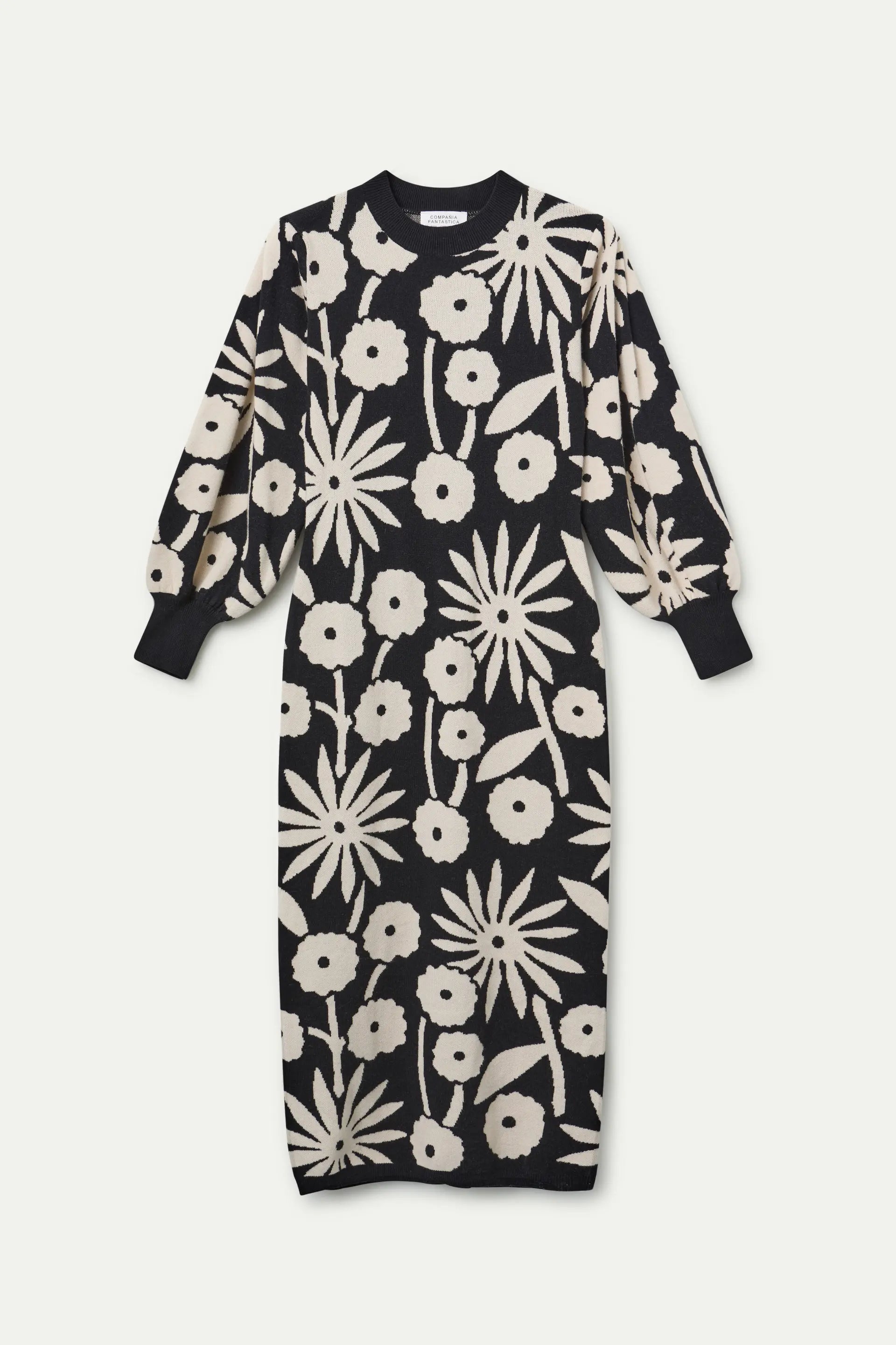 Abito midi in jacquard con stampa tofu. Scollo rotondo e maniche lunghe a sbuffo. Dettagli a coste. La modella è alta 178 cm e indossa una taglia S.