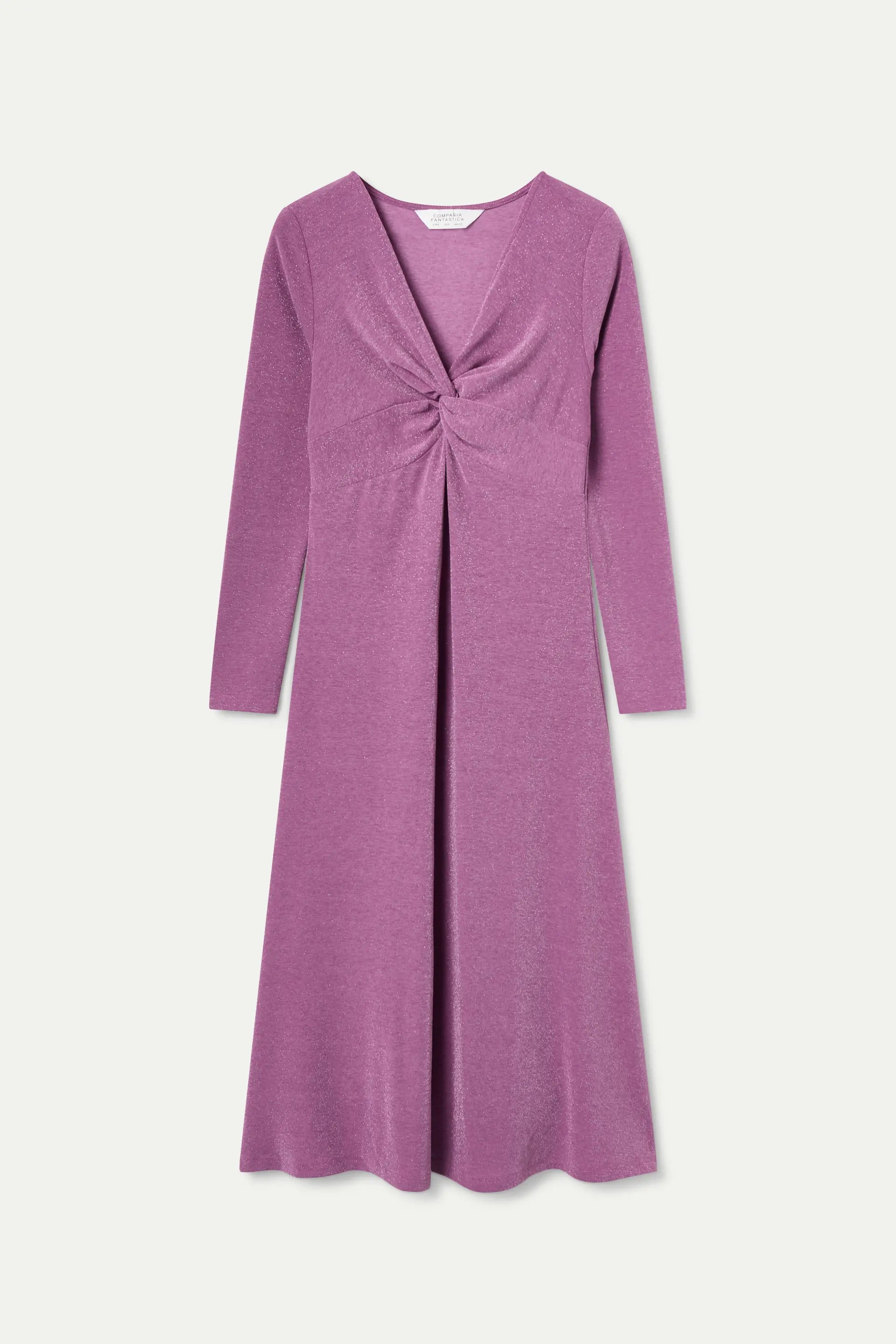Abito midi in jersey lurex lilla. Scollo a V con fiocco e maniche lunghe. La modella è alta 177 cm e indossa una taglia S.