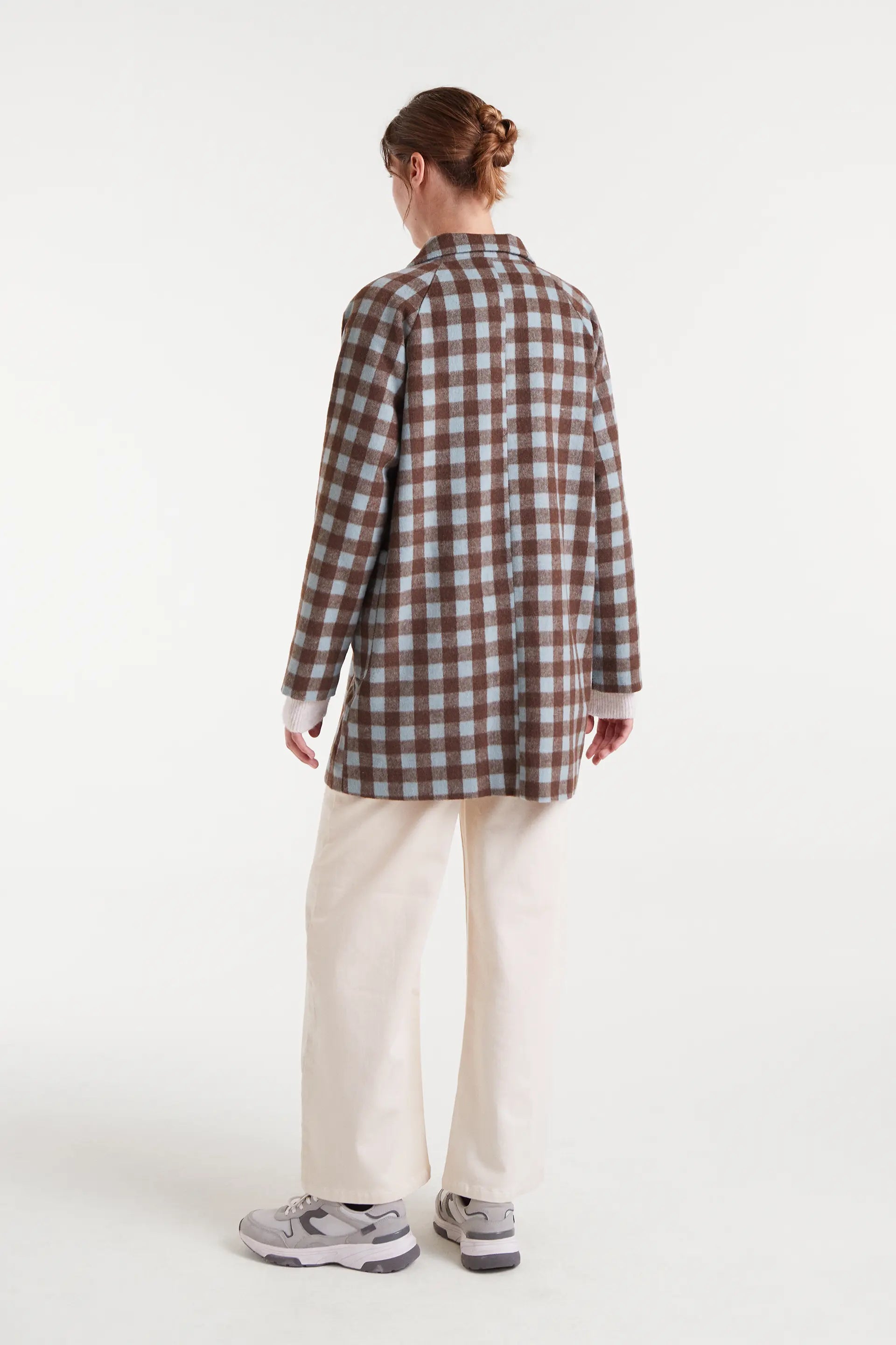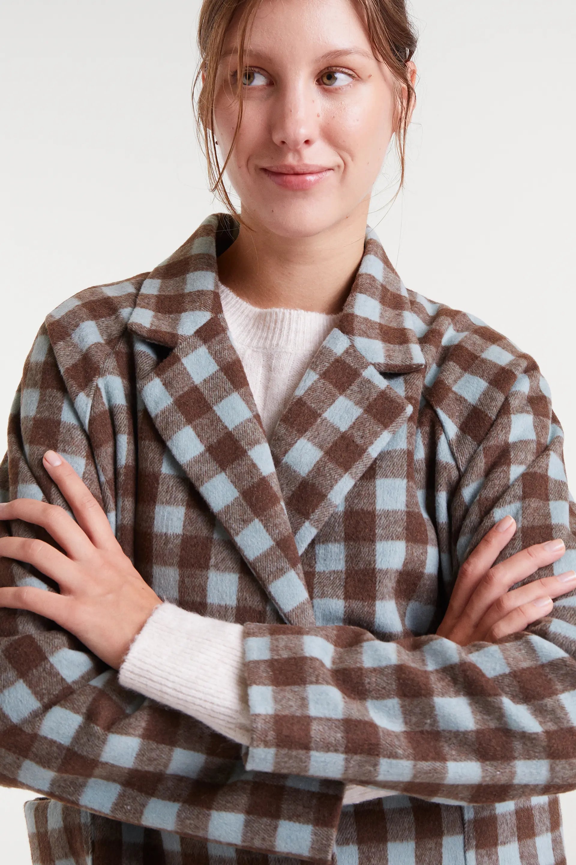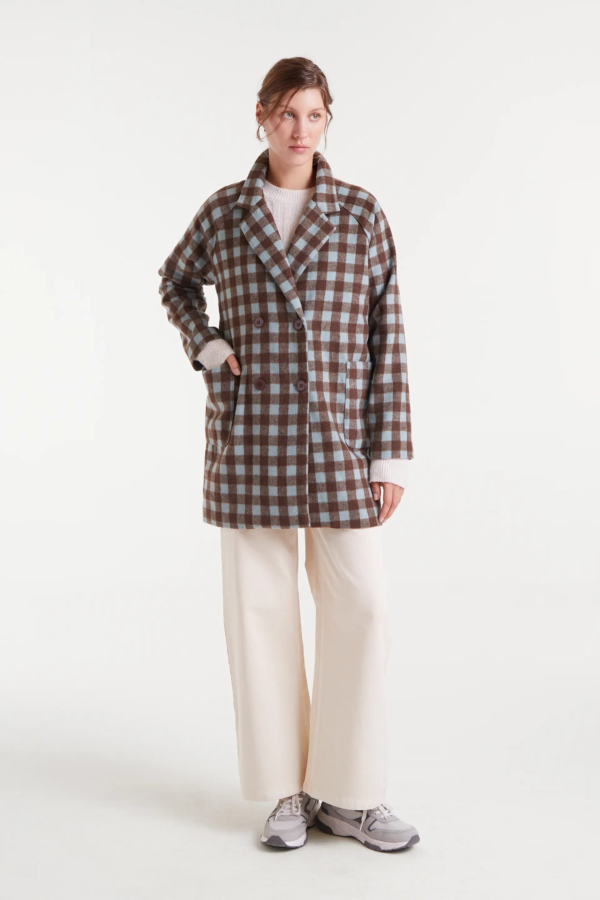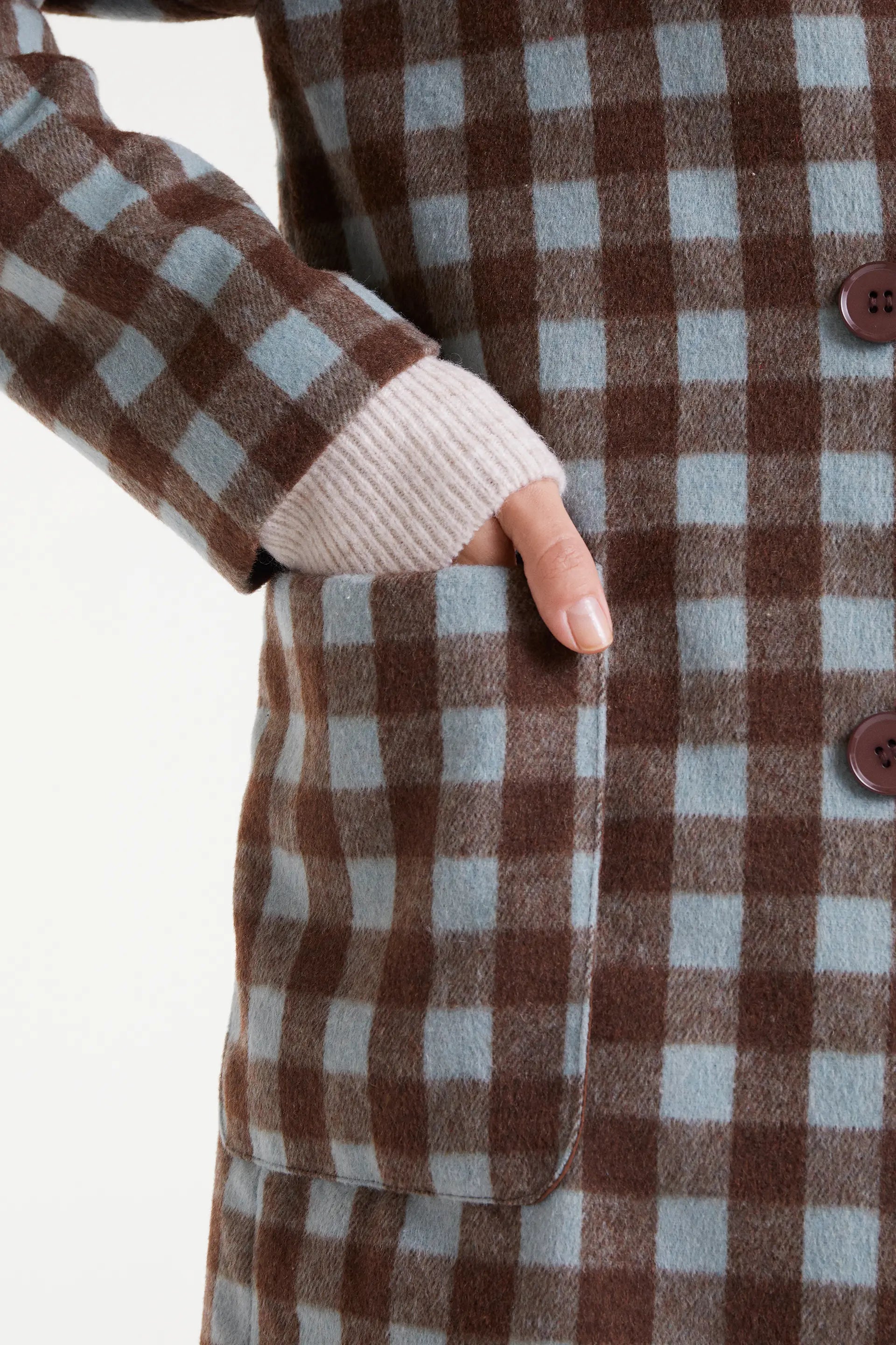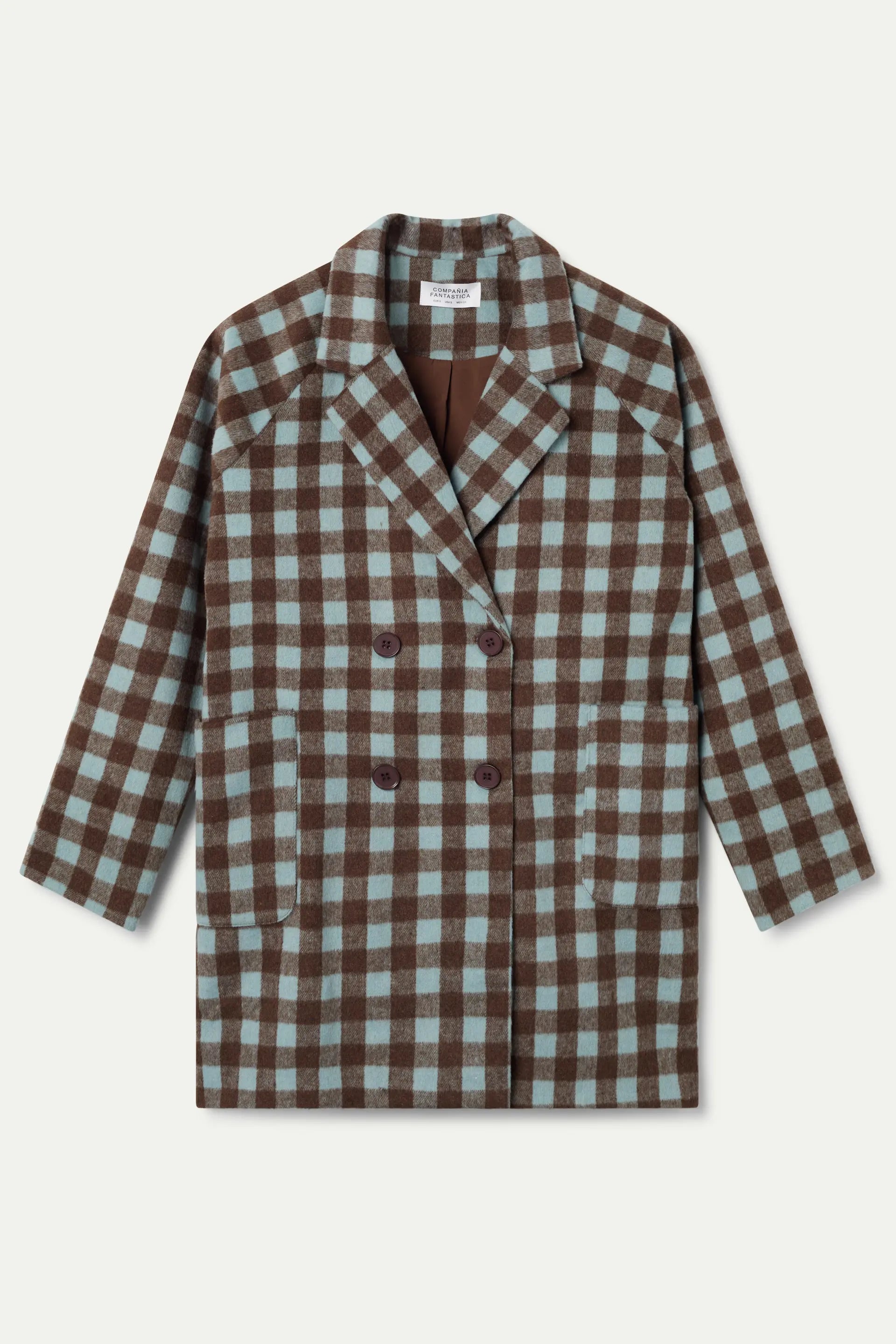 Abrigo de cuadros color marrón. Cuello pico con manga larga y cierre frontal con botones. Bolsillos frontales. La modelo mide 177 cm y lleva la talla S.
