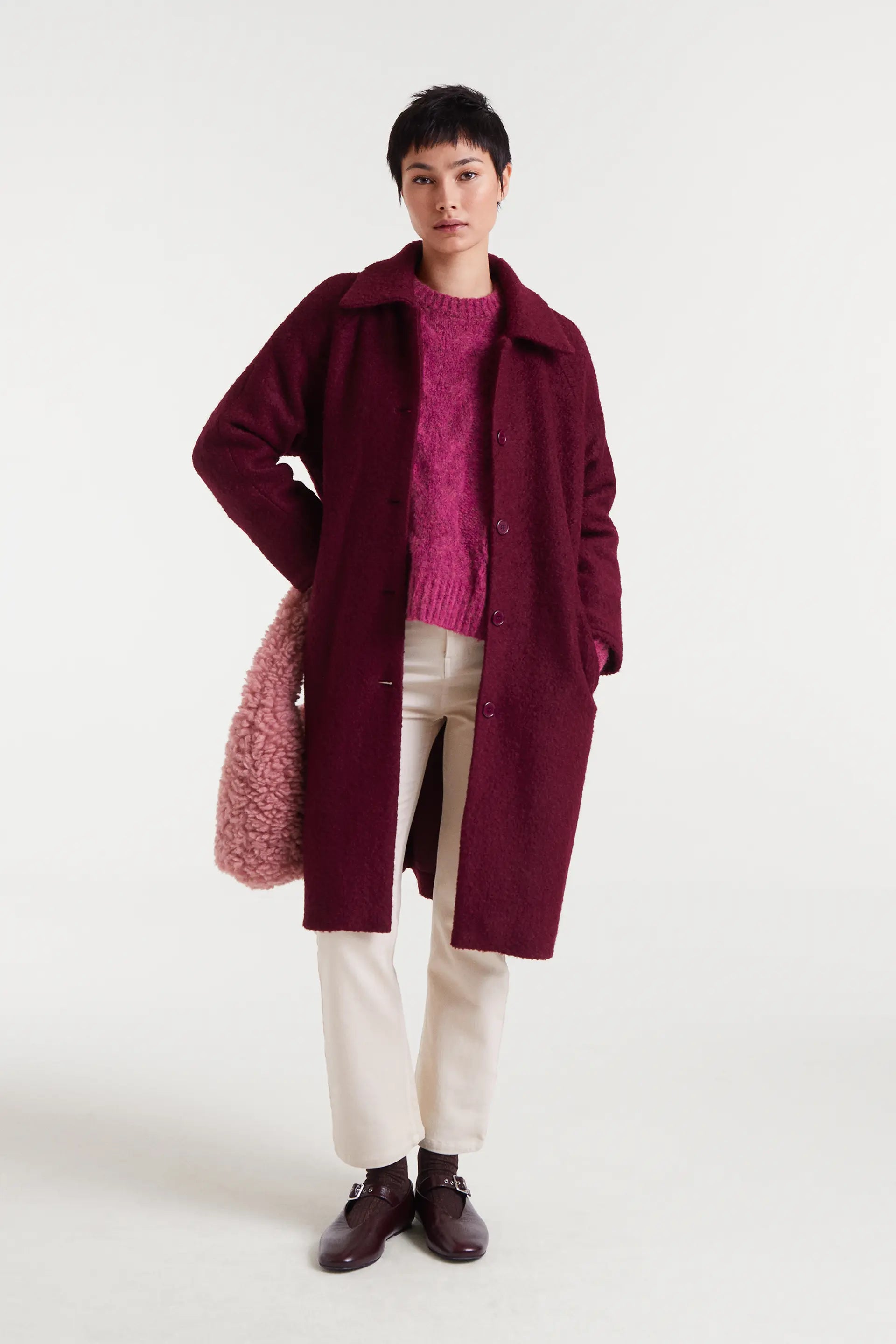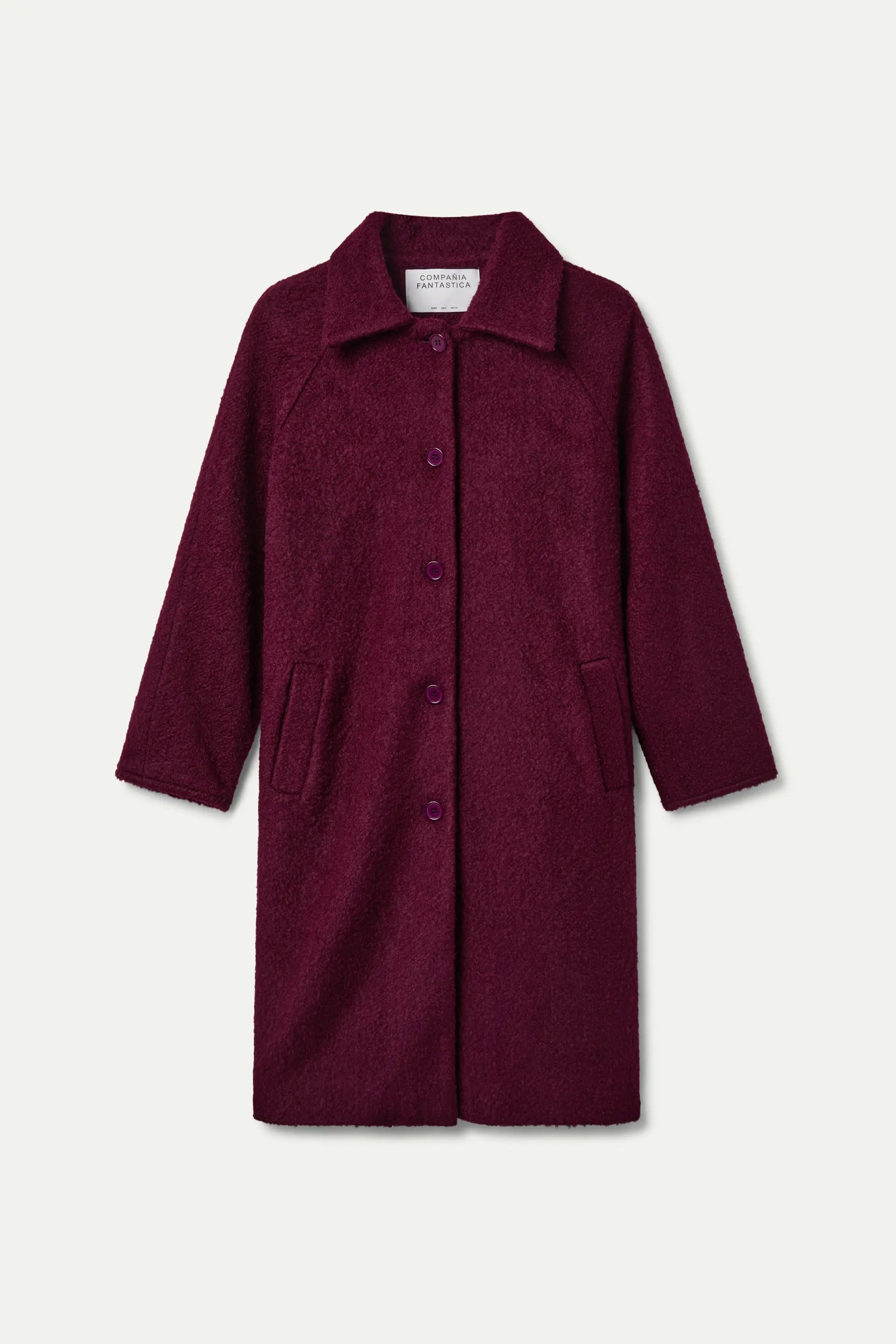 Abrigo largo de color magenta. Cuello solapa y manga larga. Cierre frontal con botones. Bolsillos frontales. Forro interior. La modelo mide 177 cm y lleva la talla S.