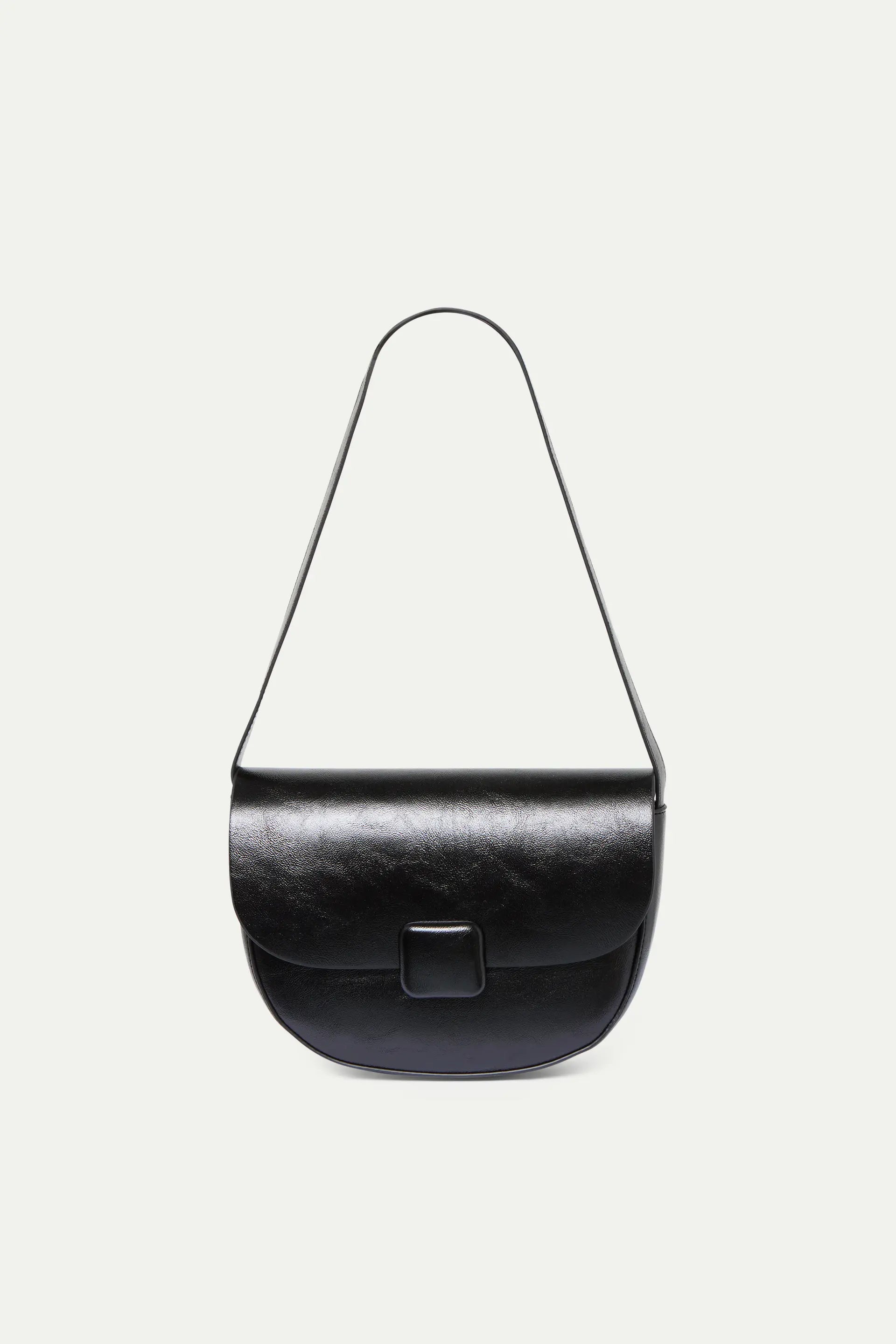 Bolso de hombro con piel sintética de color negro. Cierre magnético y bolsillo interior. Asa corta.