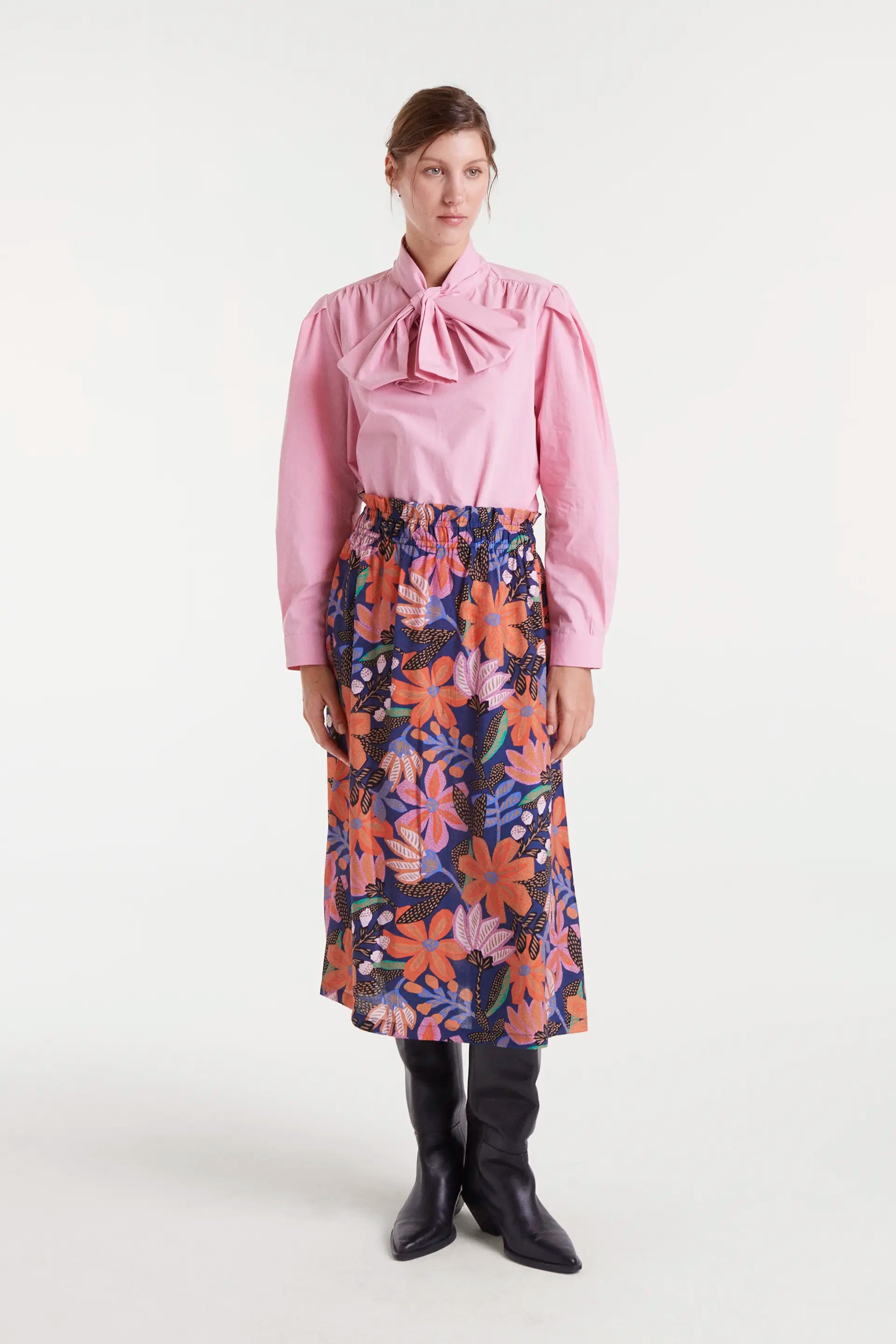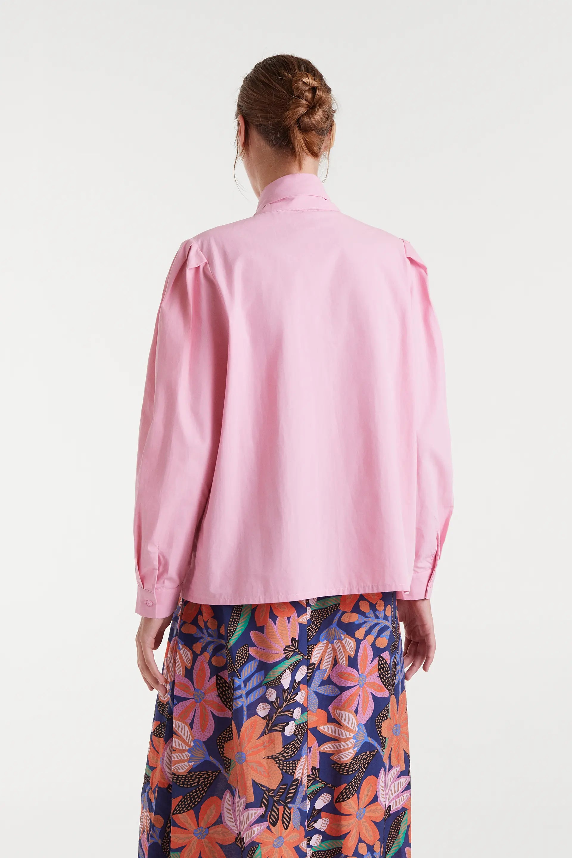 Camisa con tejido 100% algodón de color rosa. Con cuello lazado grande y manga larga terminada en puño con botón. La modelo mide 177 cm y lleva la talla S.