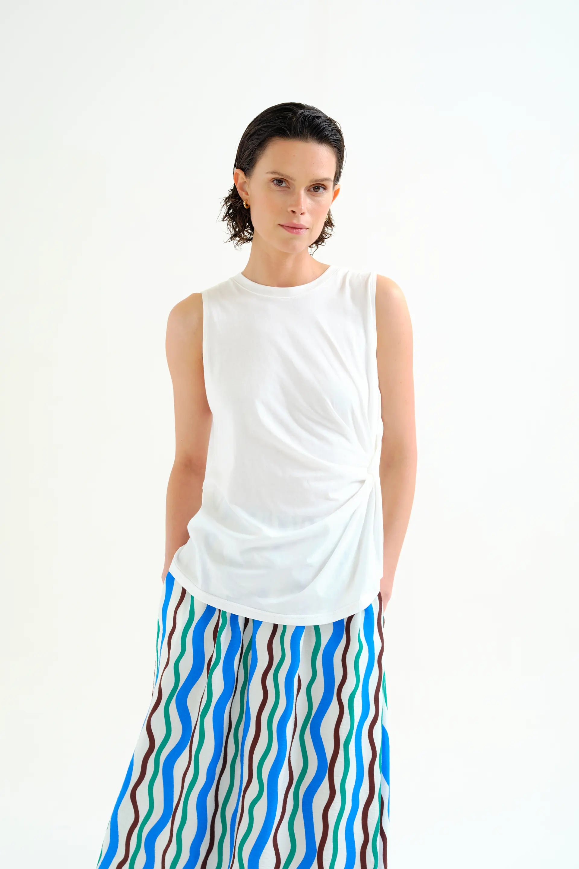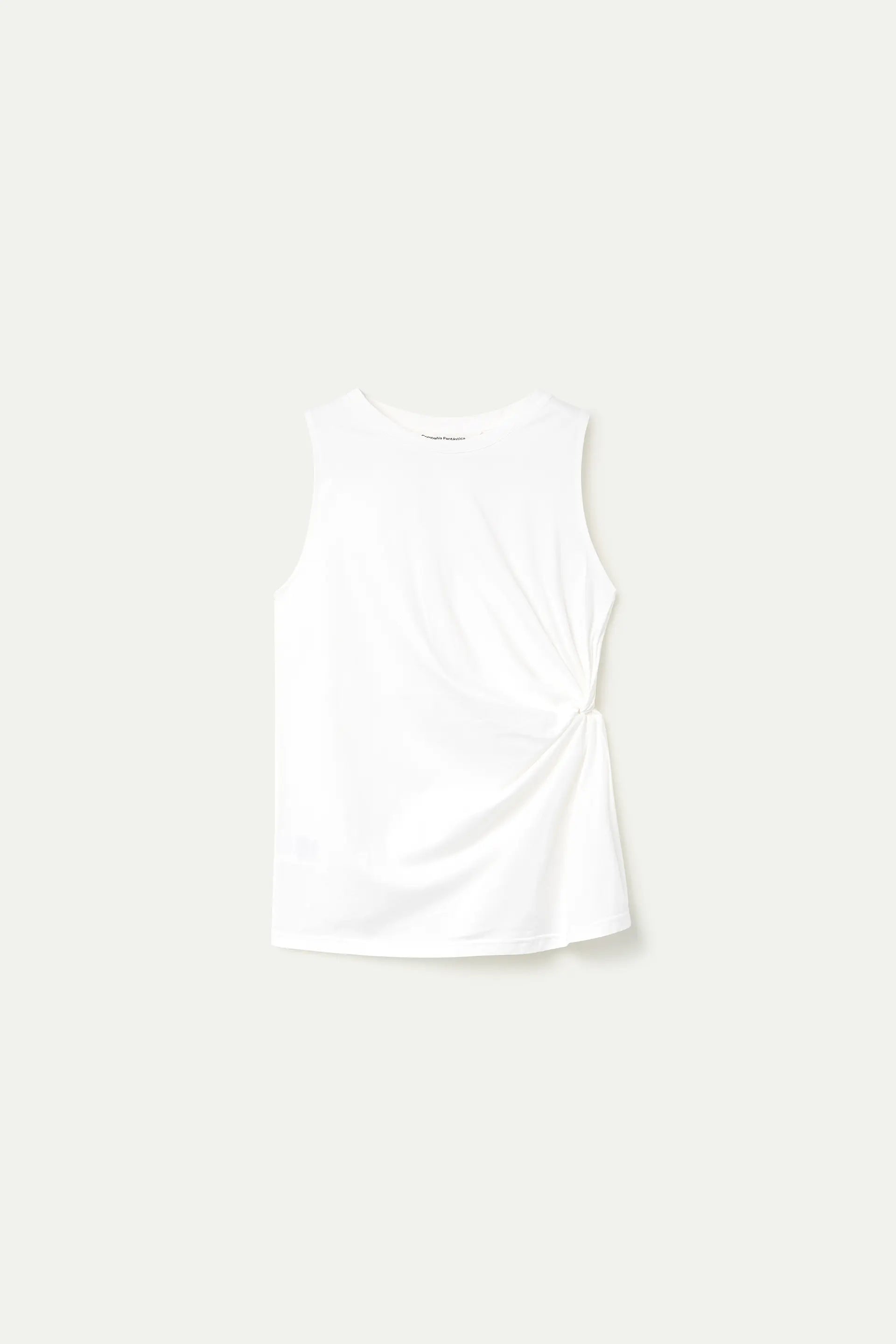 Camisa de tejido 100% algodón de color blanco. Cuello redondo y sin mangas. Detalle de drapeado lateral. La modelo mide 175 cm y lleva la talla S.