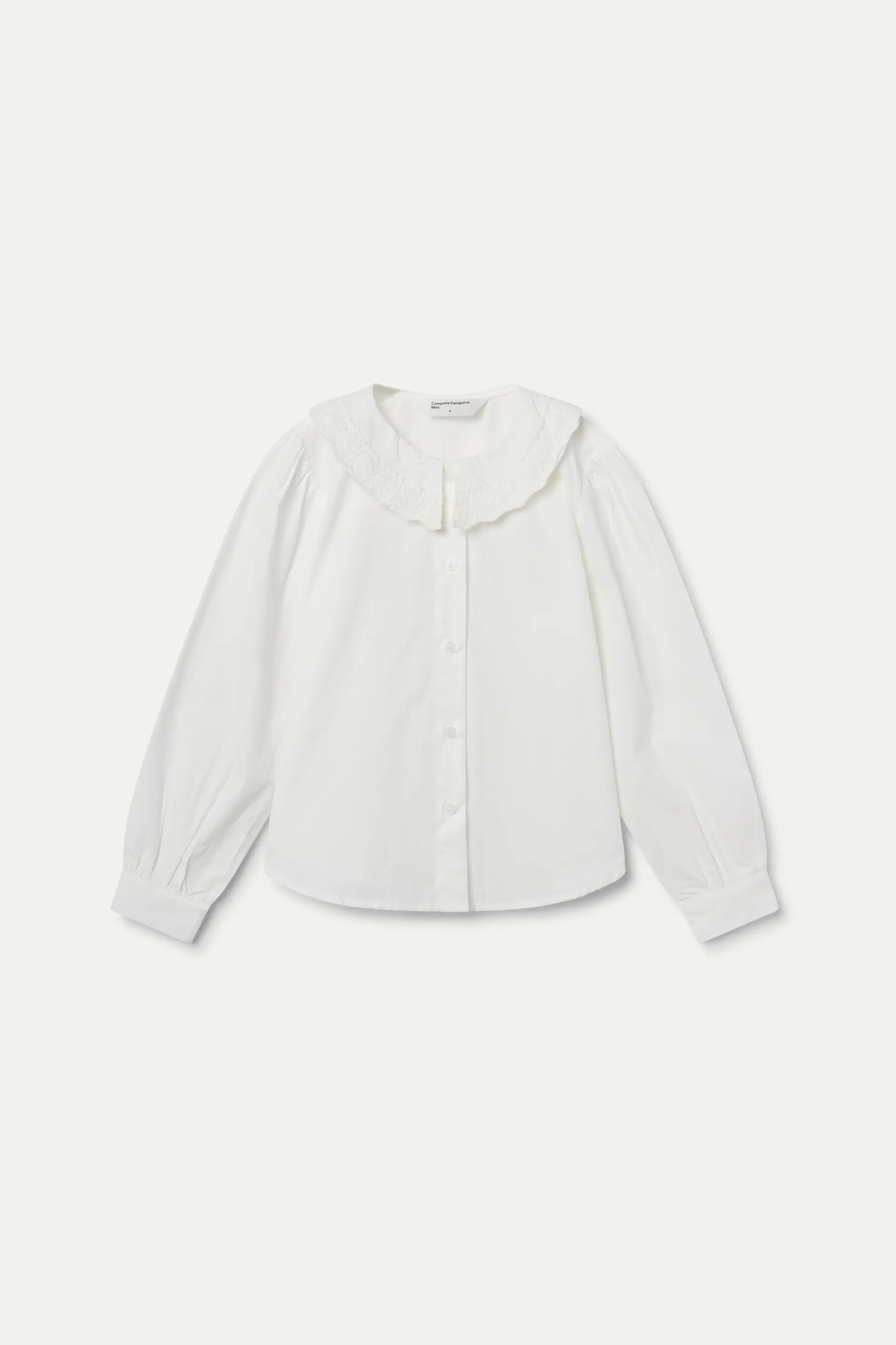 Camisa de color blanco. Cuello redondo separado en dos piezas al frente con bordado de encaje. Manga larga ligeramente abullonada terminada en puño con botón. Cierre frontal con botones de color blanco.