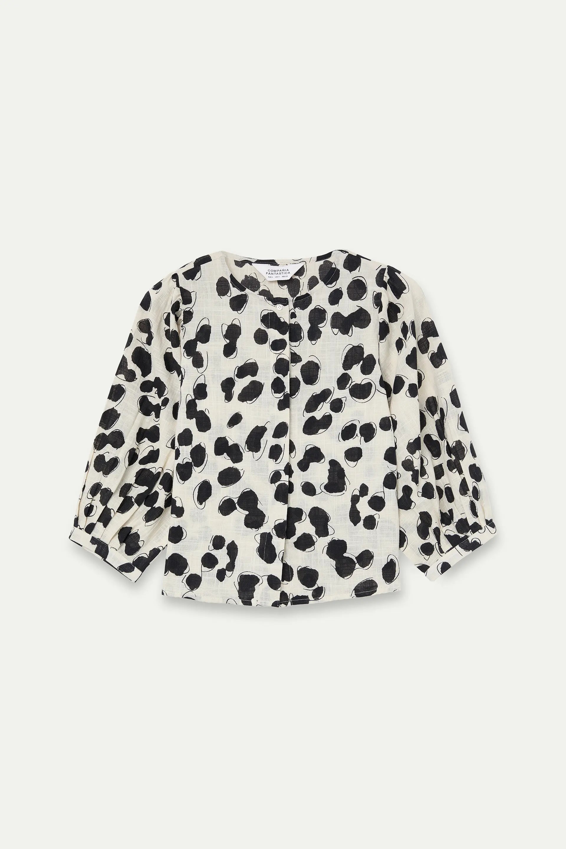 Camisa de tejido 100% algodón con estampado dalmatian. Cuello redondo y manga 3/4 ligeramente abullonada. Cierre frontal con botones ocultos. La modelo mide 175 cm y lleva la talla S.