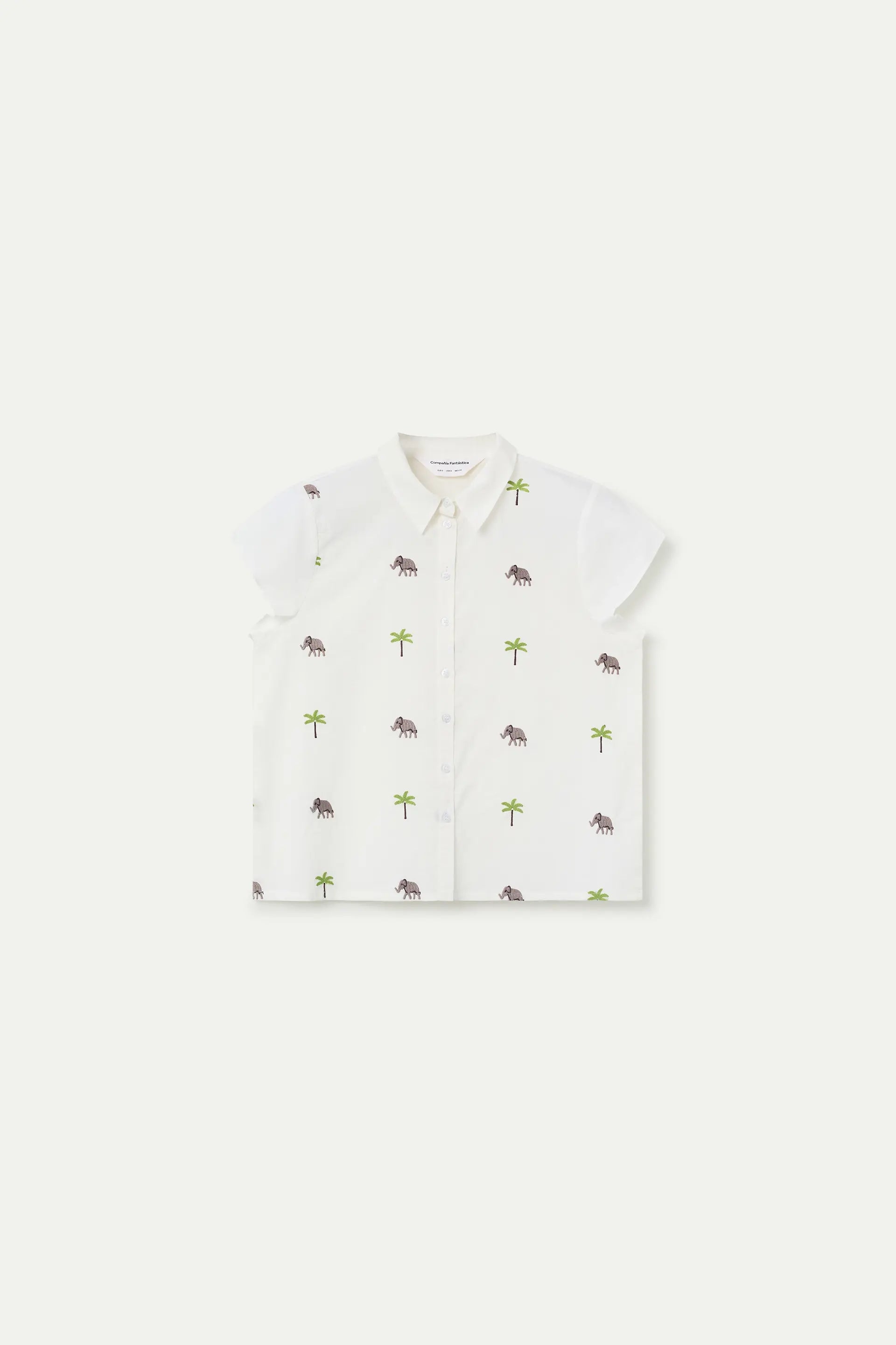 Camisa de tejido 100% algodón con estampado de elefante y palmera. Cuello solapa y manga corta. Cierre frontal con botones de color blanco. La modelo mide 177 cm y lleva la talla S.