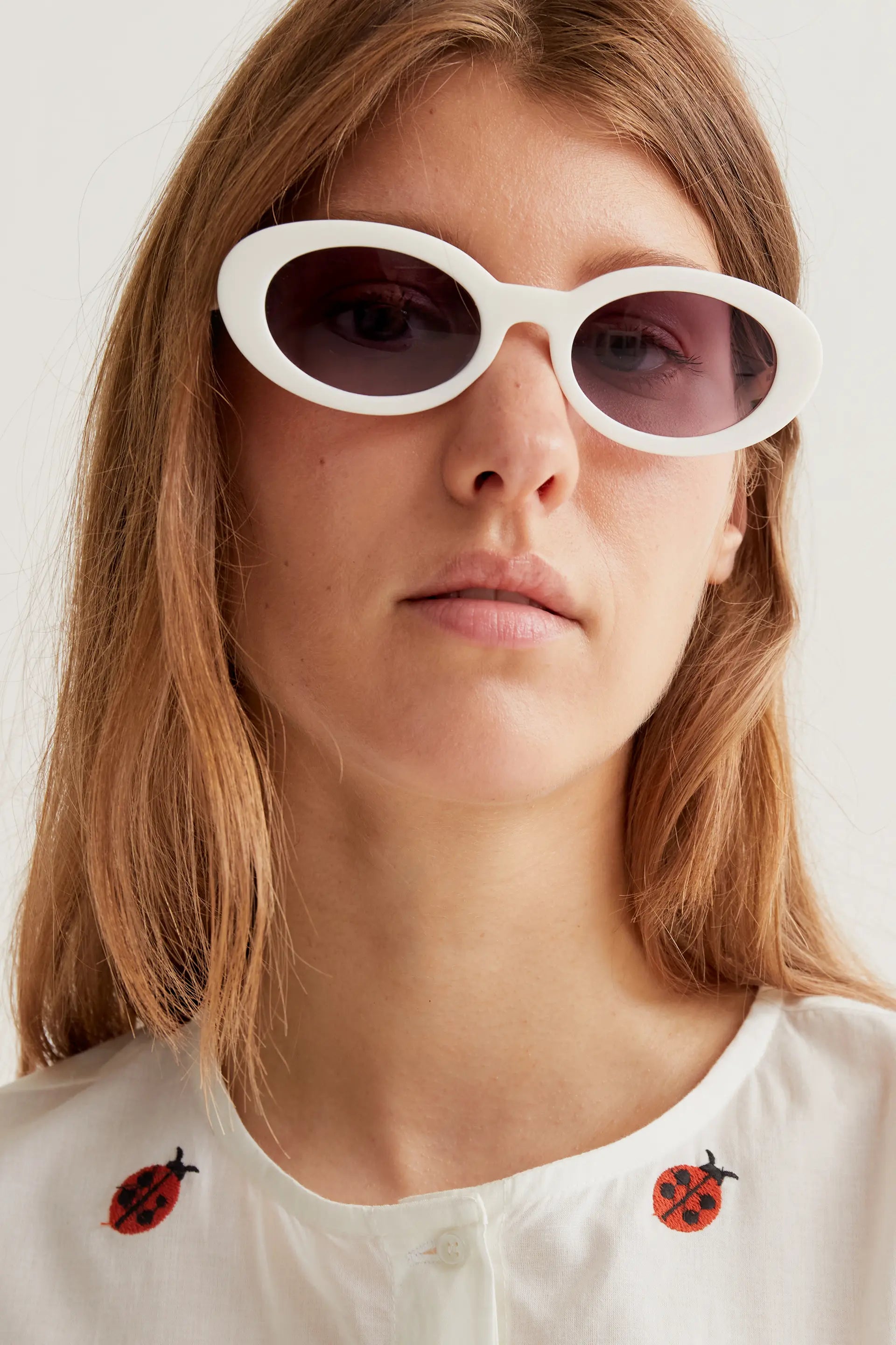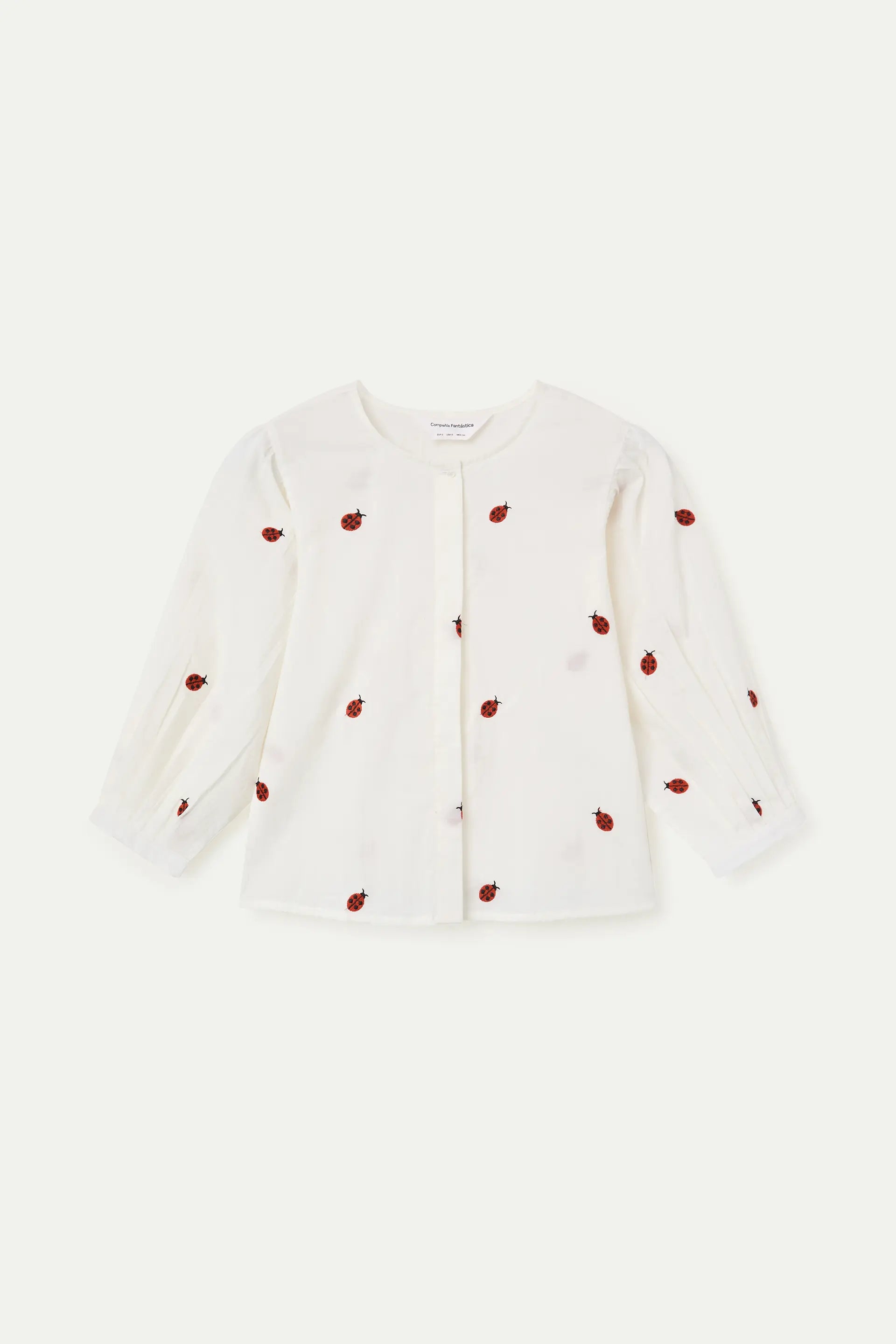 Camisa de tejido 100% algodón de color blanco con estamado ladybugs. Cuello redondo y manga larga ligeramente abullonada. Cierre frontal con botones de color blanco. LA modelo mide 177 cm y lleva la talla S.