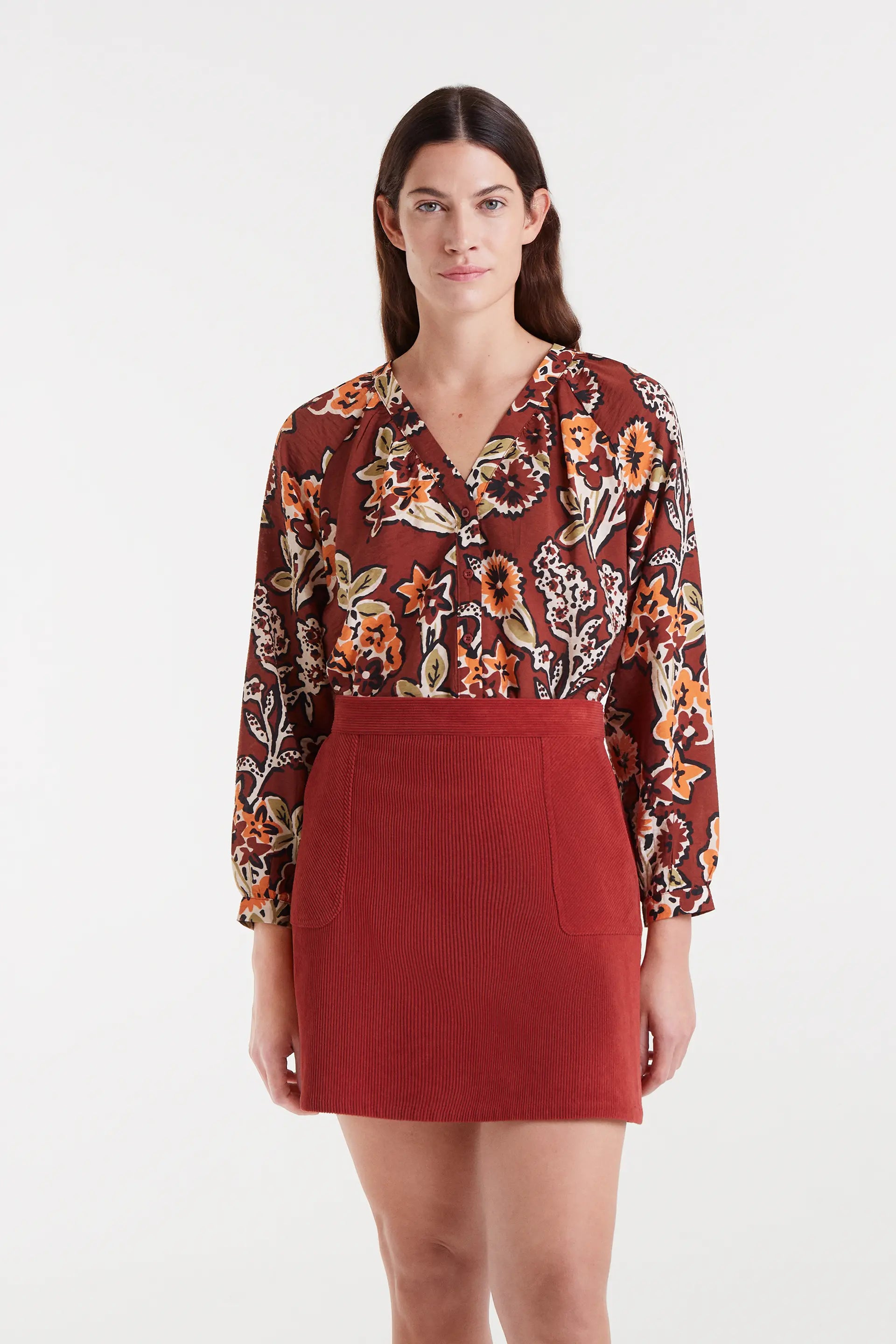 Camisa de crepé ligero con estampado Daisy. Cuello pico y manga larga con abertura elástica. Cierre frontal con botones de color marrón. La modelo mide 177 cm y lleva la talla S.