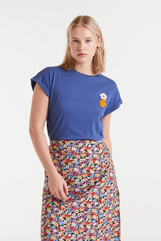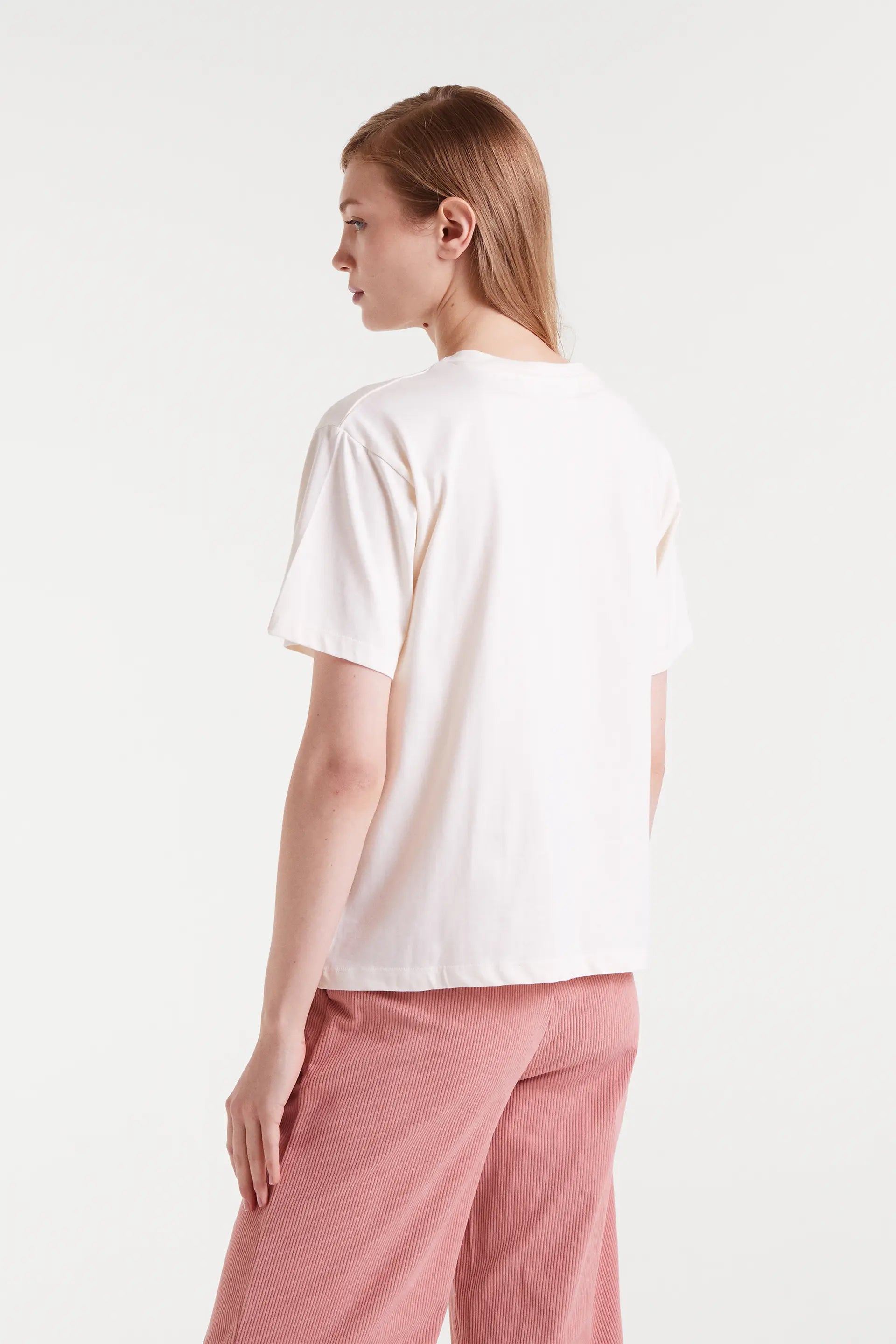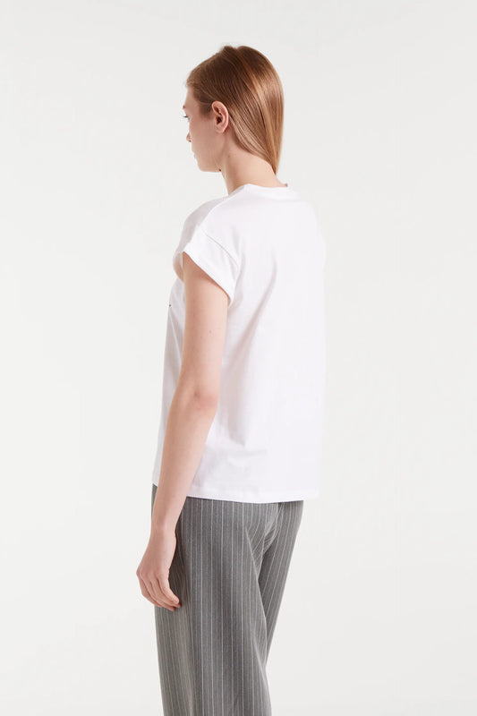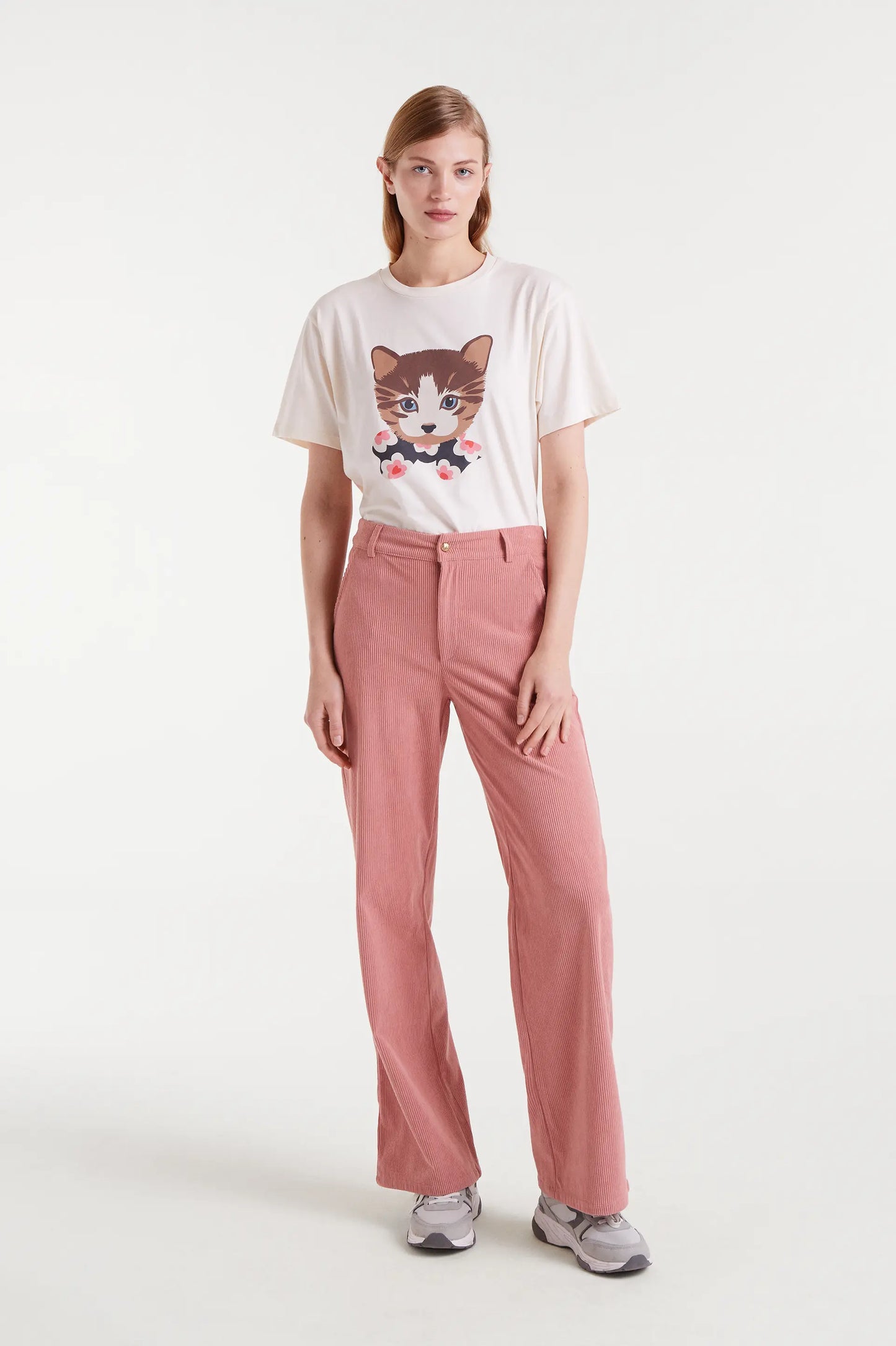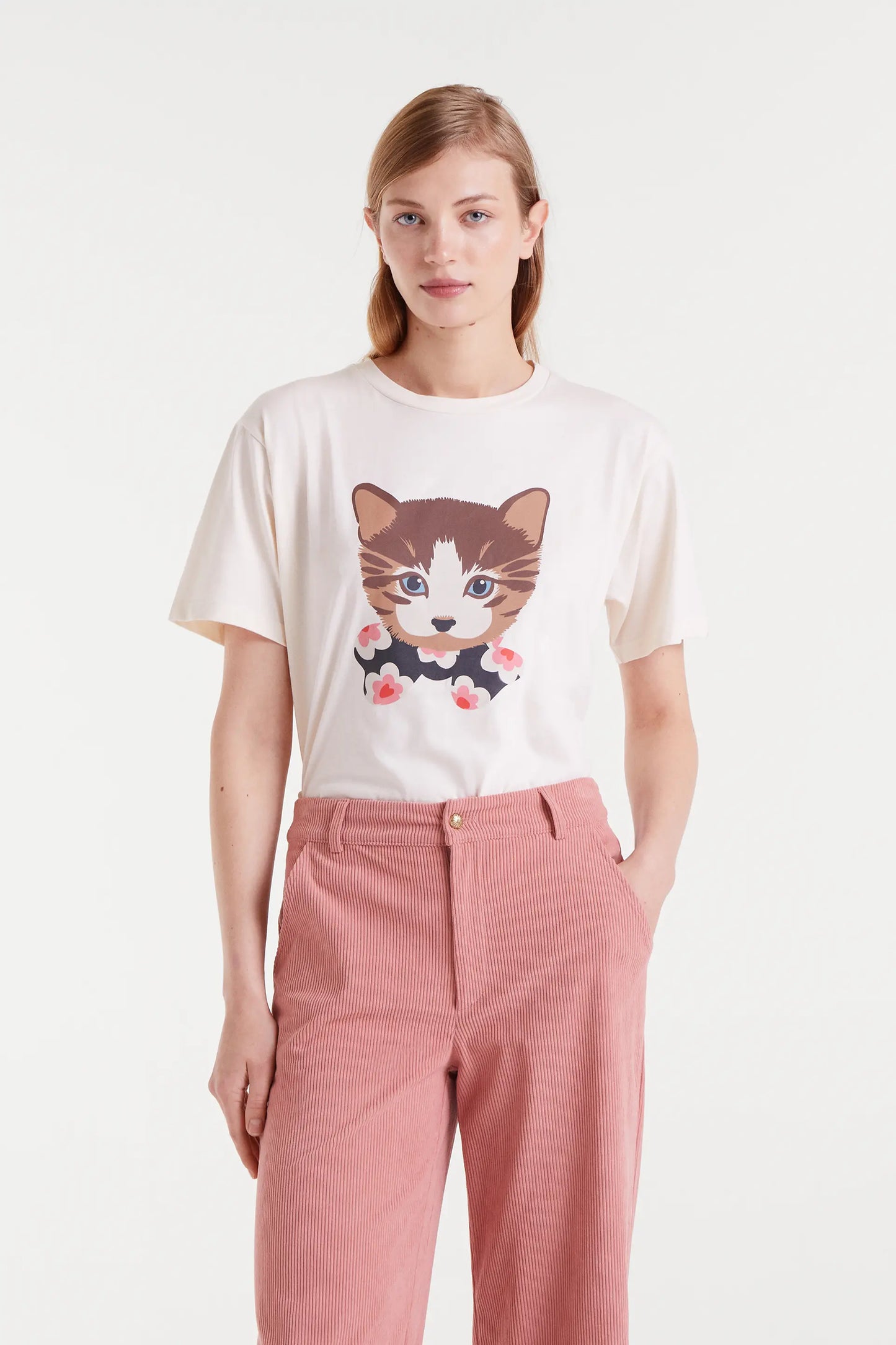 Camiseta con tejido 100% algodón de color blanco con estampado de gato. Cuello redondo y manga corta. La modelo mide 179 cm y lleva la talla S.