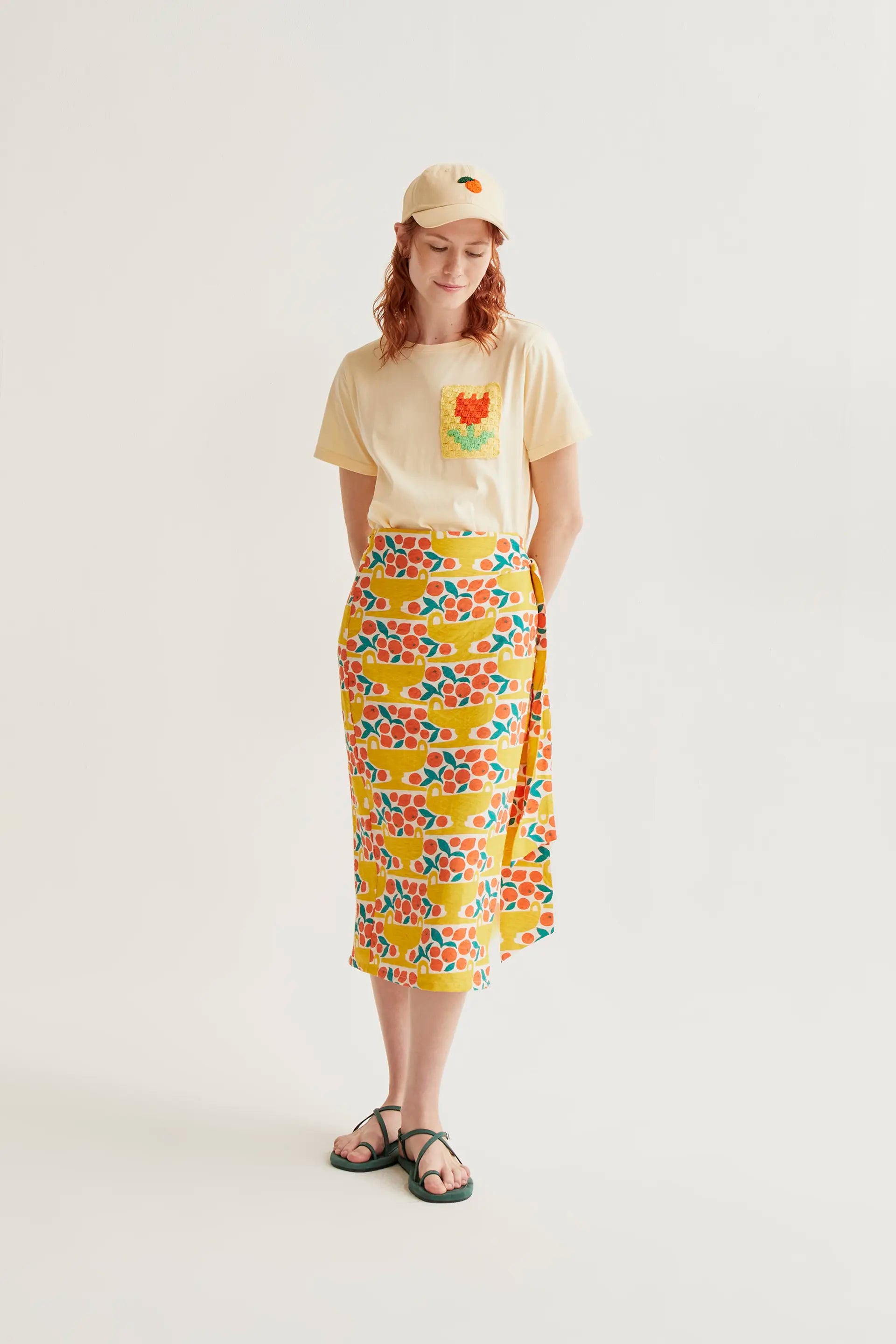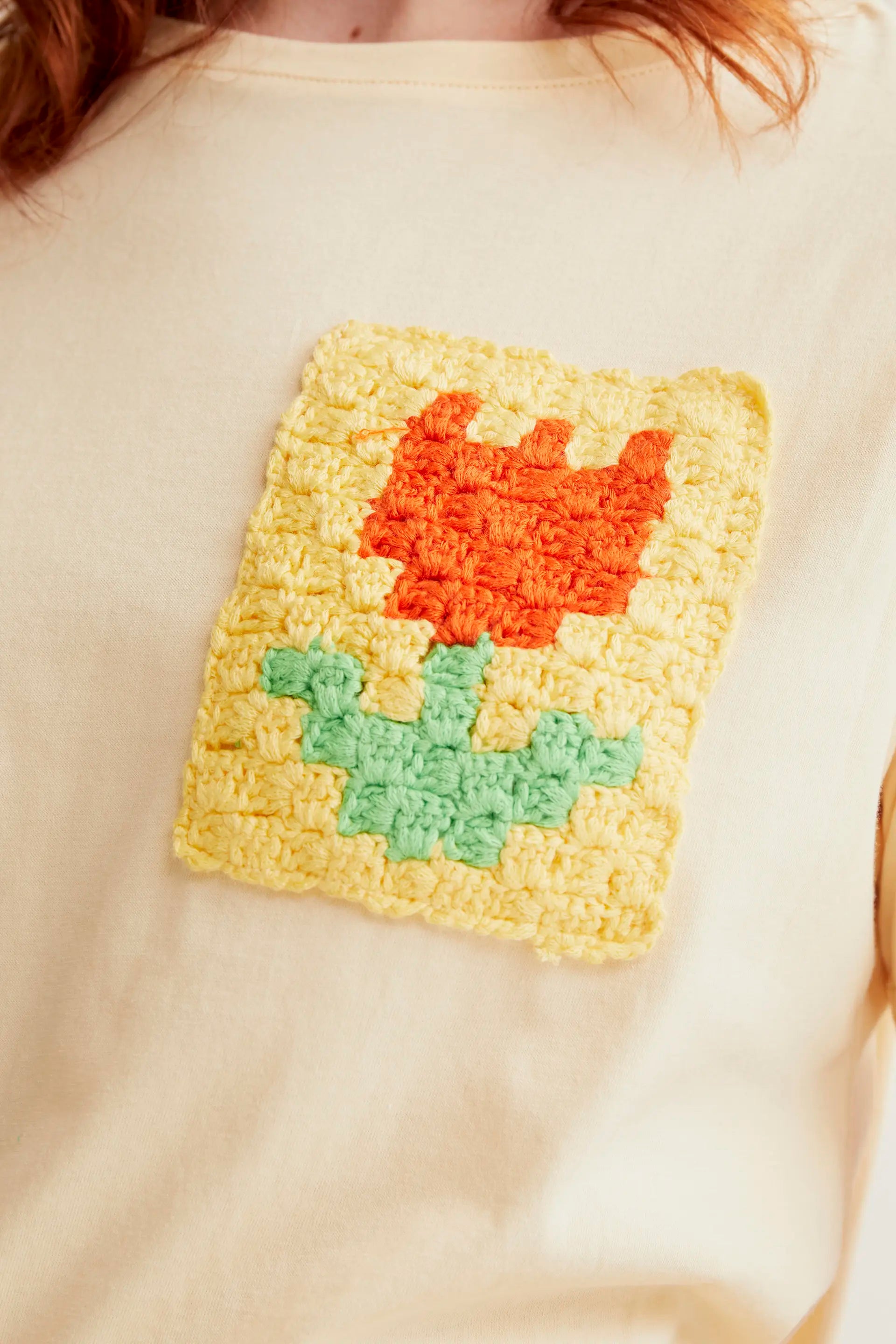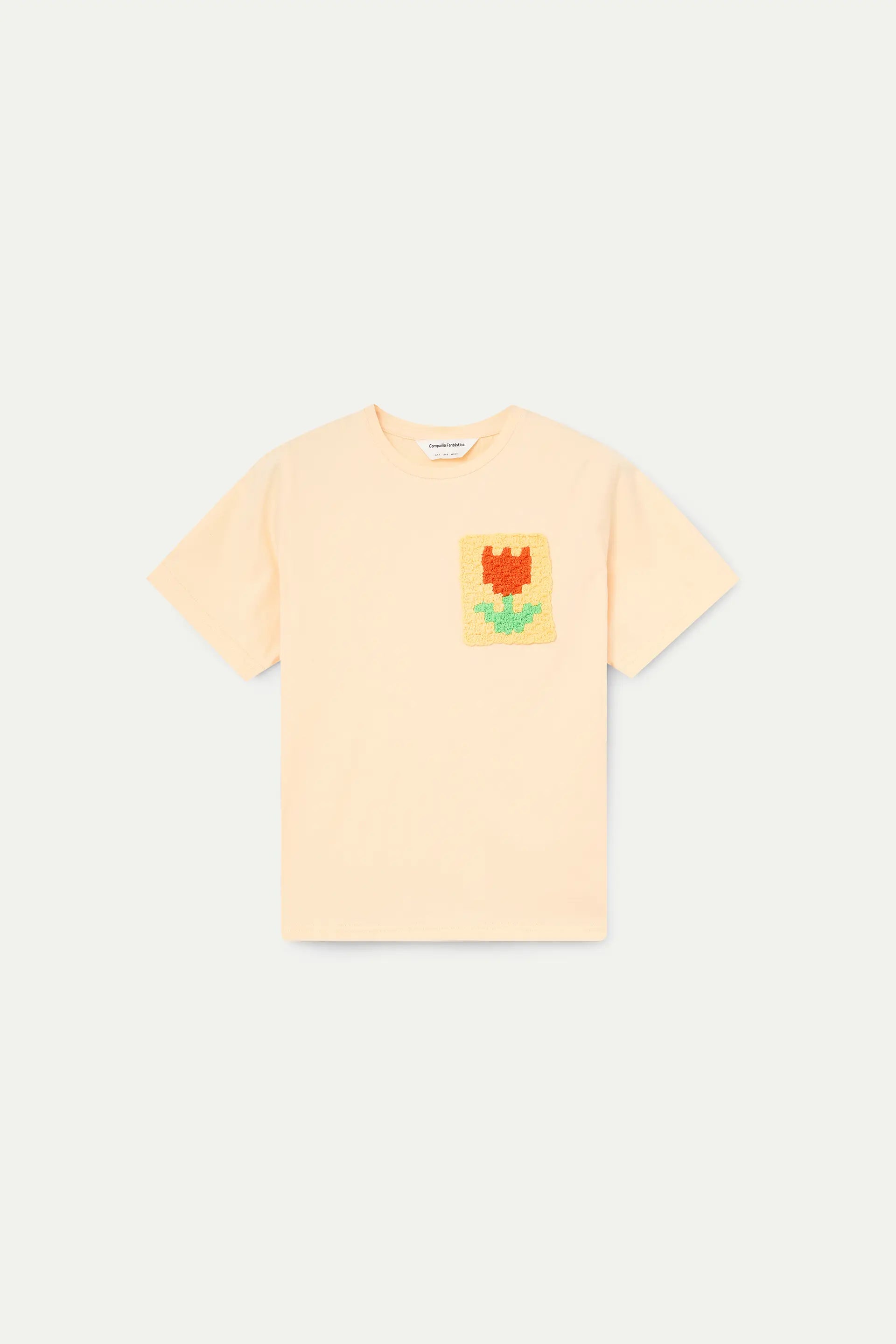 Camiseta de tejido 100% algodón de color amarillo claro. Cuello redondo y manga corta. Detalle bordado de tulipán. La modelo mide 175 cm y lleva la talla S.