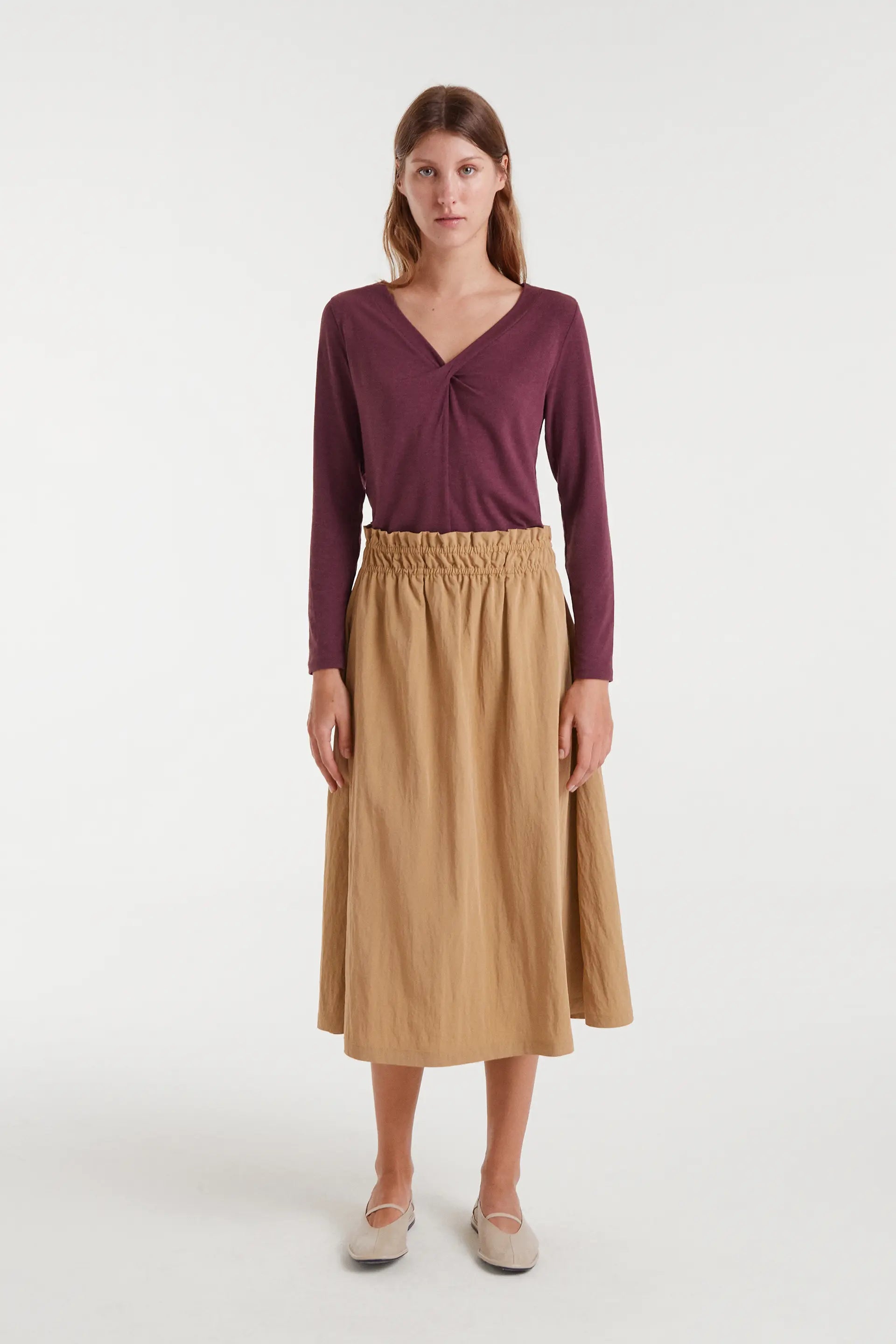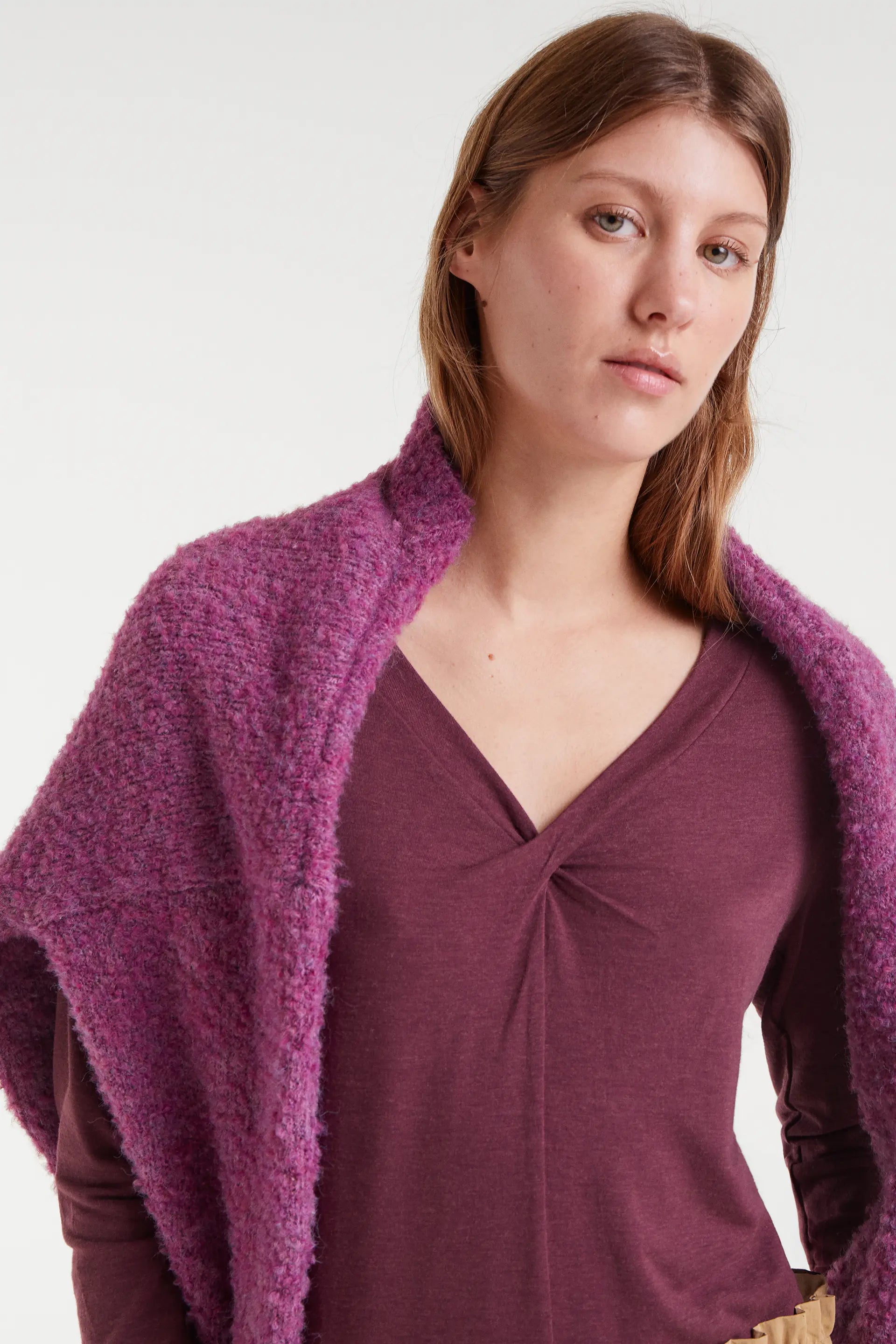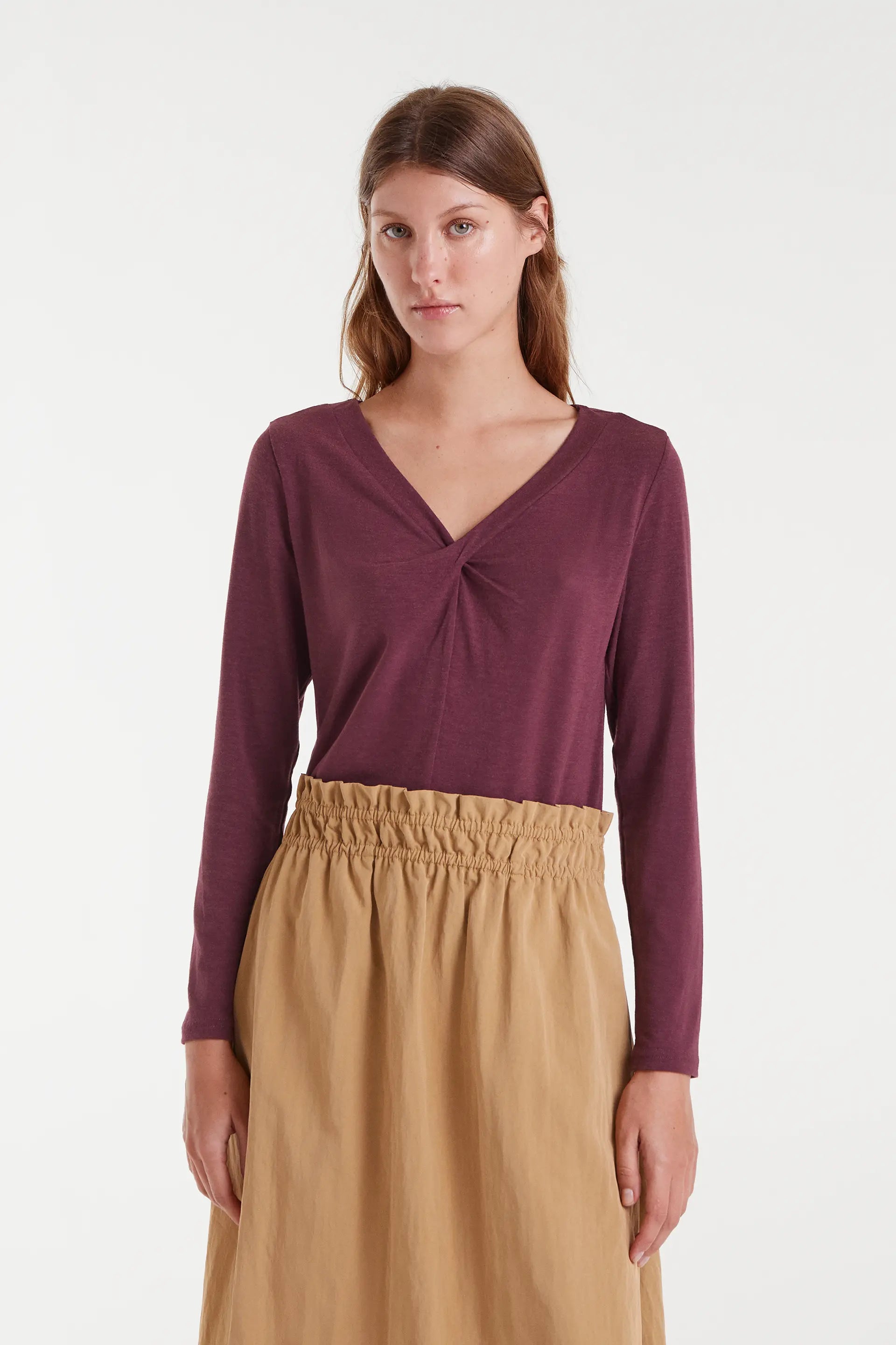 Camiseta de color berenjena. Con cuello pico asimétrico anudado. Manga larga. La modelo mide 177 cm y lleva la talla S.