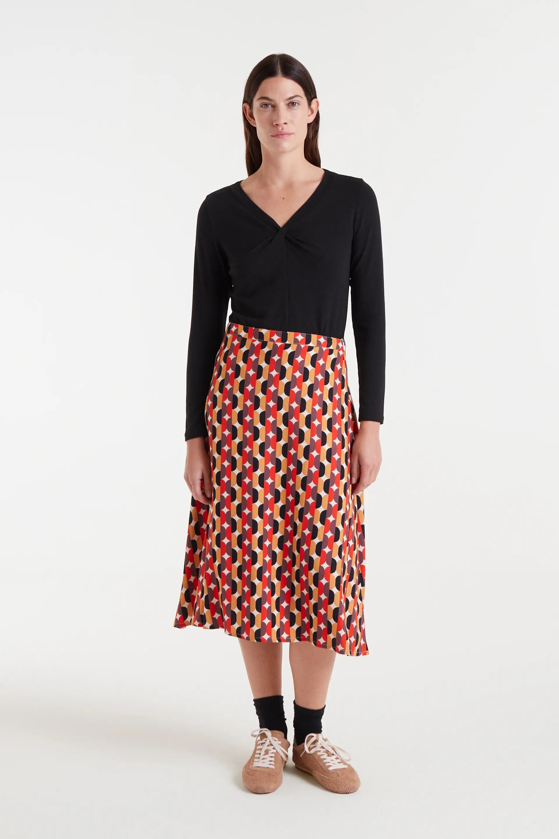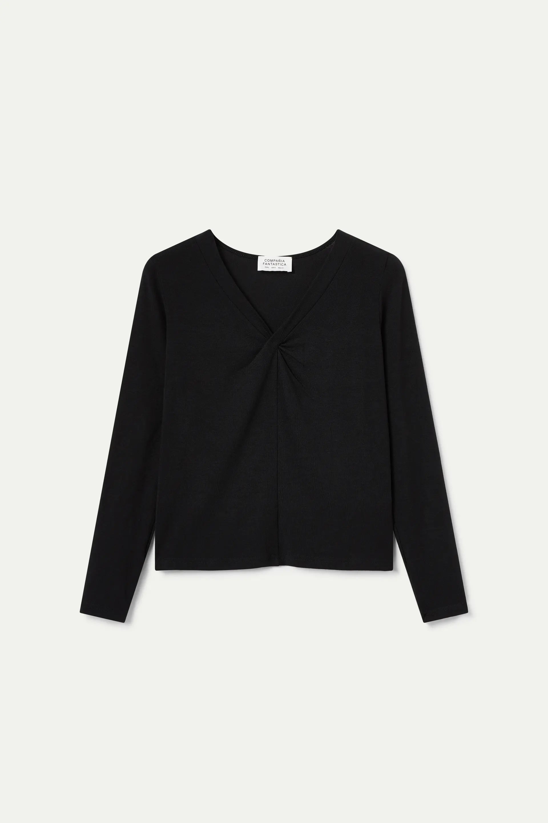 Camiseta de color negro. Con cuello pico asimétrico anudado. Manga larga. La modelo mide 177 cm y lleva la talla S.
