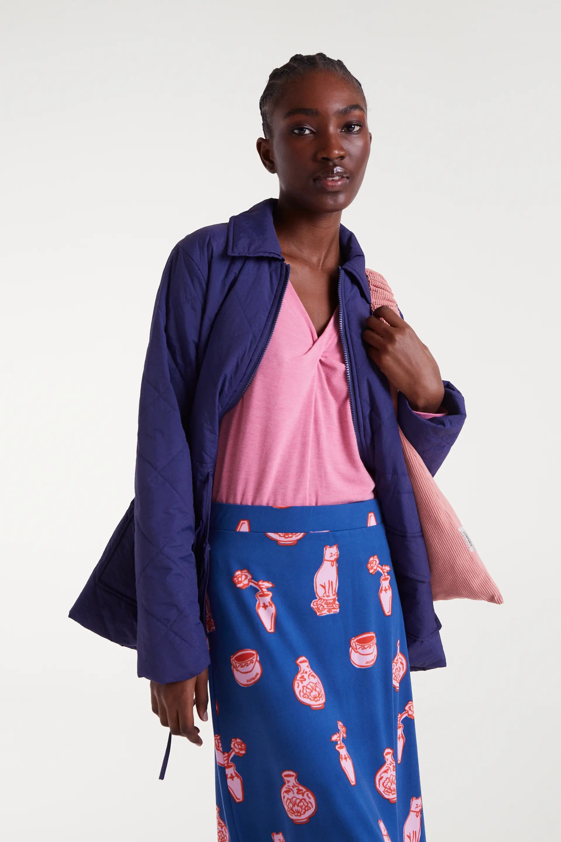 Camiseta de color rosa. Con cuello pico asimétrico anudado. Manga larga. La modelo mide 177 cm y lleva la talla S.