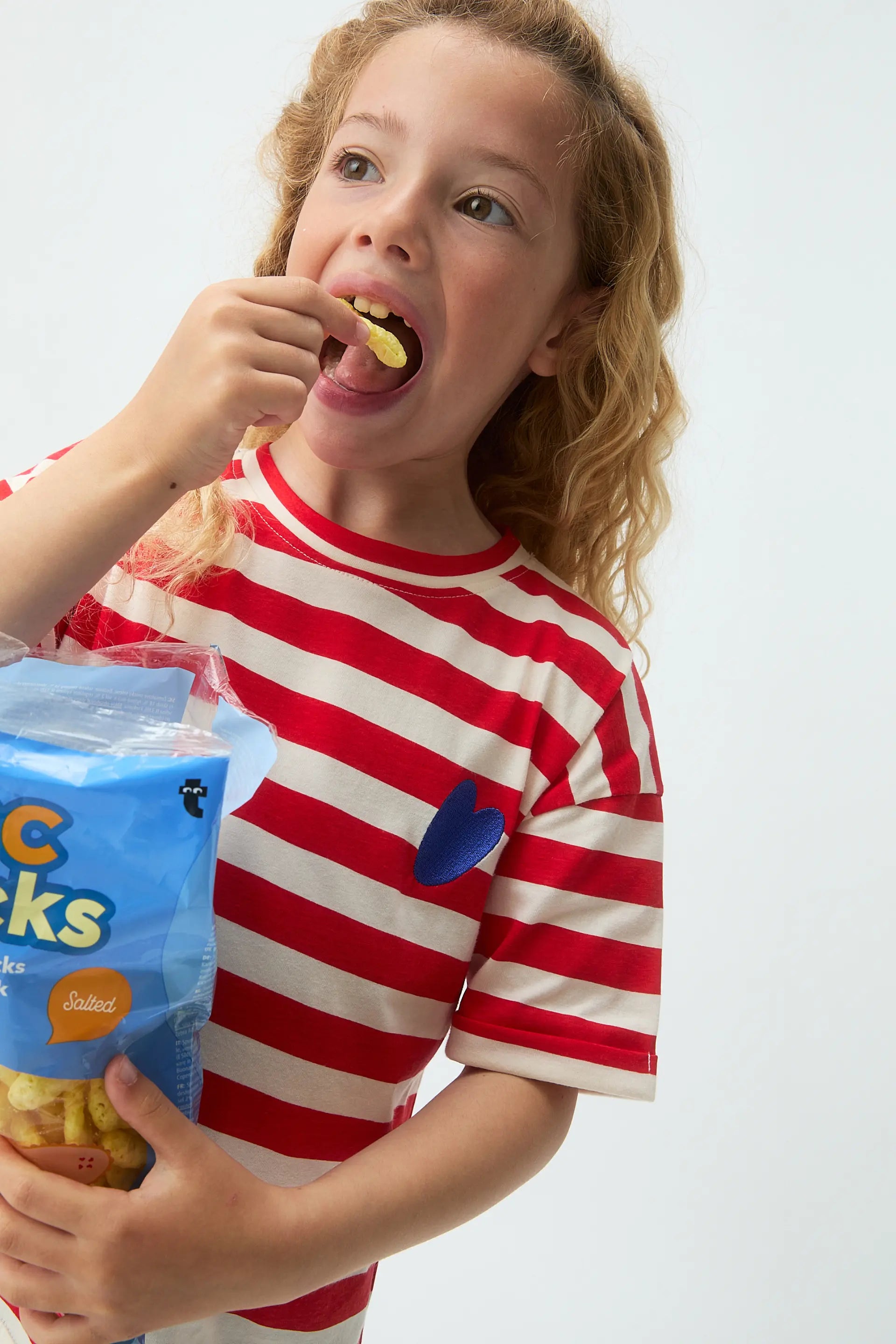 Camiseta de niña de tejido 100% algodón con estampado de rayas blanco y rojo con bordado de corazón de color azul. Cuello redondo y manga corta. La modelo mide 126 cm y lleva la talla 8-9 años.
