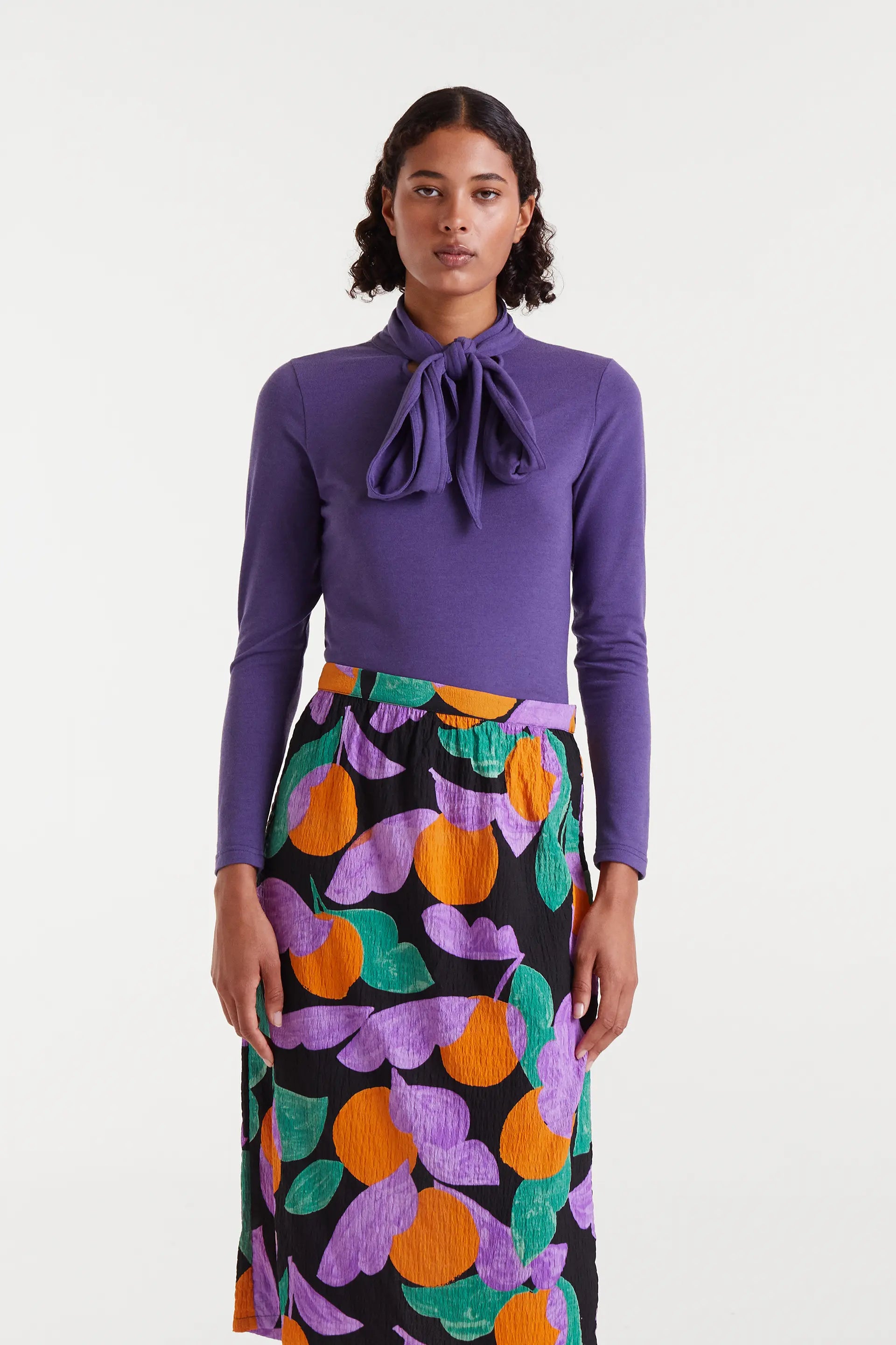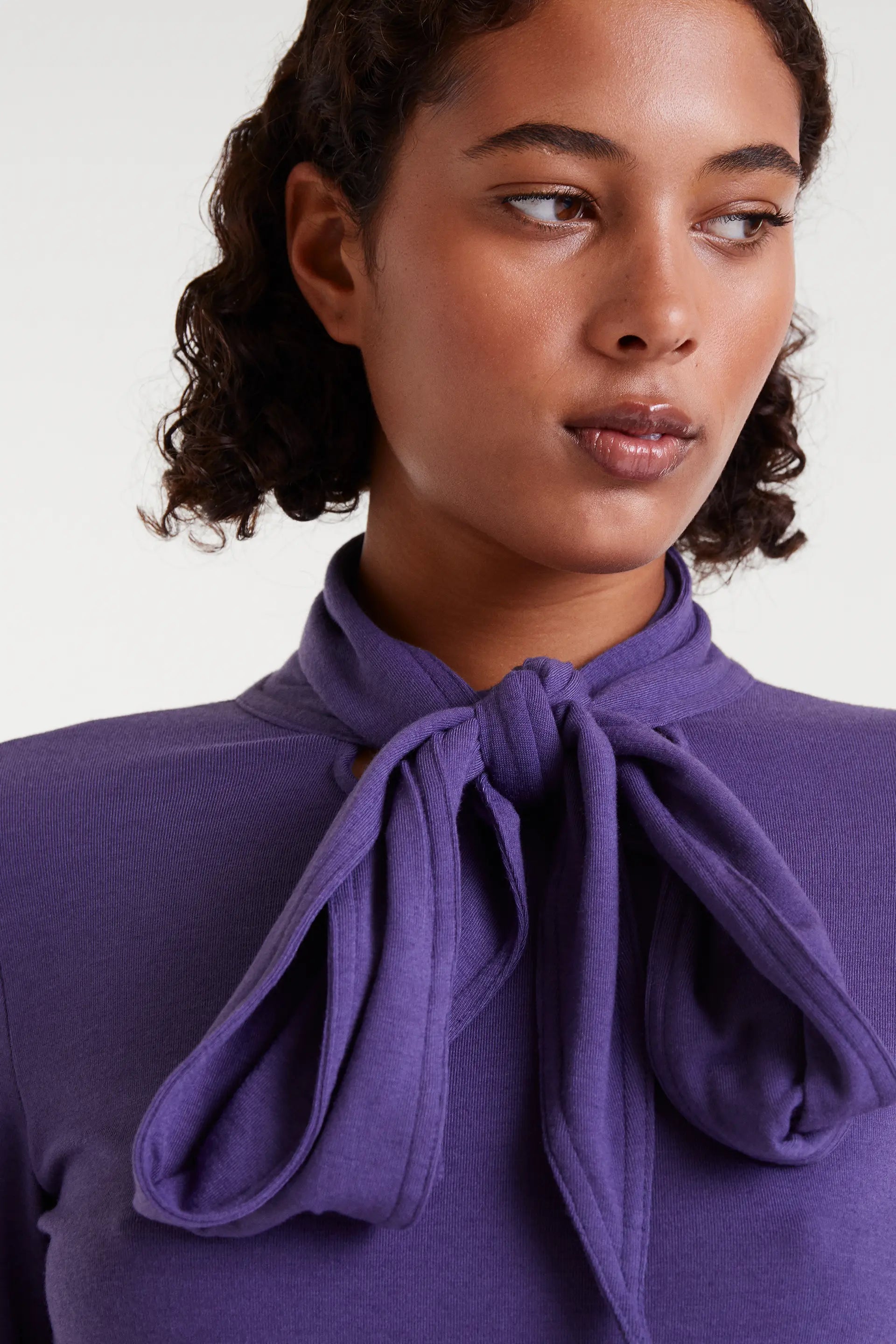 Camiseta con tejido punto ligero de color morado. Cuello alto con lazada y manga larga. La modelo mide 175 cm y lleva la talla S.
